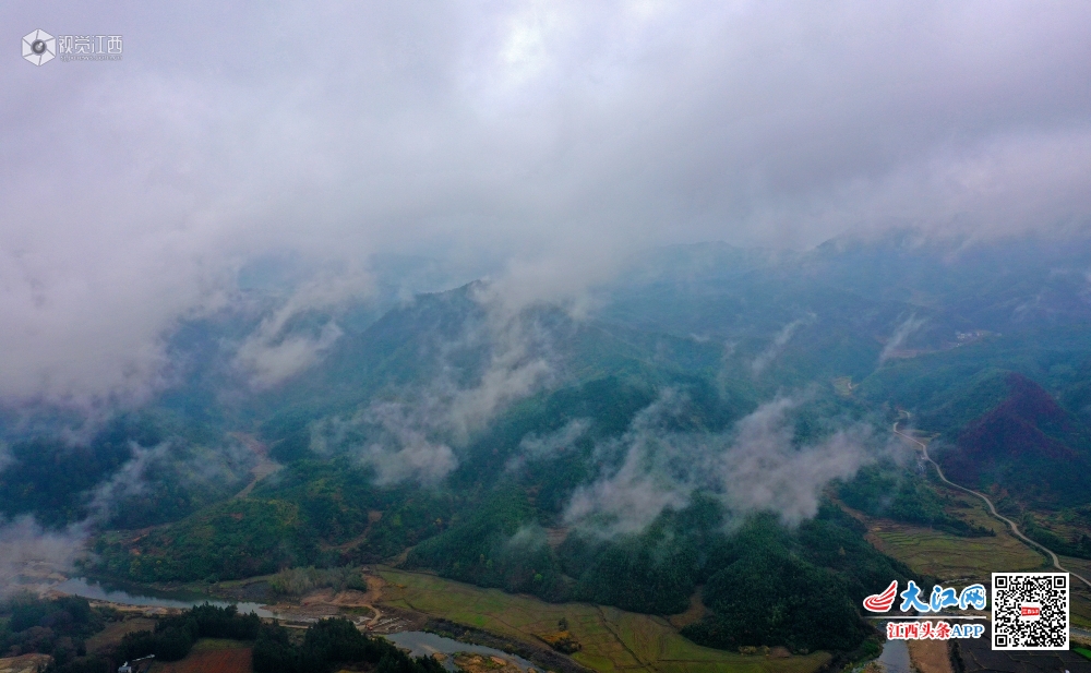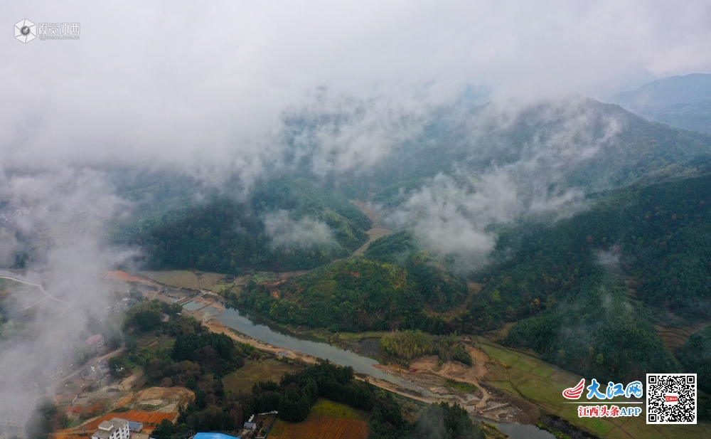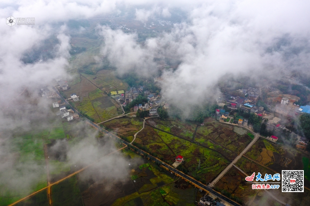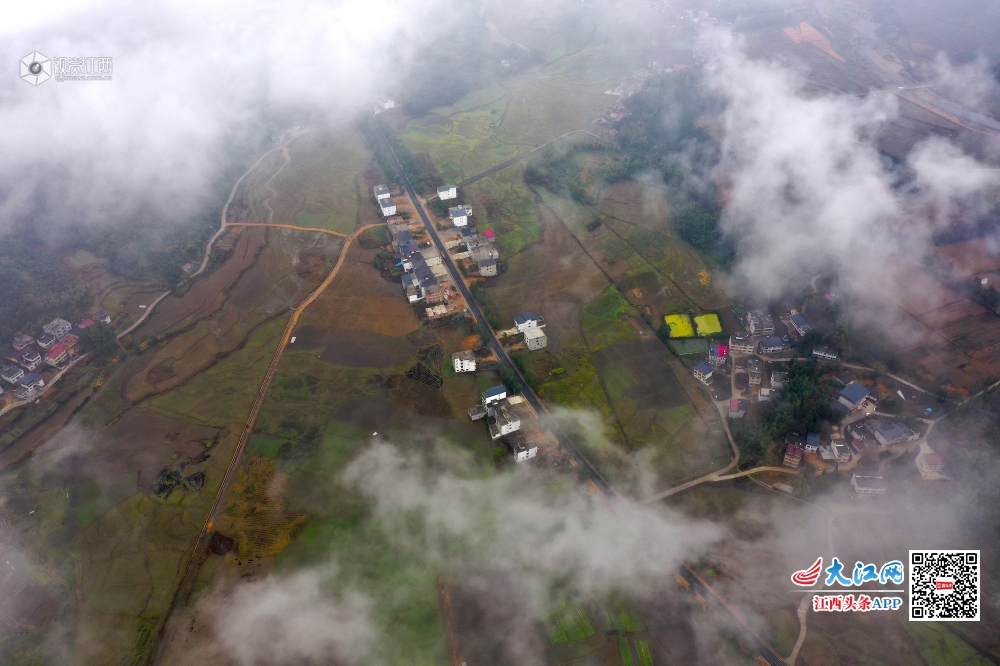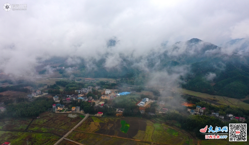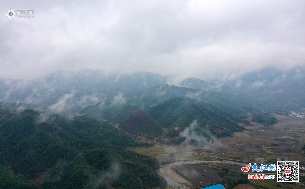 2019年11月28日,航拍江西省上饶市铅山县紫溪乡,升腾的云雾和连绵的群山形成一幅美丽的画卷。当天铅山县雨水暂歇不少乡村云雾缭绕如梦如幻宛如仙境。