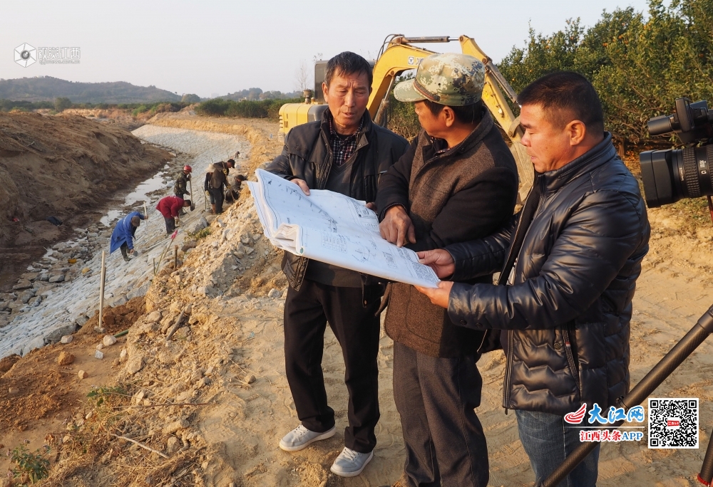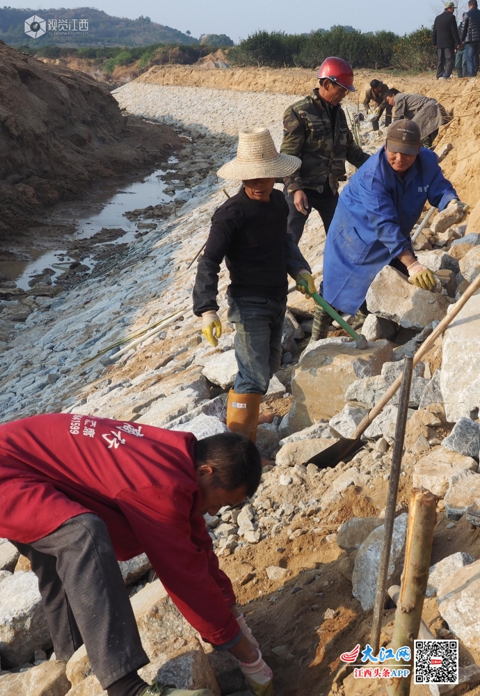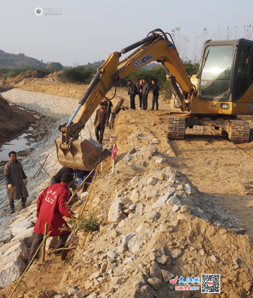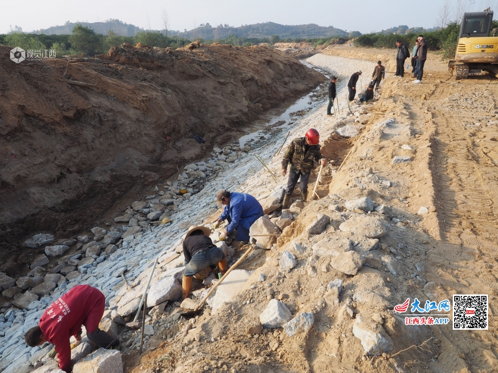 2019年12月3日,在江西省南丰县琴城镇水北村九剧水河堤修复施工现场,施工人员正在水利技术员指导下抓紧晴好天气修建河堤护坡,为灌溉、防洪作准备。