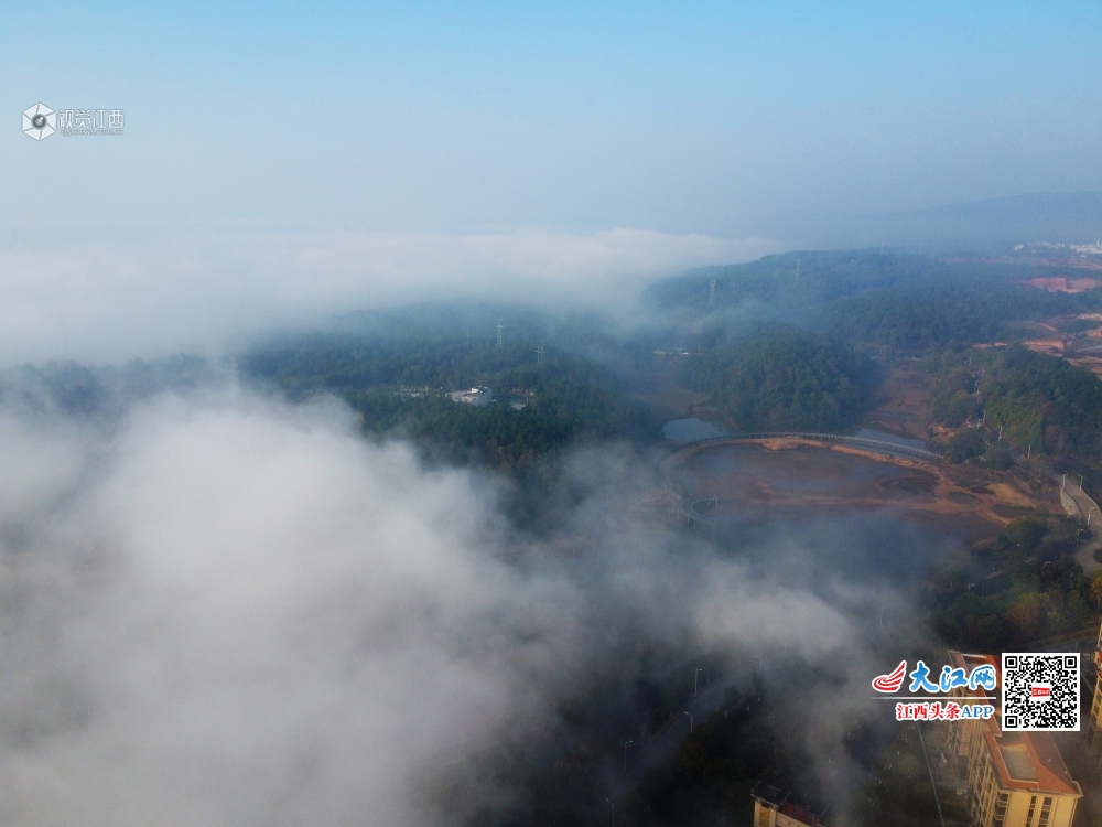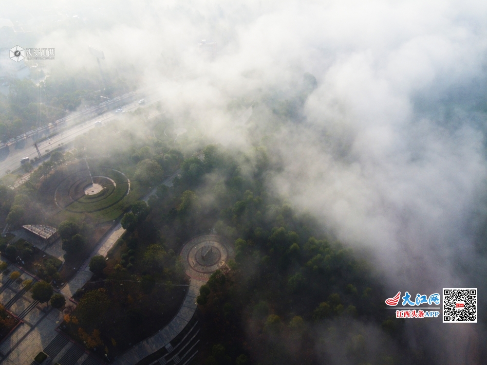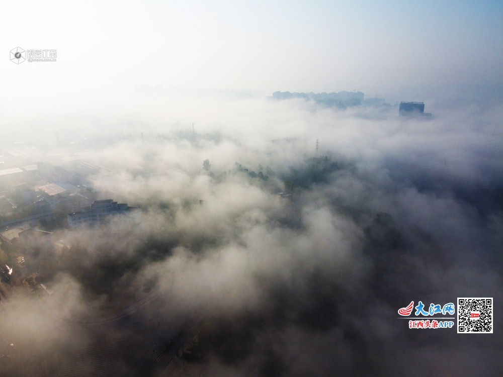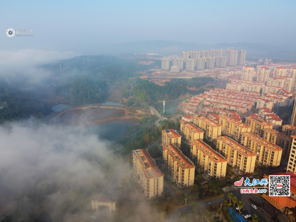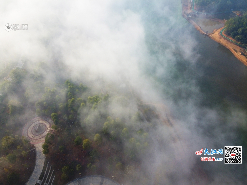 图为2019年12月3日,无人机俯瞰江西省吉安市泰和县城区,初冬时节,晨雾弥漫,山水园林、屋舍楼宇在雾中若隐若现,宛如仙境。
