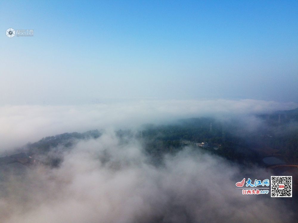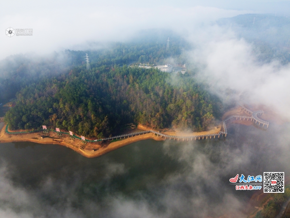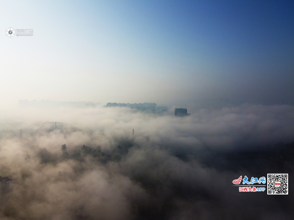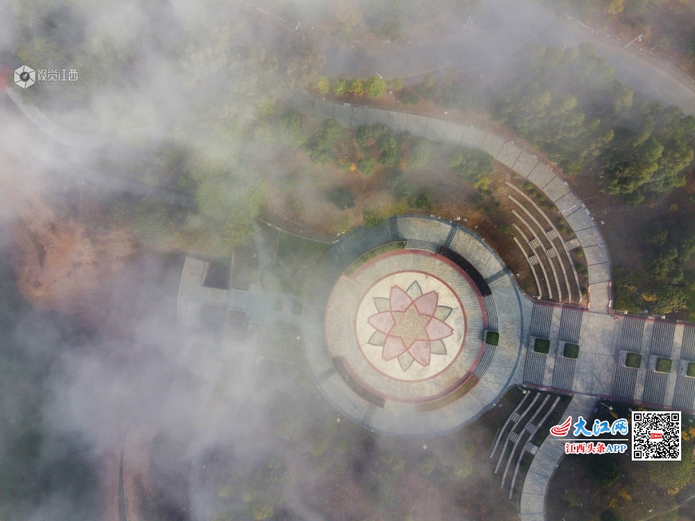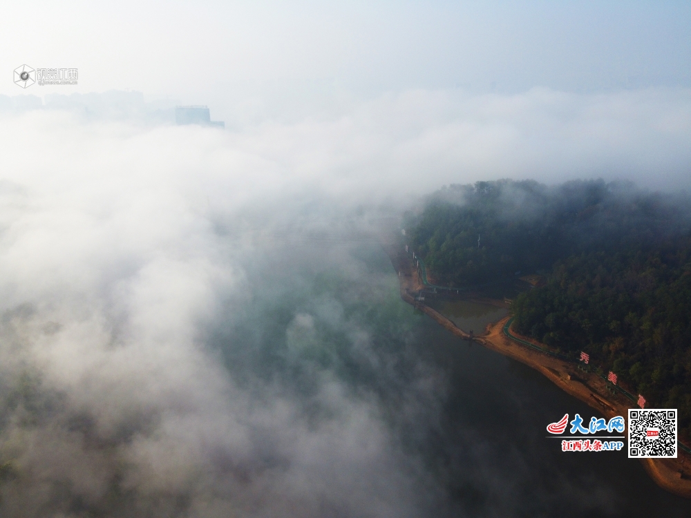 图为2019年12月3日,无人机俯瞰江西省吉安市泰和县城区,初冬时节,晨雾弥漫,山水园林、屋舍楼宇在雾中若隐若现,宛如仙境。