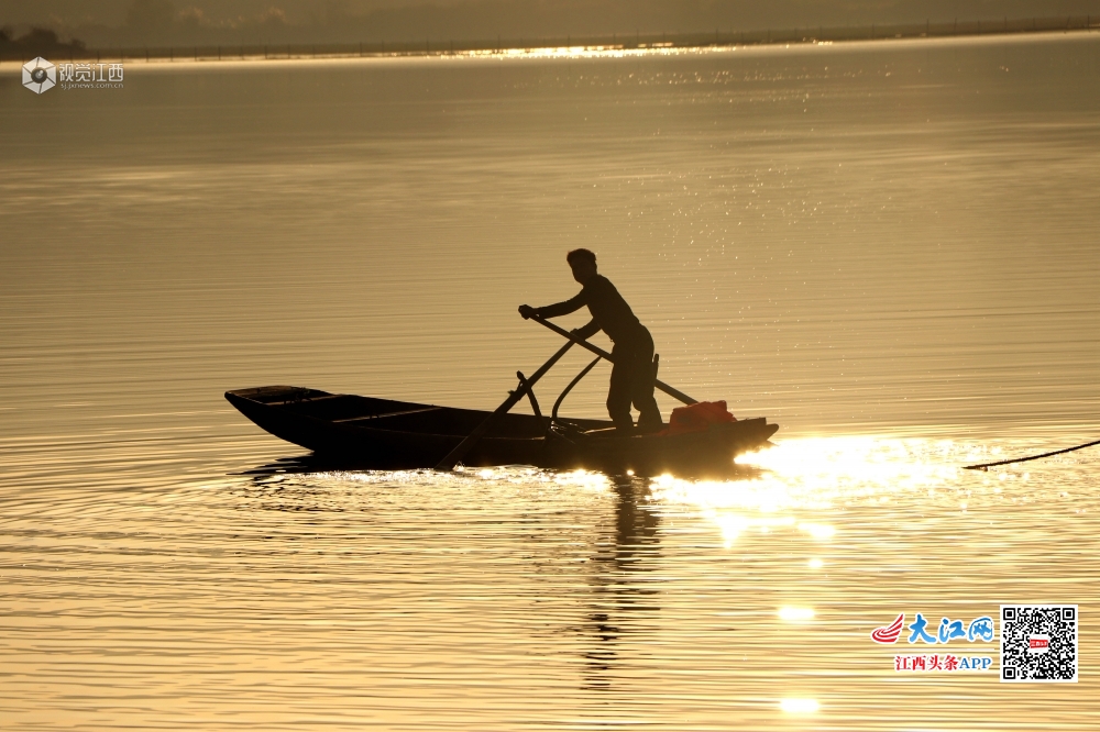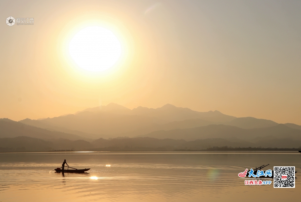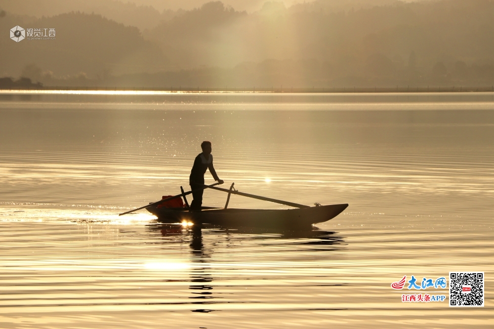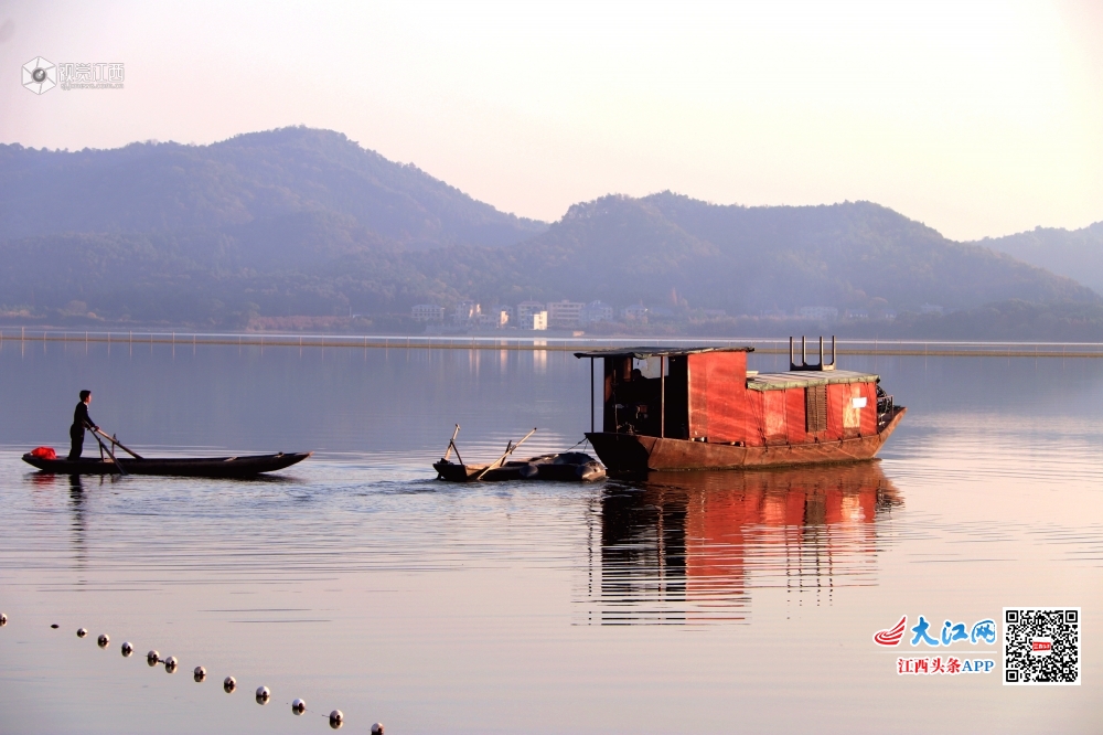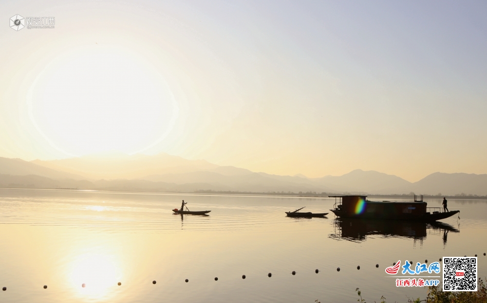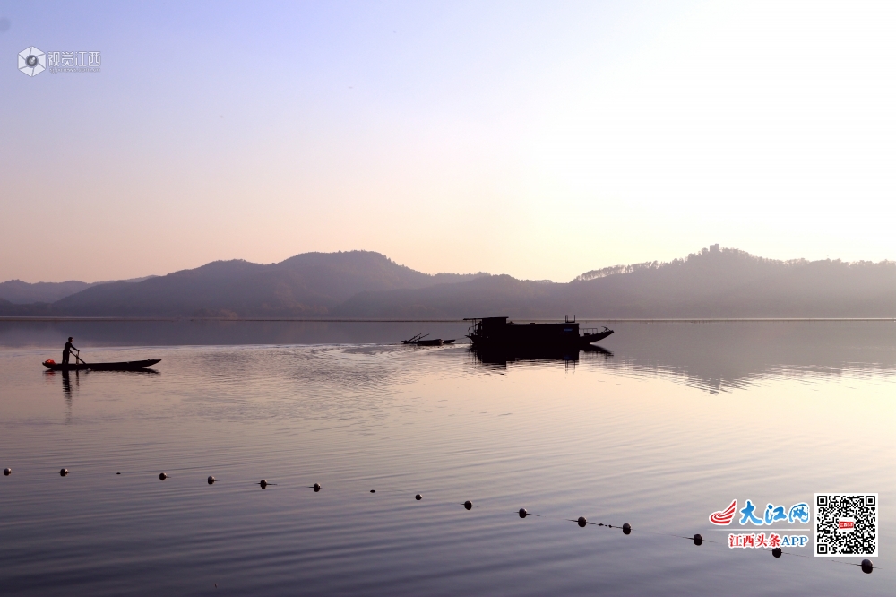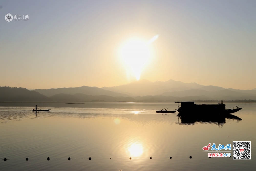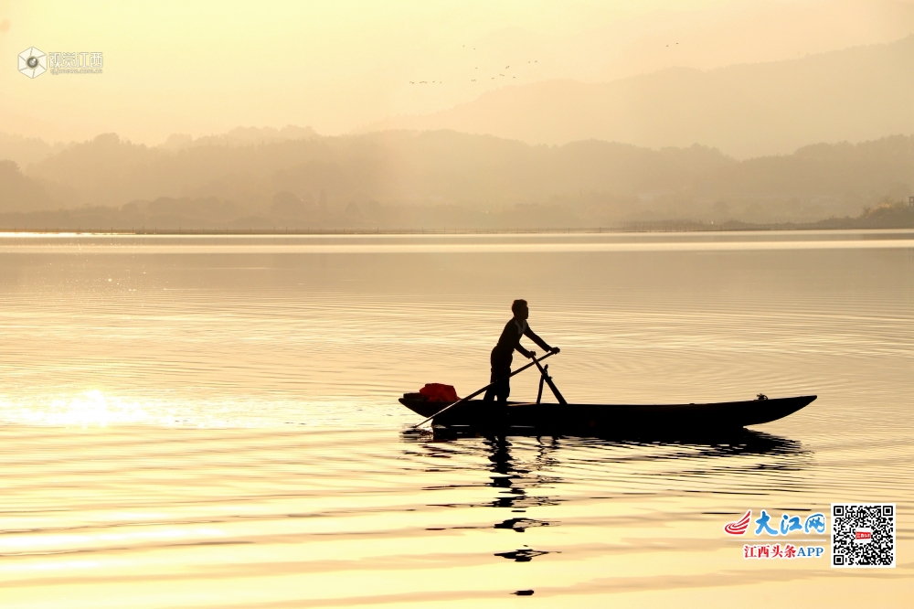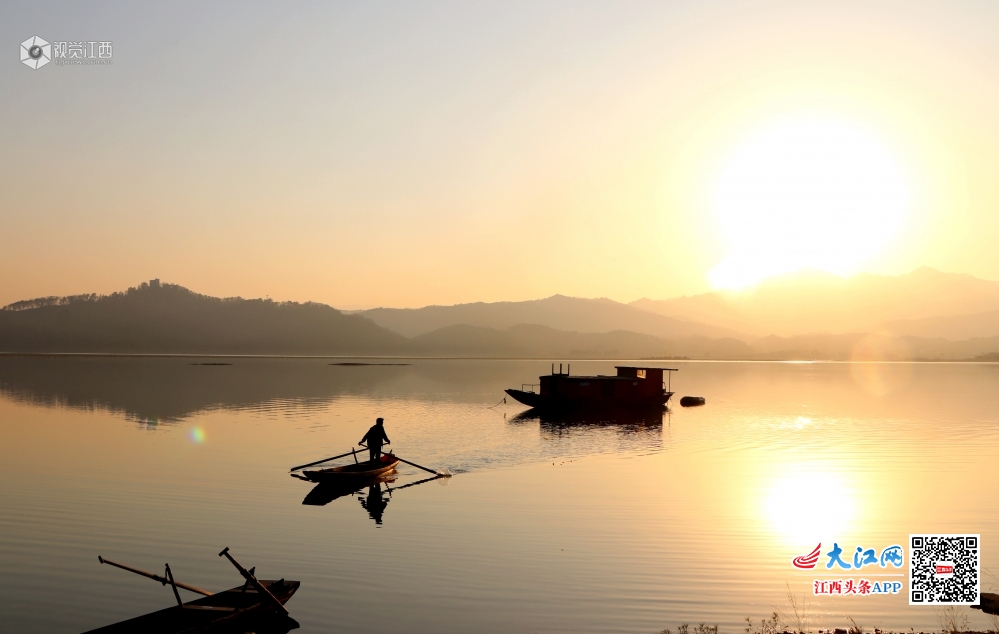 12月8日,大雪节气刚过,江西省新余市钤阳湖在夕阳的映衬下,光影交融自然、美丽而温馨,放眼望去,一叶渔船摇橹而归,与天际上渐变的淡蓝色与泛黄色交汇融合,犹如调色师调出一幅幅水上渔家幸福生活的和谐画卷。
