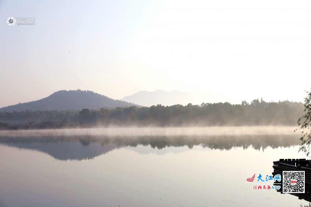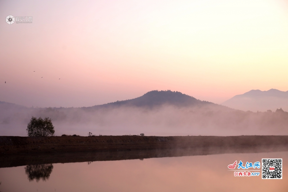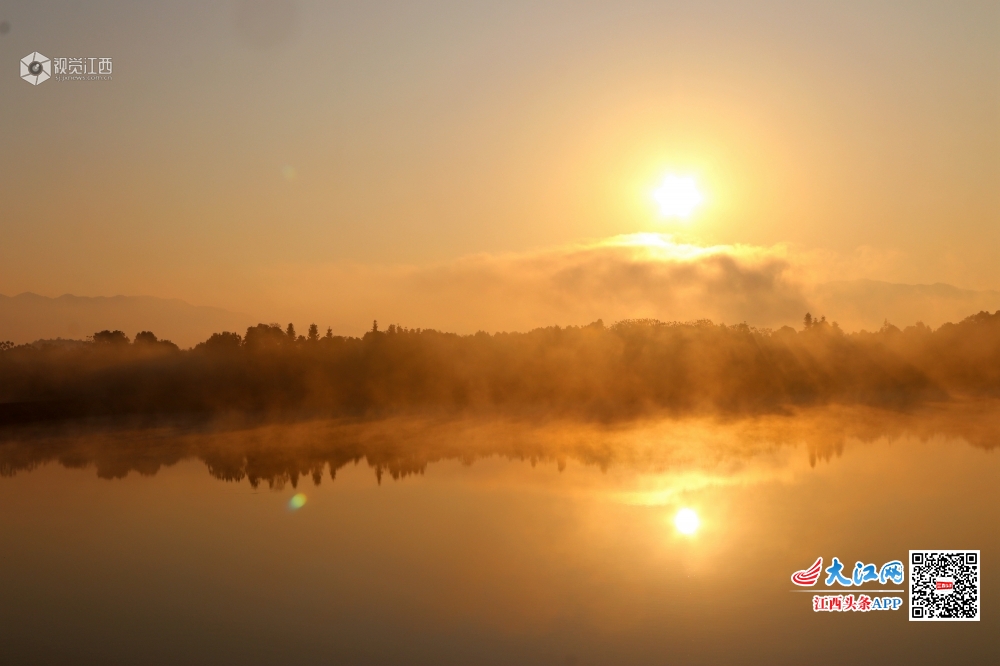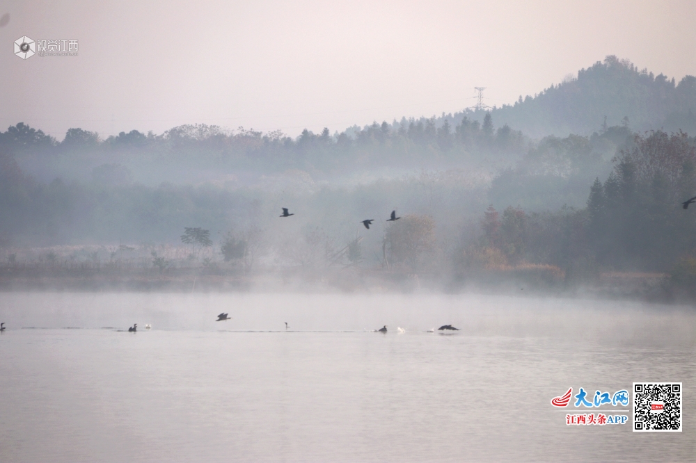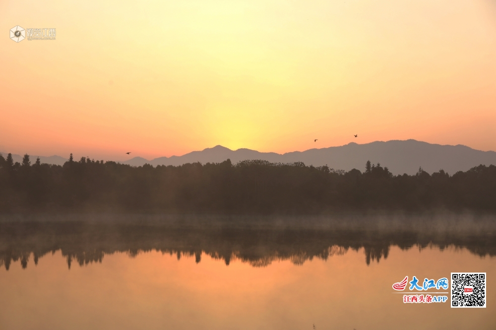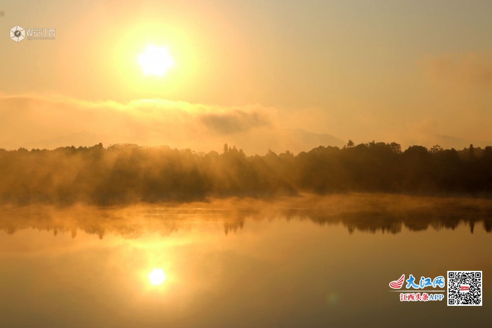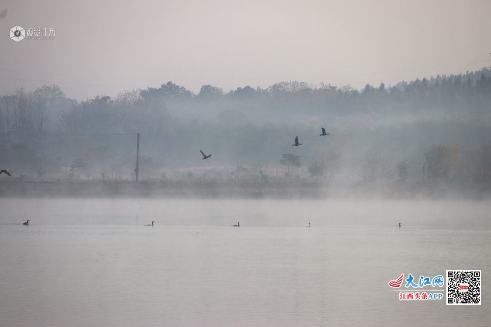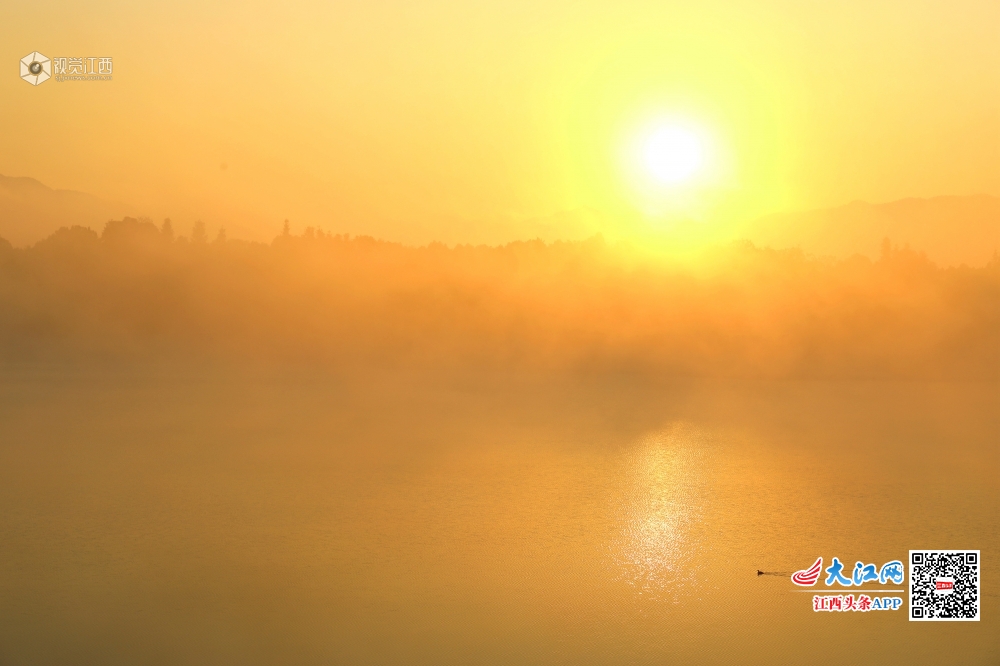 12月10日清晨,江西省新余市钤阳湖湖畔云雾缭绕,天地湖浑然一体,朝阳在白雾上折射出金黄色的光环,候鸟在云雾中穿行,宛若仙境。