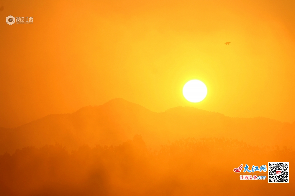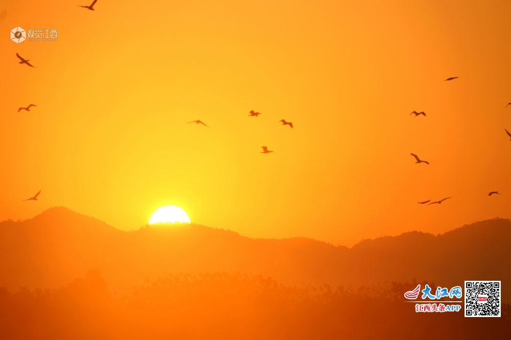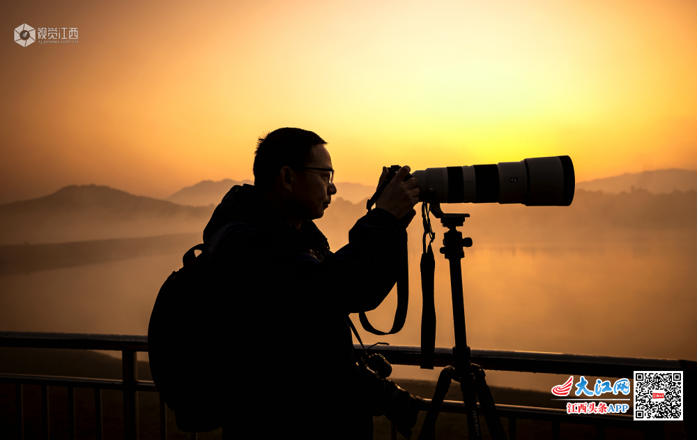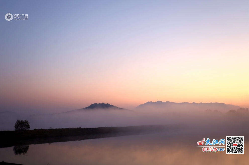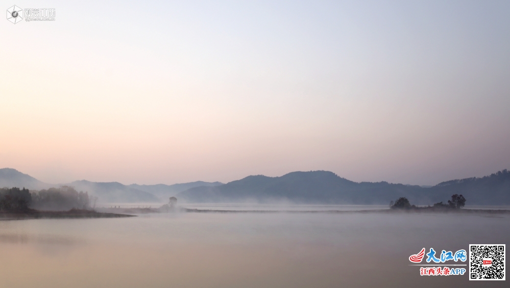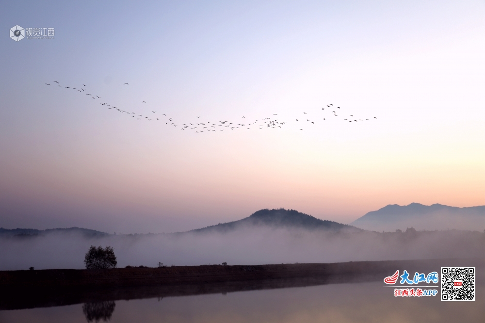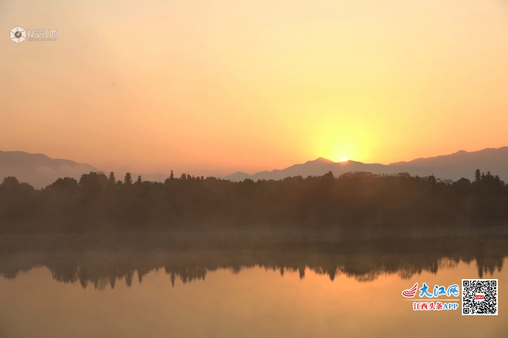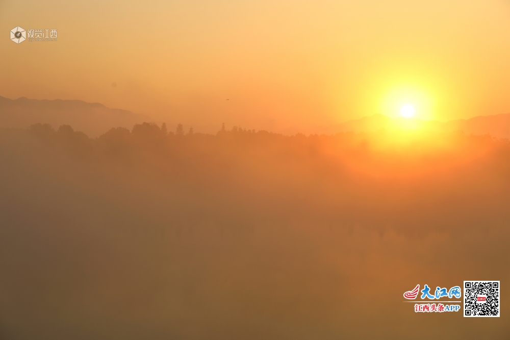 12月10日清晨,江西省新余市钤阳湖湖畔云雾缭绕,天地湖浑然一体,朝阳在白雾上折射出金黄色的光环,候鸟在云雾中穿行,宛若仙境。