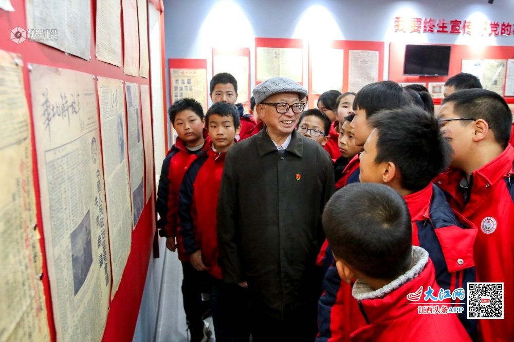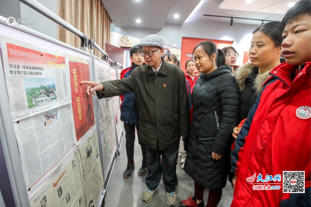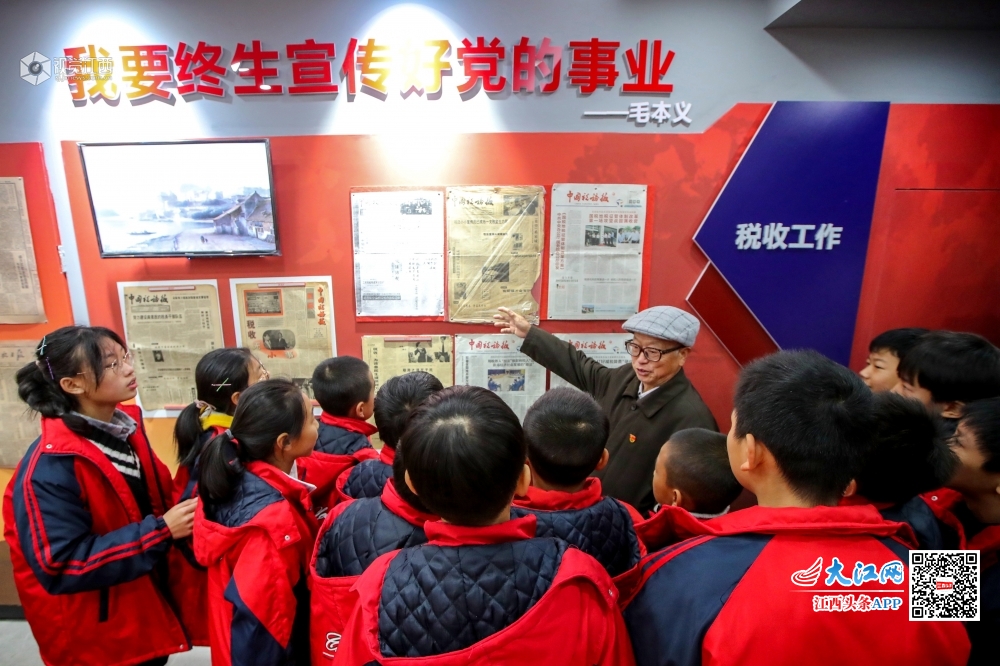 12月12日,今年81岁的毛本义在江西省吉安市峡江县税务局毛本义报展馆向学生作讲解。他是江西省吉安市峡江县税务局退休干部,也是第六届全国道德模范提名奖获得者。1957年开始,毛本义就在记事本上写下誓言:“我要终生宣传好党的事业”。60多年来,他秉持虔诚执着的信念,采取集报、剪报、研报、用报的特殊方式,讲好中国故事,传承中国精神。他收集的报纸有2120种约2万份,编集了“国庆特刊”“党的生日”“革命英烈”“不忘初心、牢记使命”等36个报纸专题,开展公益报展1000多场次。