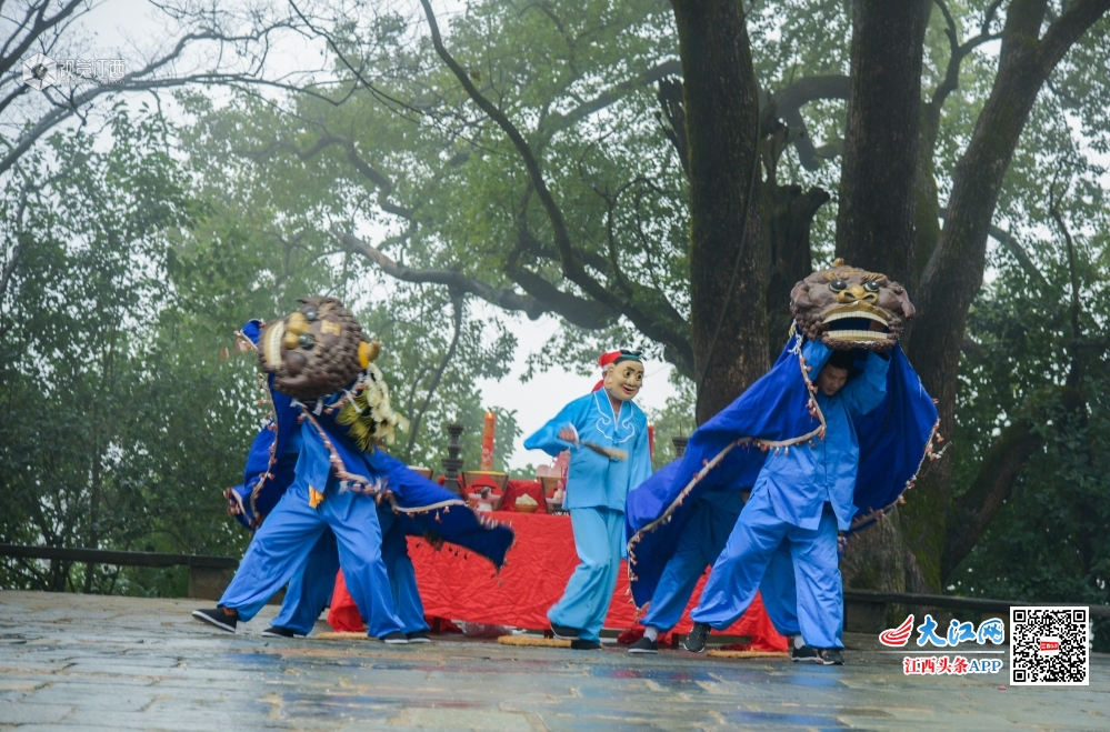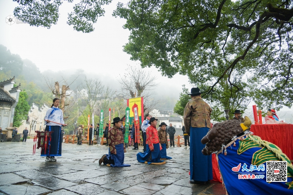 焚香鸣炮,三跪五拜,跪墉山之神庇佑,拜年年风调雨顺。当日一早,婺源篁岭村民和景区工作人员便开始了祭山神仪式。一路吹吹打打,三牲五谷,祭旗高扬,整个篁岭村都弥漫在古老庄严的仪式氛围中。带着面具的“犭回”大嘴獠牙,原本严肃的祭祀,在“犭回”与逗“犭回”人的配合下显得十分生动,许多从未见过此种祭祀的游客们,纷纷掏出手机记录留影。