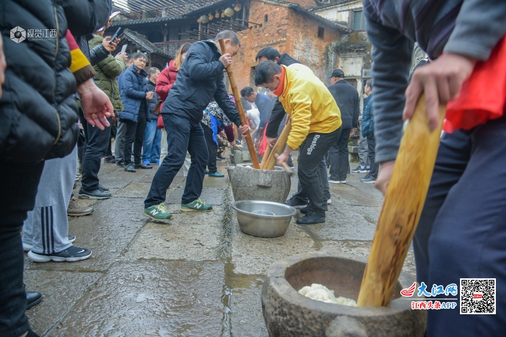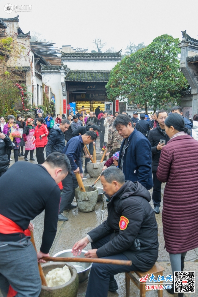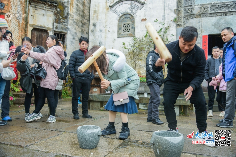 打麻糍是冬至庆丰收的重要环节,在篁岭众屋广场上,6个石臼一字排开,热气腾腾的糯米倒入其中,有经验的村民们撸起袖子,一边打一边翻,配合非常默契。游客们跃跃欲试,也来体验一番,还能吃到自己亲手参与制作的麻糍,现场氛围十分火热。