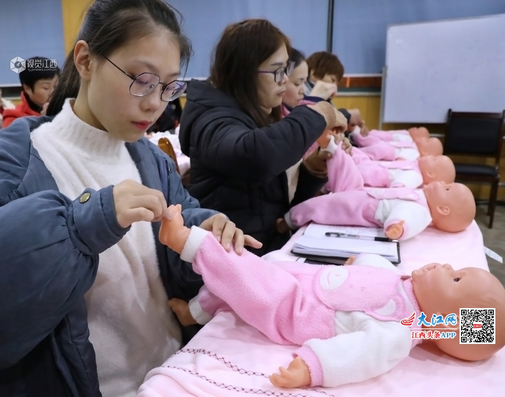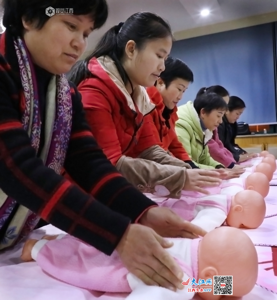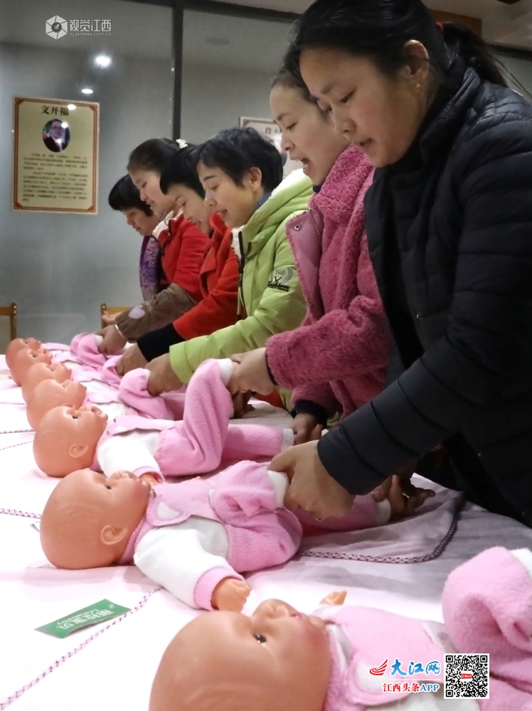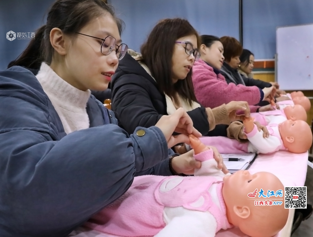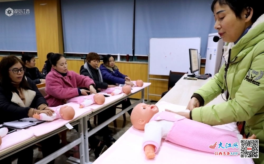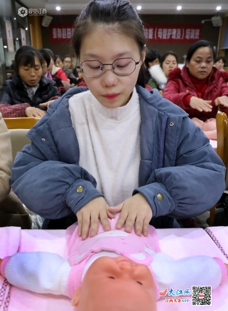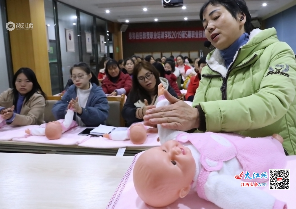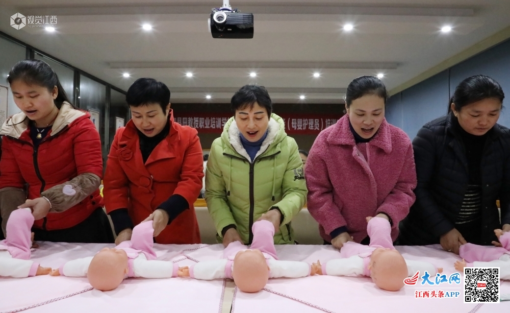2019年12月23日,在江西省吉安市泰和县一个职业培训学校的月嫂培训班上,学员们正在认真学习婴儿护理技能,学校通过多媒体演示、互动教学、现场模拟操作等方式,向他们传授孕妇护理、月子餐制作、婴幼儿日常生活料理等专业知识。据悉:为提高农村转移劳动力、城镇失业人员、大中专毕业生、贫困家庭子女的职业技能,拓宽就业渠道,近年来,该县积极组织开展月嫂培训,为他们提供免费技能培训。仅在今年就举办了月嫂培训班20期,培训学员1100余名。