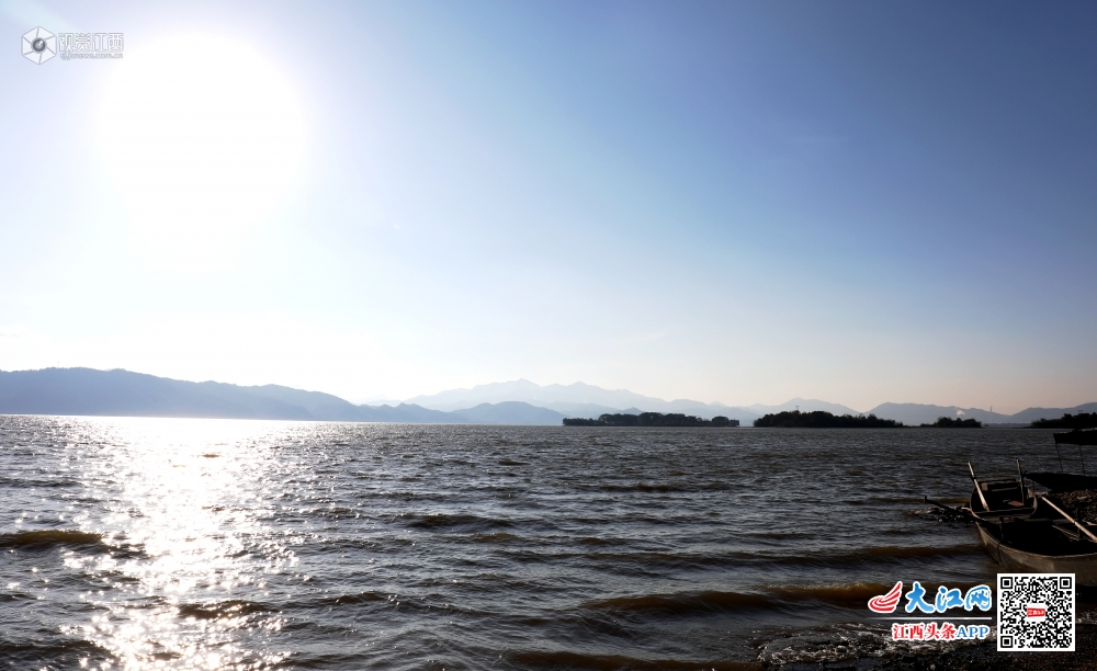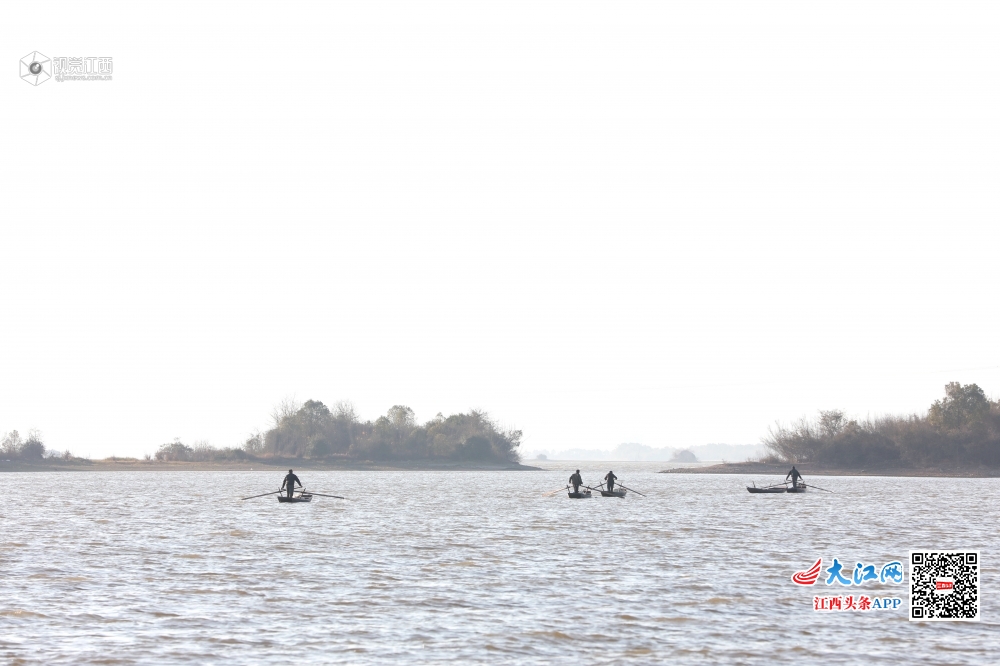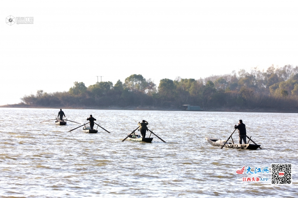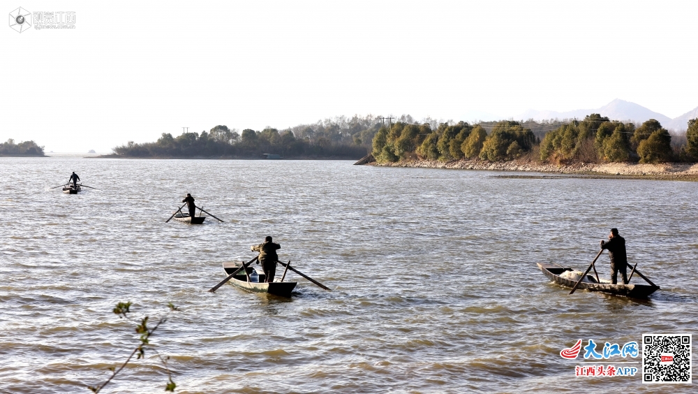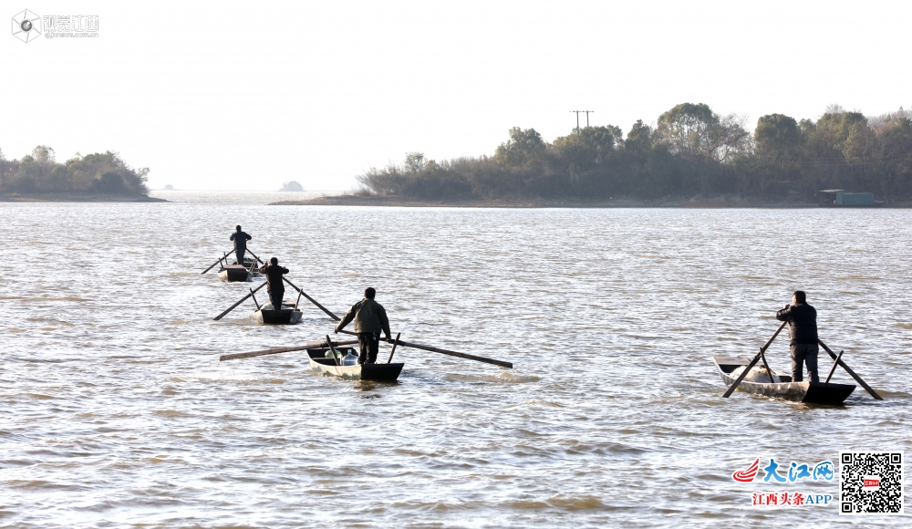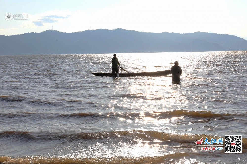 2020年1月7日,小寒节气刚过,江西省新余市分宜县钤阳湖畔却温暖如春,湖面波光粼粼,水天一色,渔民在湖面上迎着风划着船去撒网,风景如画。
