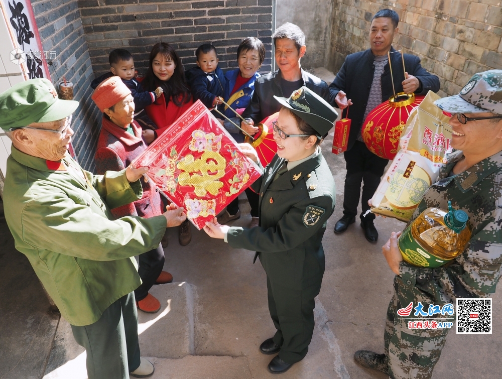 2020年1月8日,江西省南丰县洽湾镇人武部、退伍军人服务站的干部来到该镇郑家村向参加过抗美援越的退伍老兵郑炳来(左一)送去大红灯笼、福贴、春联,大米、食油等慰问品和新春的祝福。农历春节来临,南丰县广泛开展关爱老兵、情暖军属,“送光荣、送问候、送温暖”三送活动,对退伍老兵、军人家属进行走访慰问,送去党和政府的关怀和温暖,让战士们在部队安心服役、报效祖国。