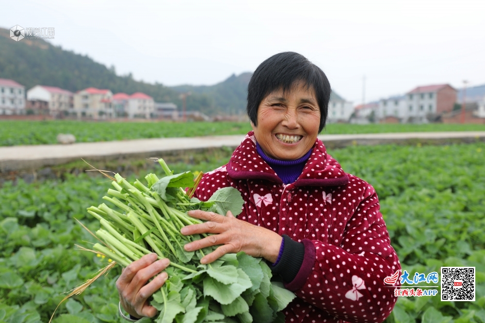 1月9日,莲花县坊楼镇田垅村试种的15亩油菜新品种迎来大丰收,当地农户正抢抓晴好天气采摘油菜薹,贫困户吴冬娥抱着长势喜人的菜薹喜笑颜开。