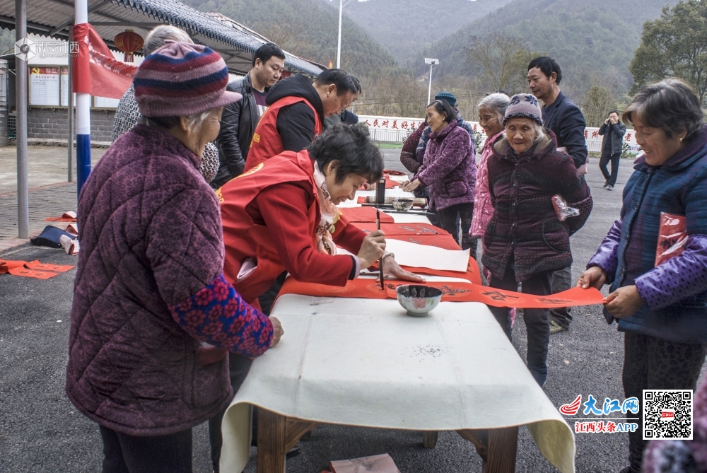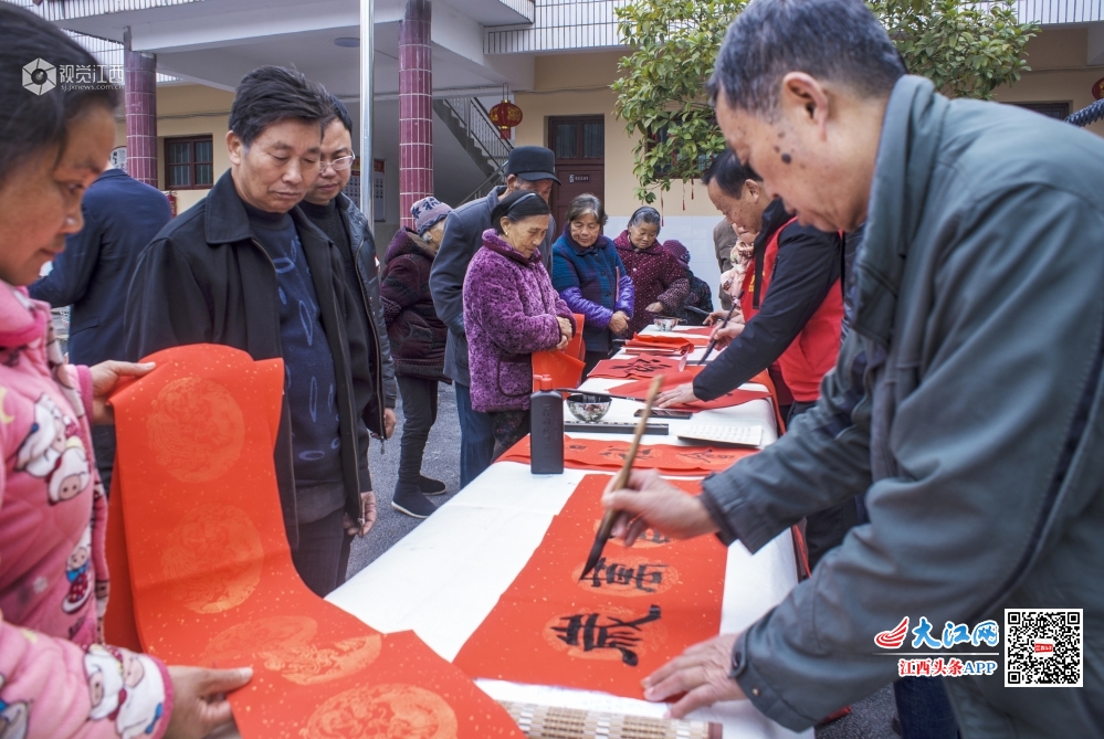下午三时,虽然寒气袭人,但洋江镇辑睦桥村颐养之家里暖意融融。书法爱好者们把红纸铺满桌面,挥毫泼墨,用心书写春联和福字。二十余名老人兴高采烈地领到了自己喜欢的春联和福字。