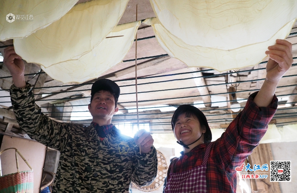 2020年1月13日,江西省南丰县太源乡路头村平家村小组,贫困农户平小勤夫妇正在赶制手工豆皮,准备投放春节市场,增加经济收入。