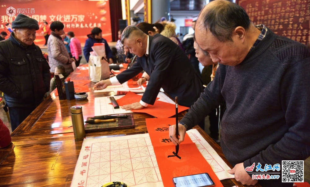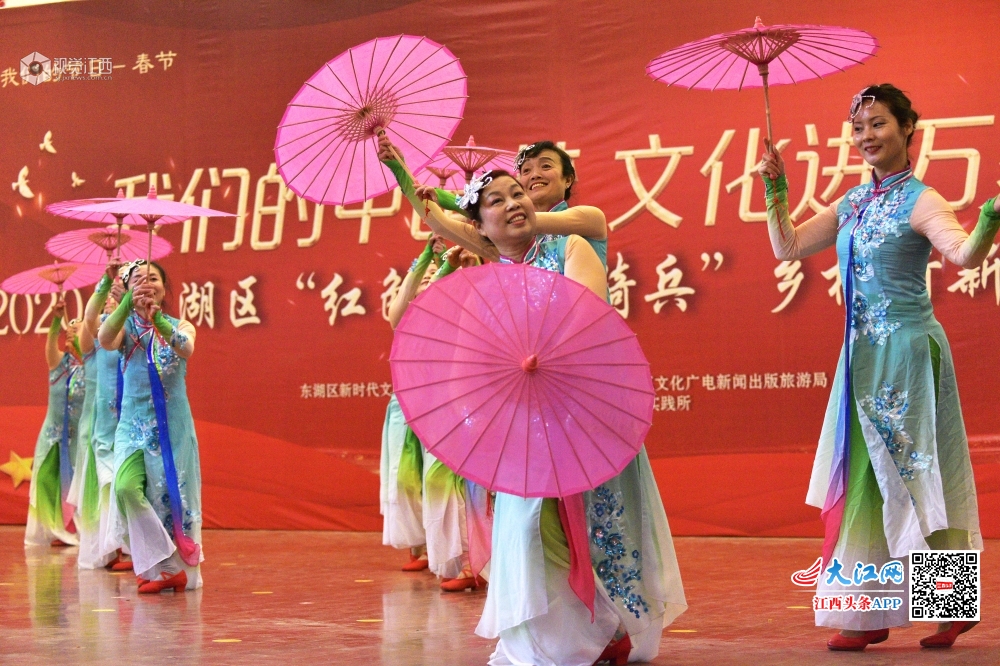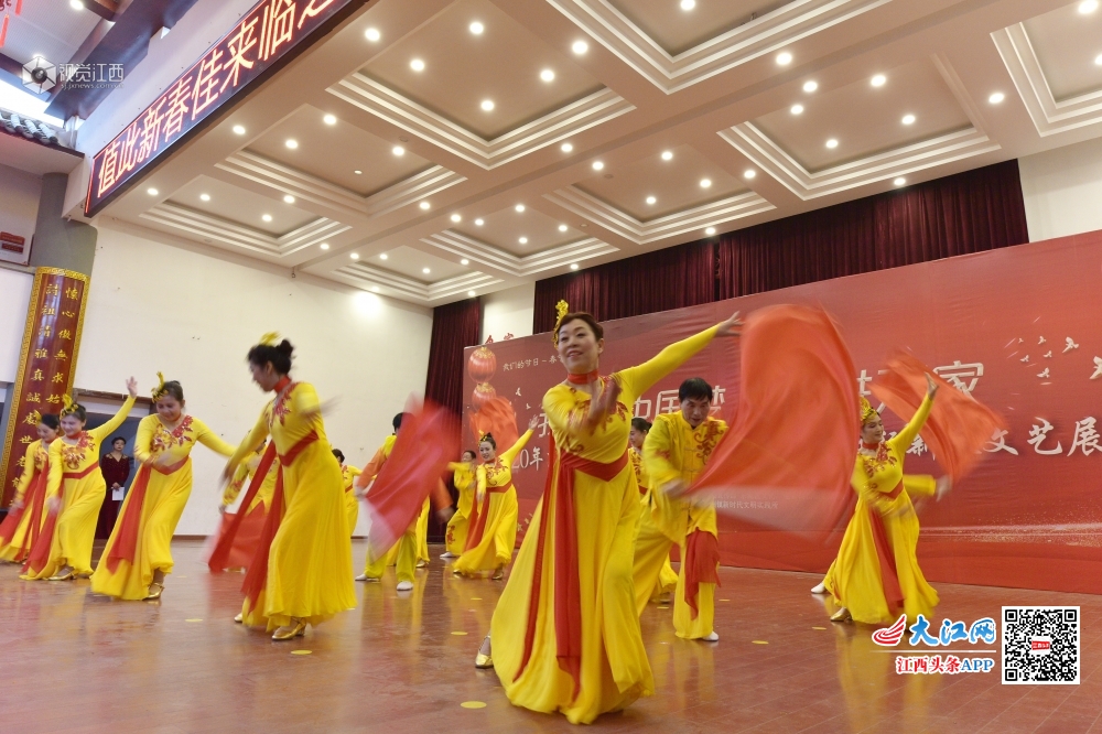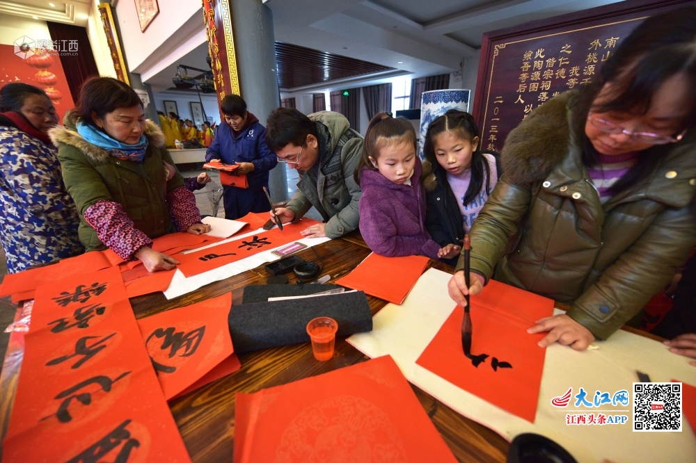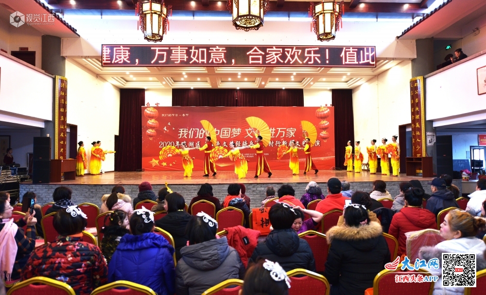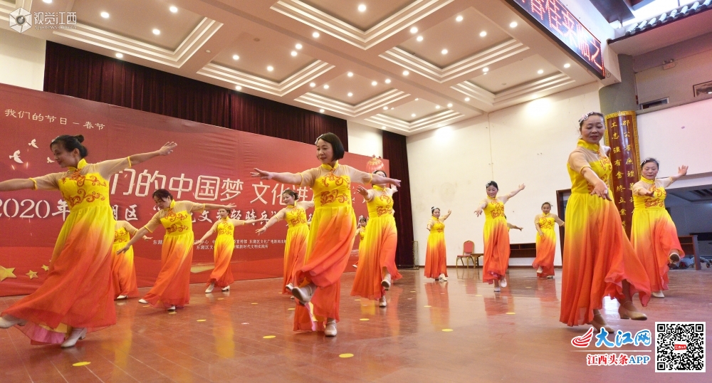 1月16日下午,南昌市扬子洲镇前洲村文化大院里热闹非凡,周边群众闻讯而来集聚到文化大院,看精彩歌舞,赏优美歌声,还可以免费领取春联,呈现出浓厚的迎新春的节日气氛。