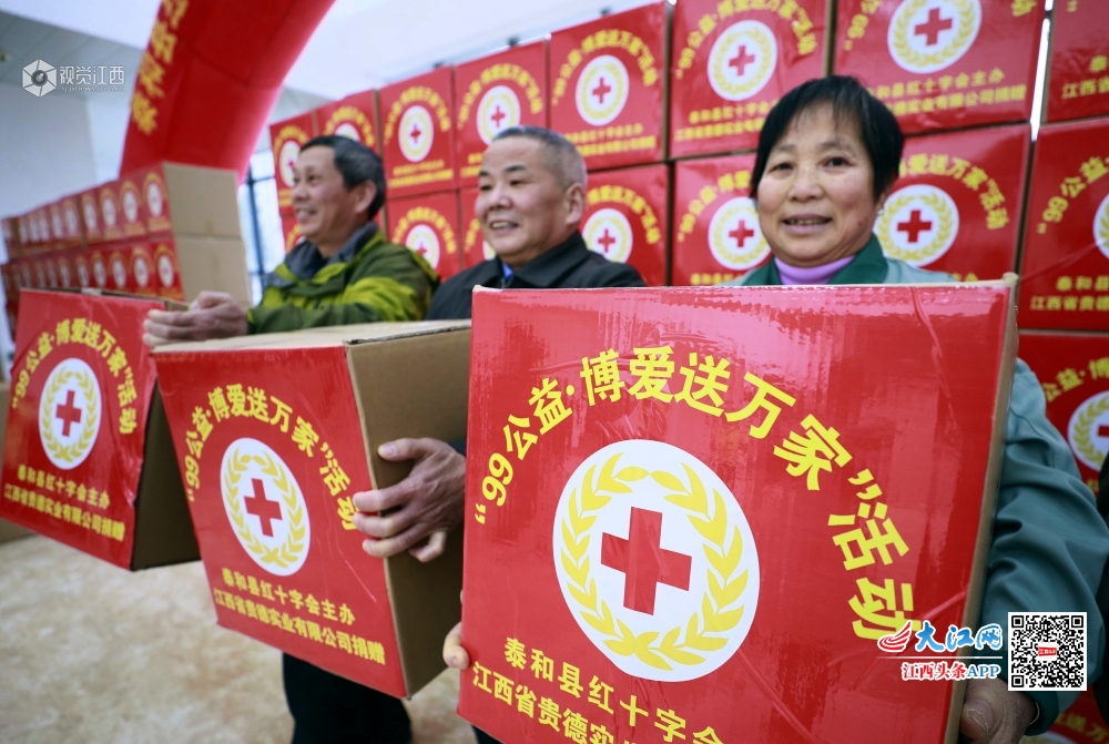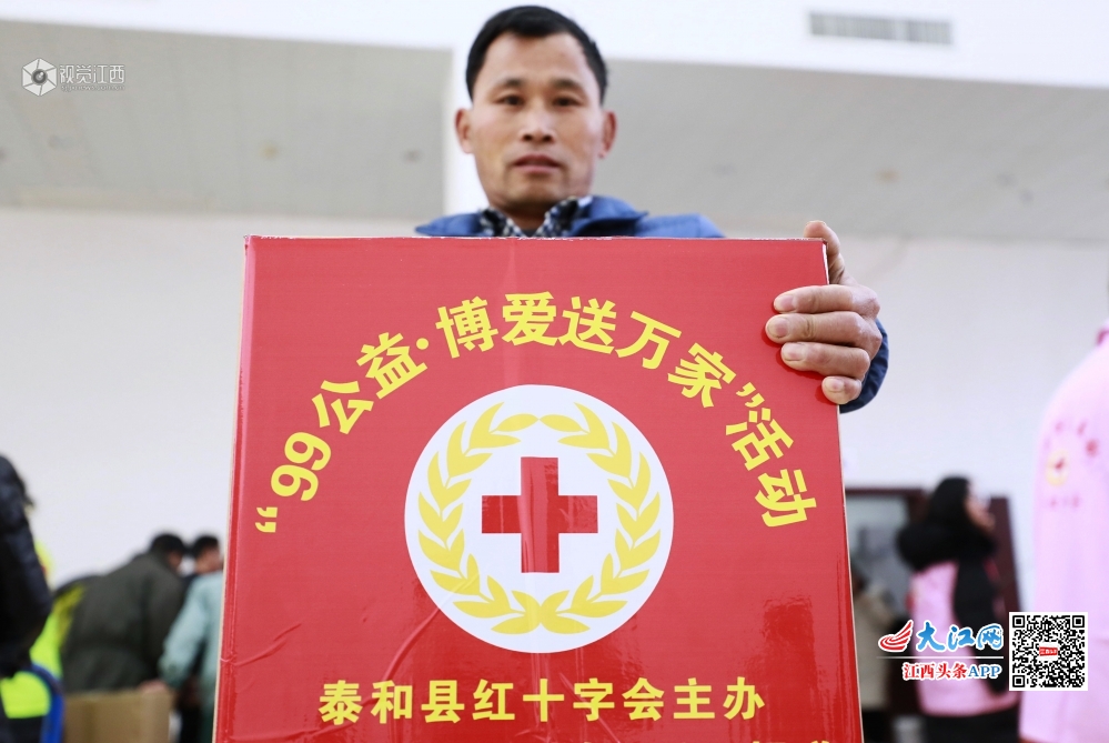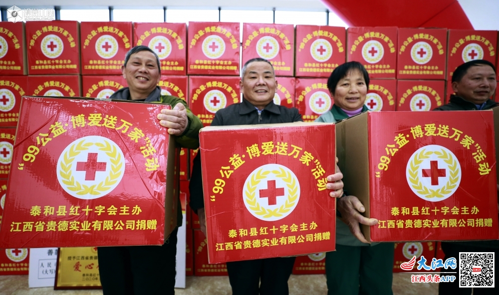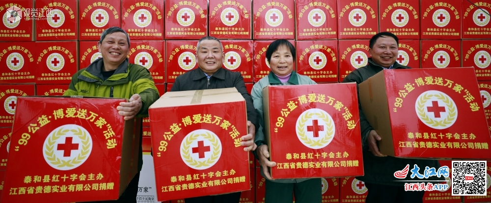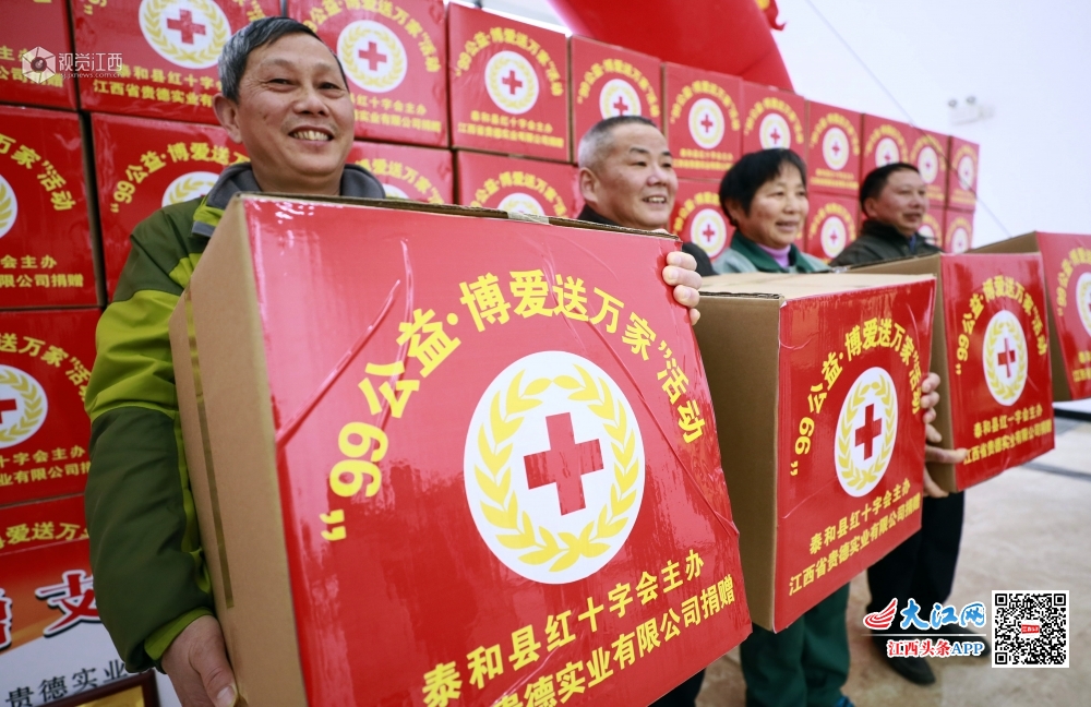2020年1月17日,江西省吉安市泰和县举行“99公益·博爱送万家”活动启动仪式,将爱心企业捐赠的大米、食用油、糖果等慰问物质发放给全县200户贫困群众手上,为他们送去温暖关爱及新年祝福。