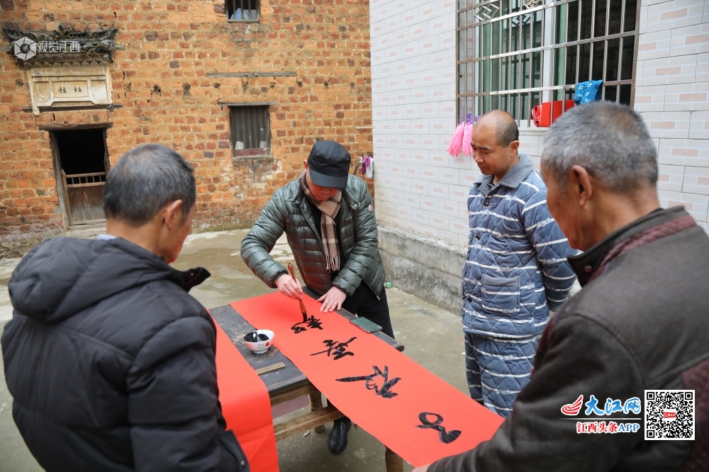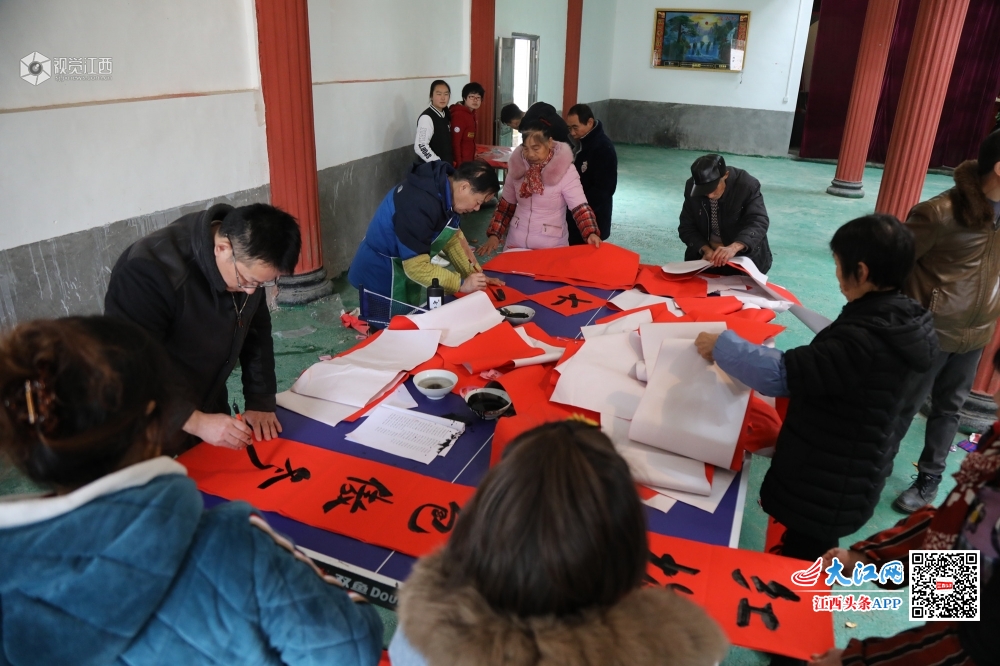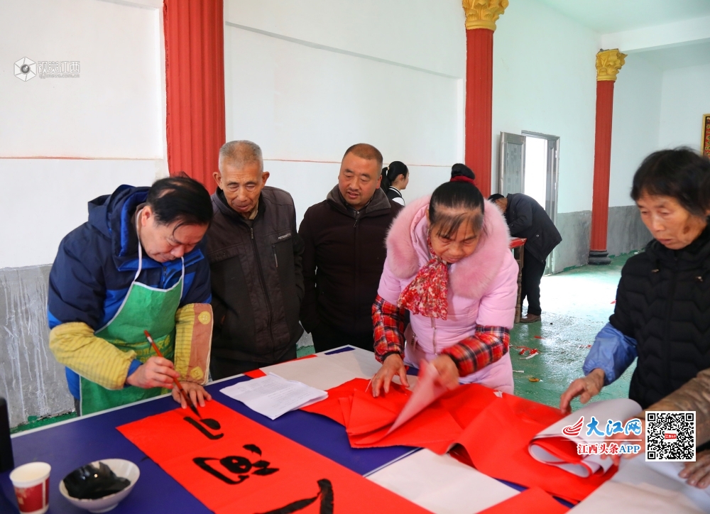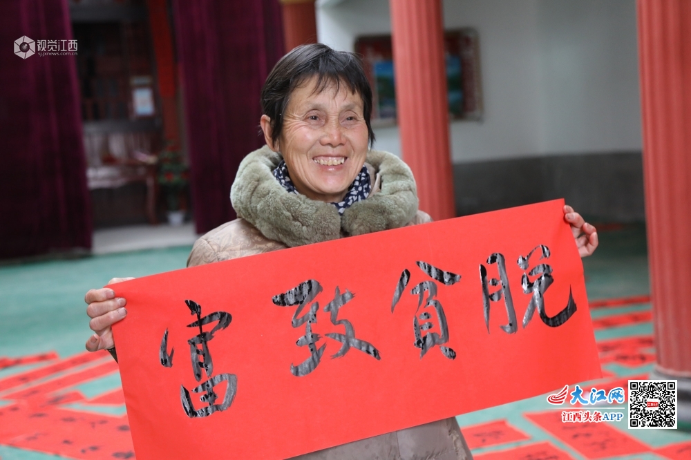 1月20日上午,在莲花县坊楼镇东星村祠堂内,贫困户刘云娥手捧春联笑逐颜开。当天,来自萍乡市的书法家们来到这里,为村民免费写春联,送去新年浓浓的祝福。