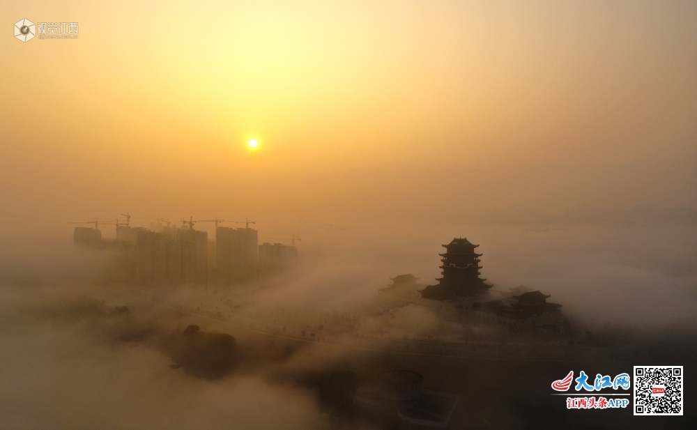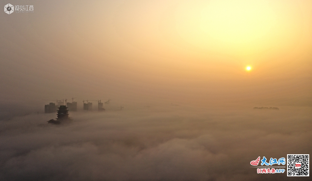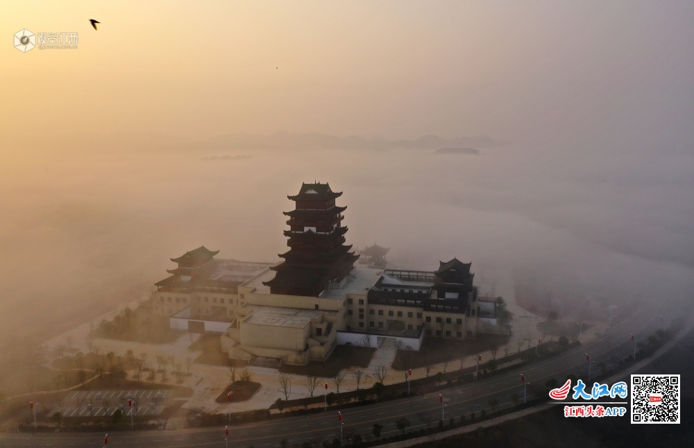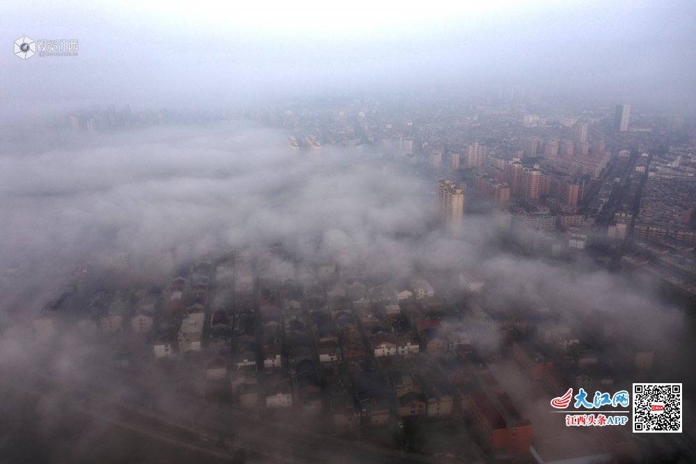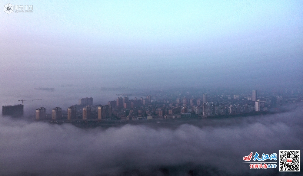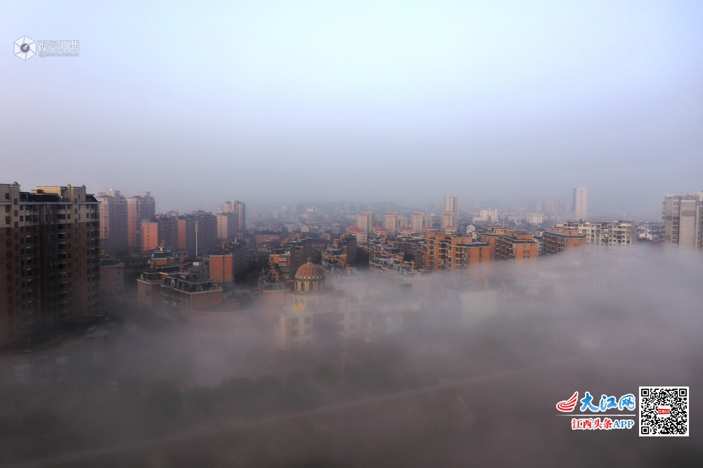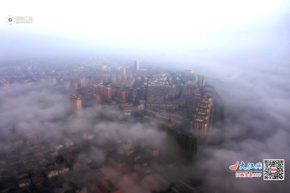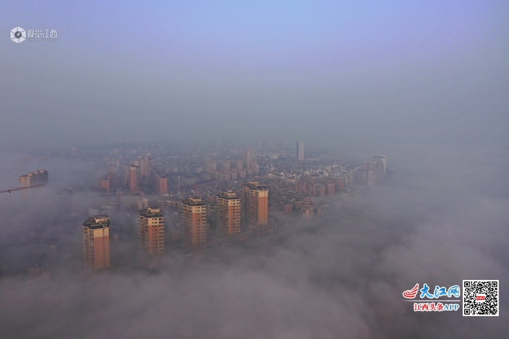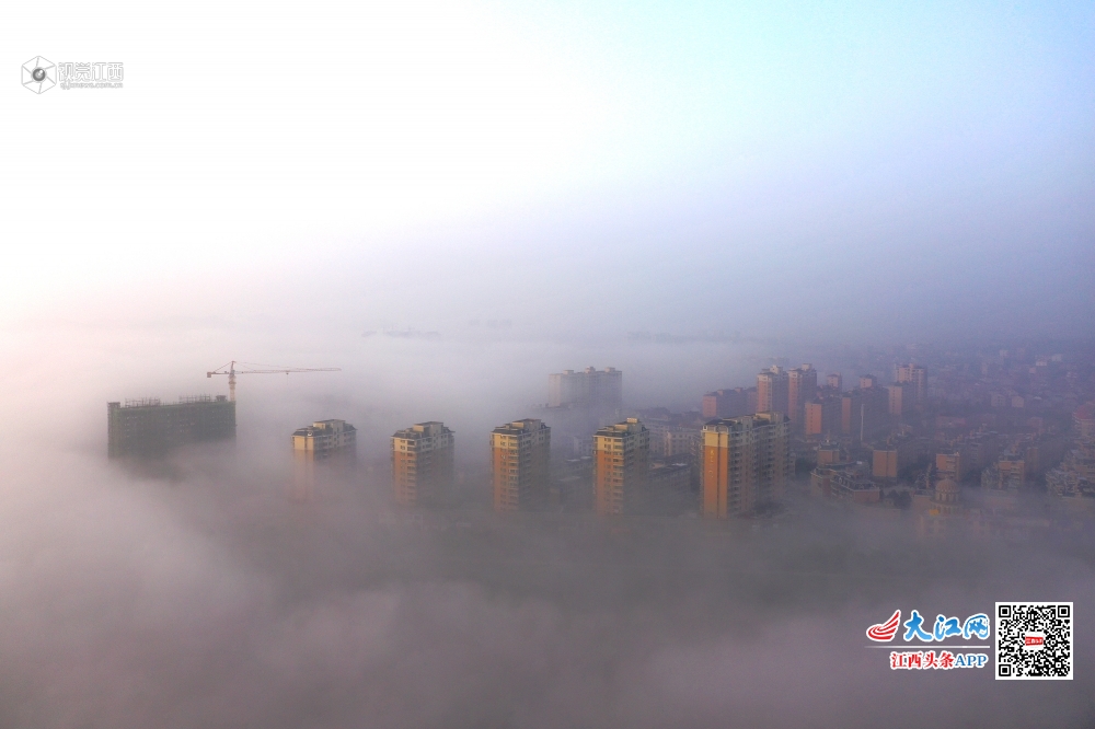 2020年1月20日,江西省上饶市铅山县河口镇大雾围城,航拍城区高层建筑被大雾笼罩,宛如仙境。