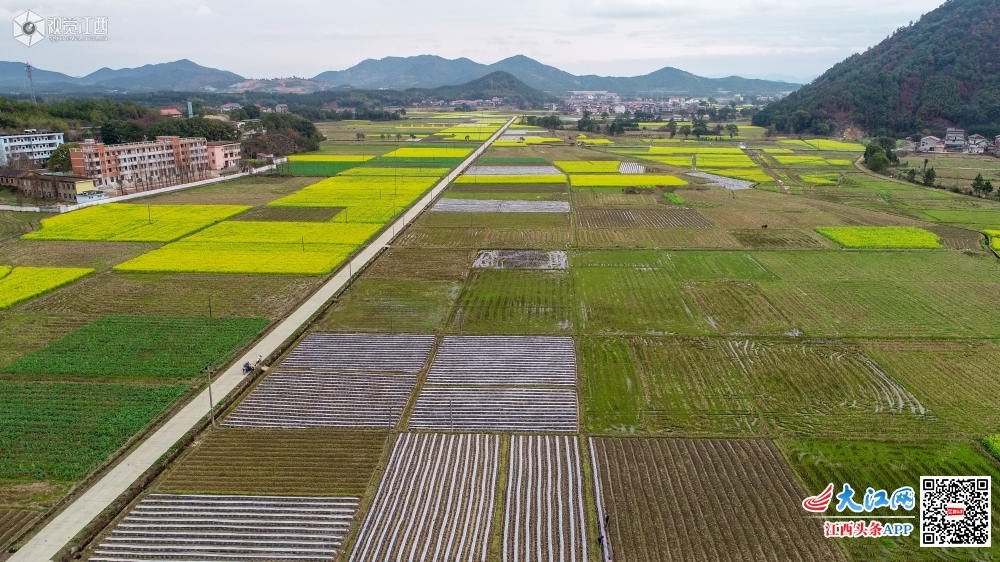 2月7日,在江西省吉安市峡江县金江乡拍摄的油菜花田(无人机拍摄)。初春时节,江西省吉安市峡江县的油菜花盛开,黄花、碧水、农田、群山、村舍相映成趣,透出浓浓春意。