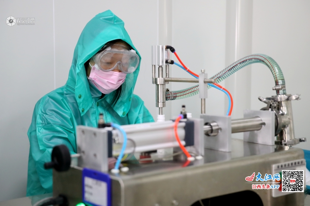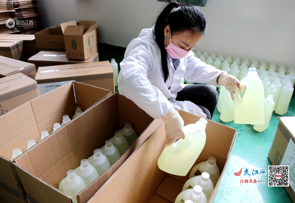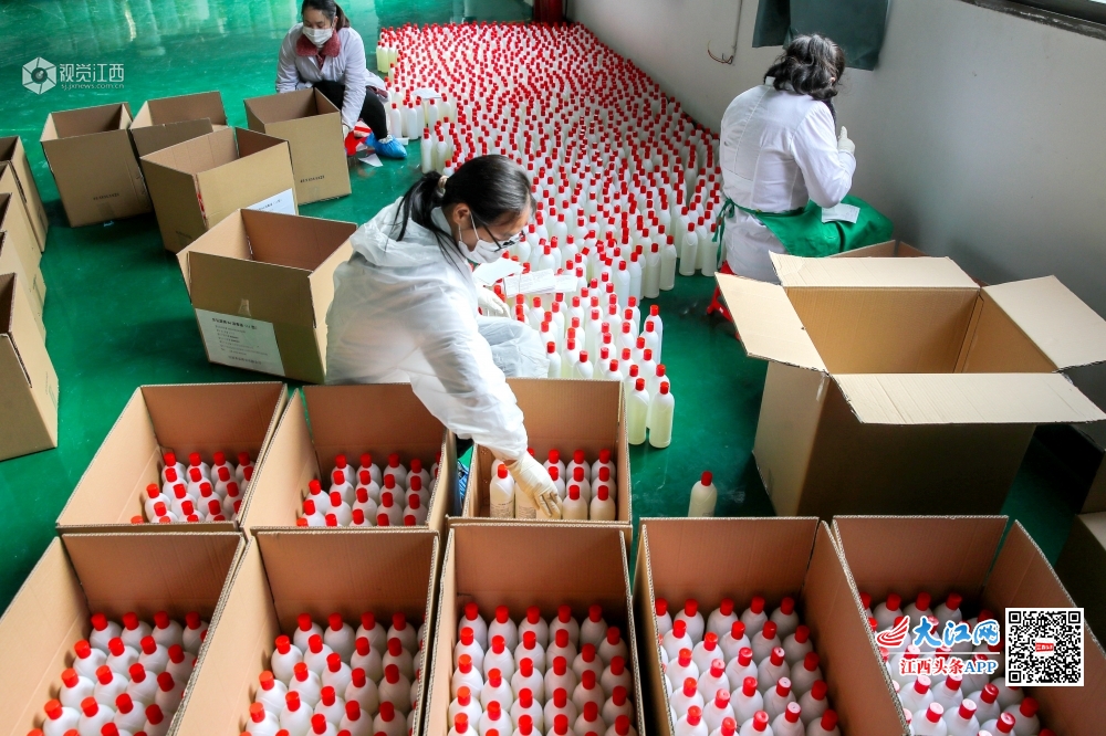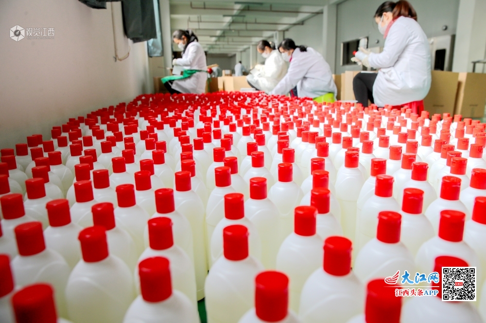 2月9日,在峡江县东弘药业有限公司生产车间,工人在加紧生产84消毒液。峡江县积极发挥“省级医药产业基地”的产业集群优势,加强统筹调度,推进资源整合,所有防护用品生产企业加班加点,开足马力赶制口罩、消毒用品等各类防护物资,全力保障供应。