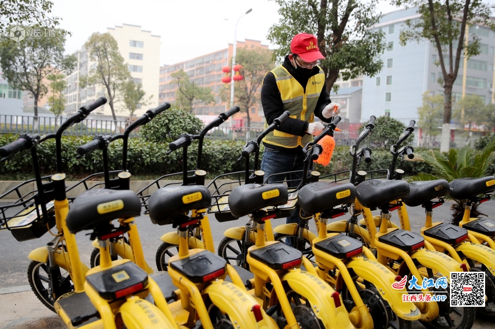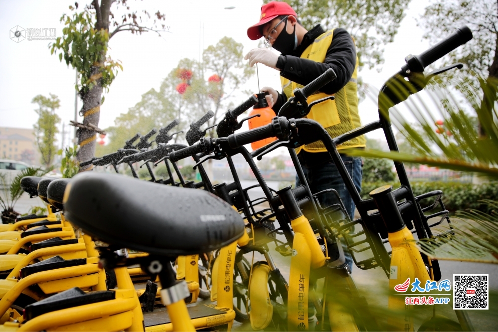 2月11日,江西省吉安市峡江县党员志愿者在给共享电动车喷洒消毒液。在公交停运的情况下,共享电动车成为江西省吉安市峡江县市民出行的重要交通工具。为保障市民出行安全,峡江县组织党员志愿者和企业工作人员对城区所有共享电动车加大消杀力度,增加消杀频次,确保所有车辆消杀到位。
