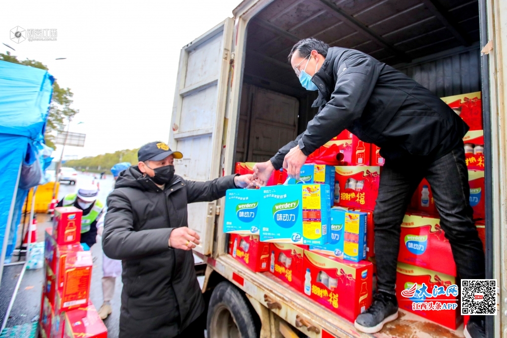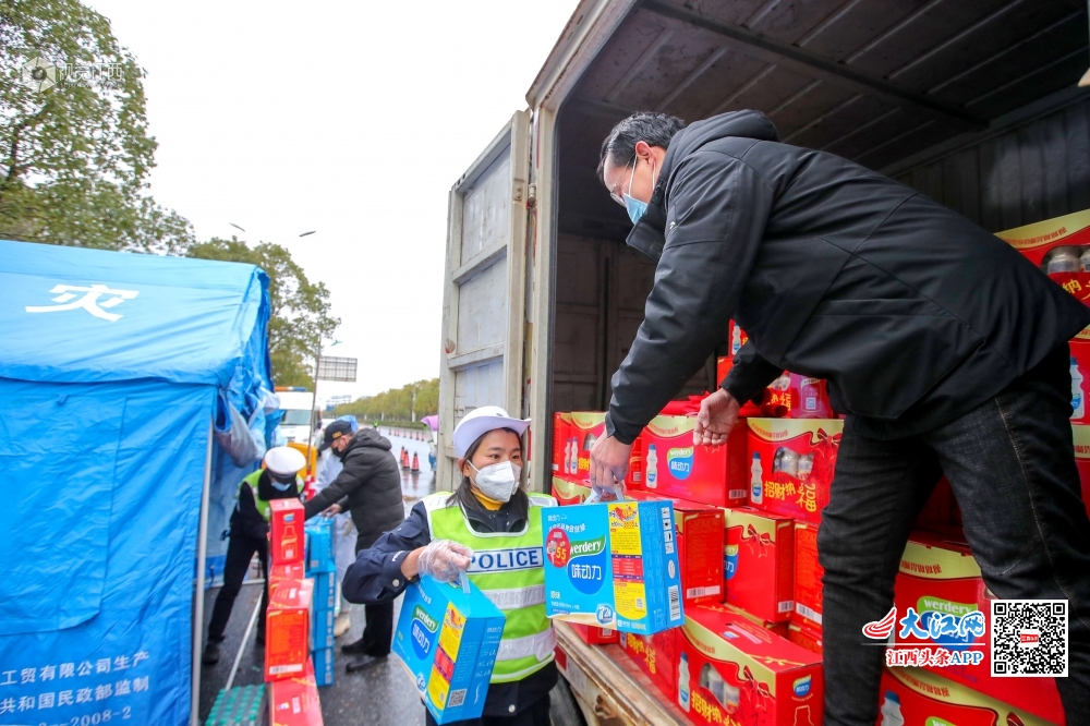 2月16日,峡江县的爱心志愿者向坚守在抗疫一线的工作人员赠送饮品。连日来,峡江县的爱心企业和人士纷纷捐款捐物,累计捐赠爱心款20余万元及一大批医用口罩、消毒液、防护服等医疗物资和生活用品。