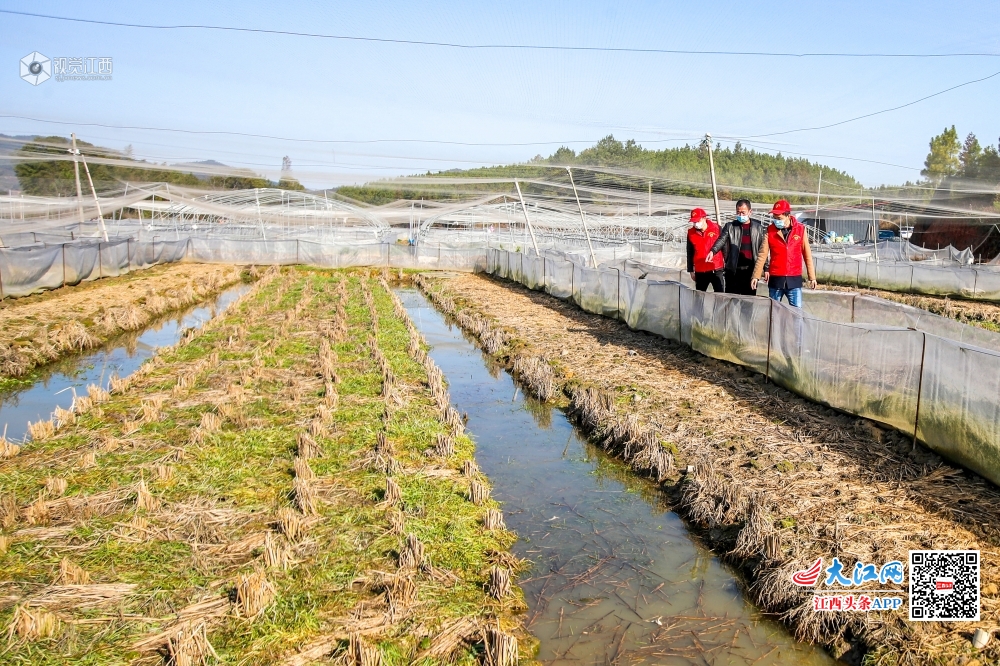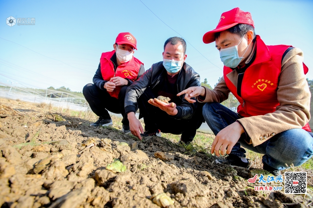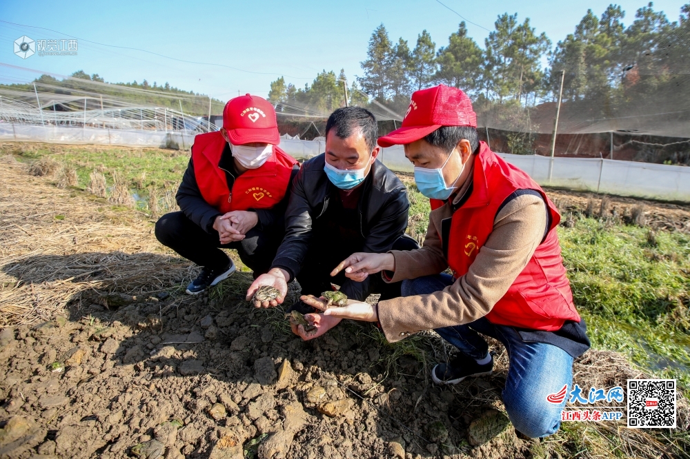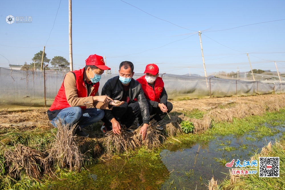 2020年2月18日,在江西省吉安市峡江县仁和镇彭家村稻蛙养殖基地,青年科技志愿者在向养殖户讲解春季养殖要点。连日来,江西省吉安市峡江县组织农业、林业、科技等部门党员干部、技术骨干、青年志愿者,组成11个科技下乡支农小分队,为广大群众送去技术服务,将疫情对农业生产和产业扶贫的影响降到最低。