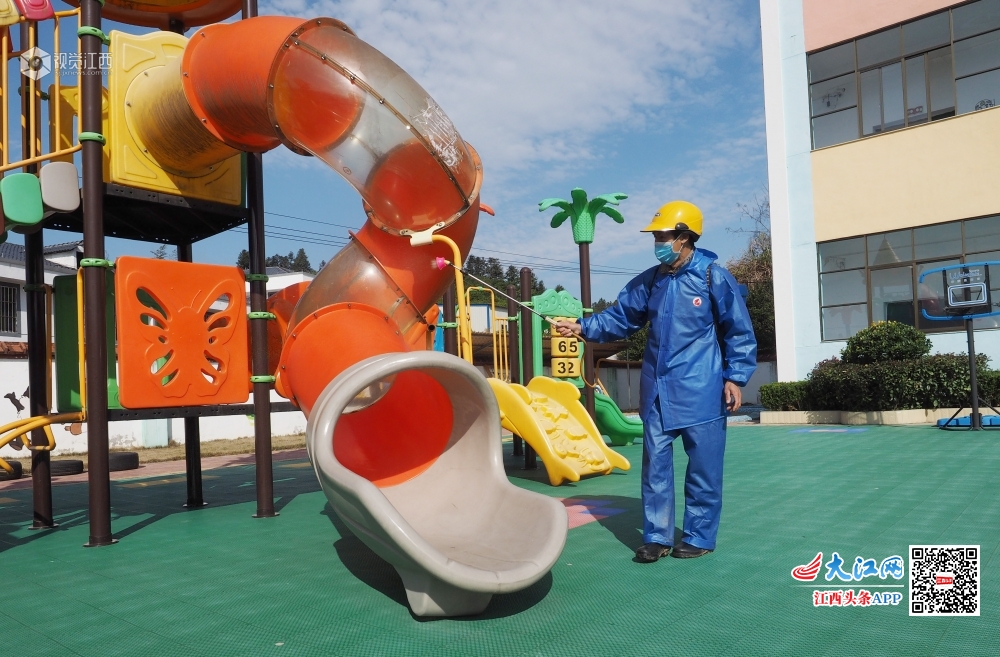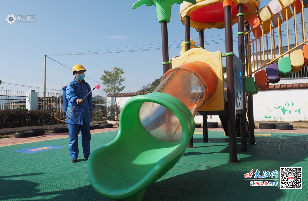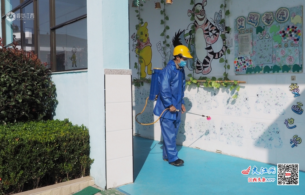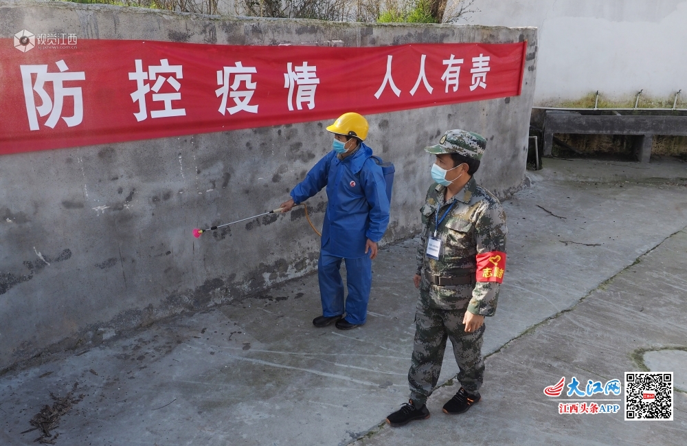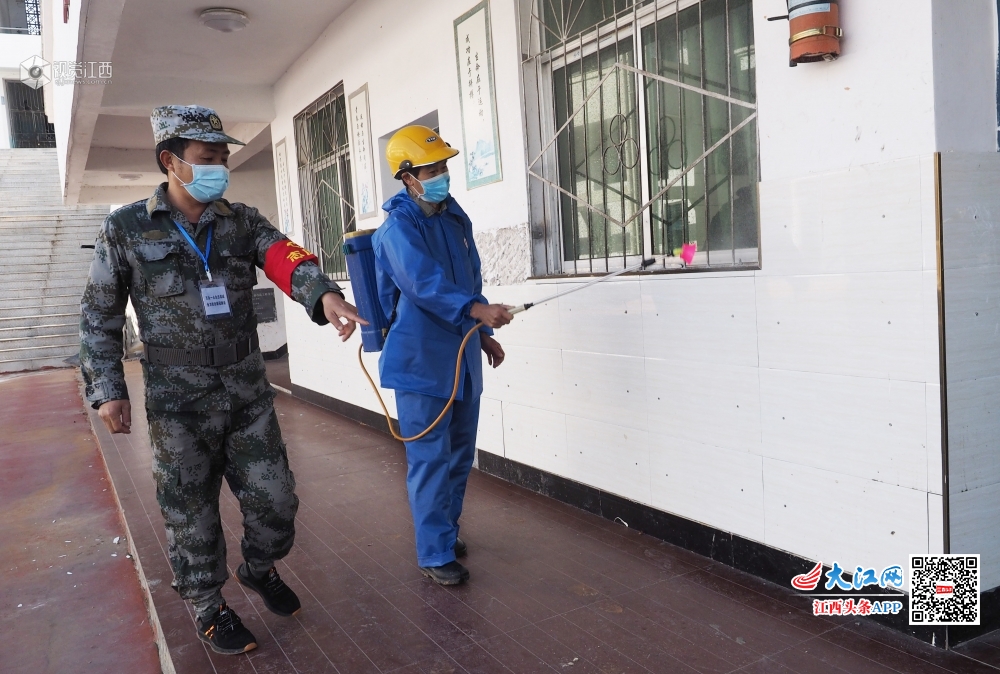 2月18日,由江西省南丰县傅坊乡民兵、党员志愿者组成的消杀志愿服务队正在当地中小学、幼儿园喷洒消杀药物。
