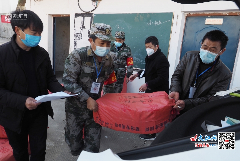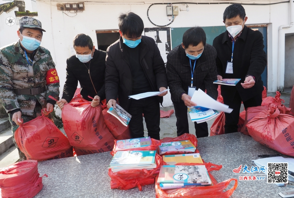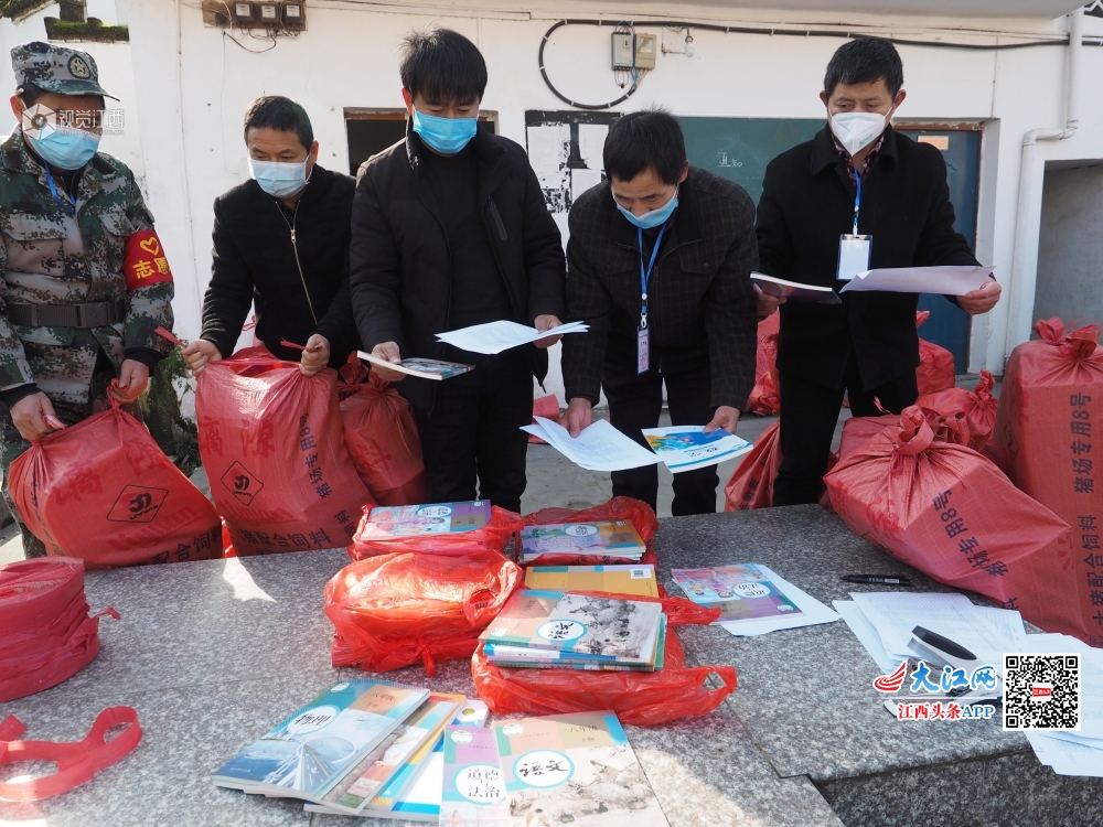 2月18日,江西省南丰县傅坊乡中学的教师正在将学生的新课本分装打包,准备送书上门。停课不停学,疫情期间延期开学,为方便学生在线学习,南丰县教体局开展送书上门活动,城区、乡镇各中小学校老师争当志愿者,将每一个学生的新课本分装打包,及时运送到城区各街道社区、居民小区,各乡镇村组,定点错时发放,让学生不出小区、村组就能及时领到新课本。