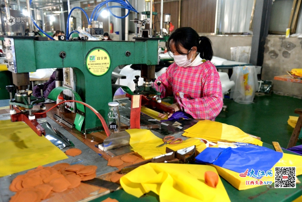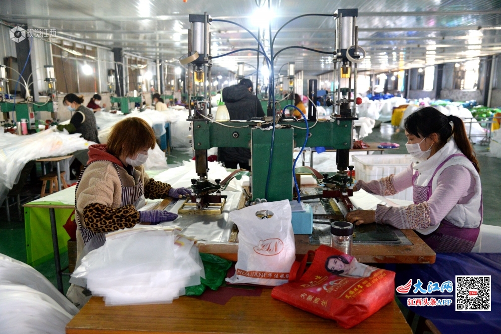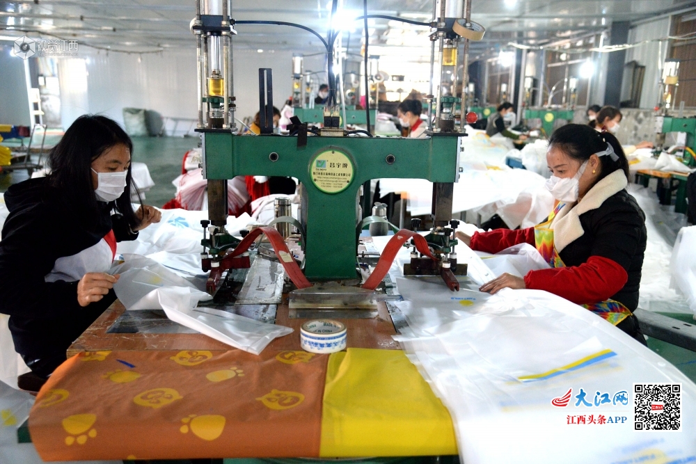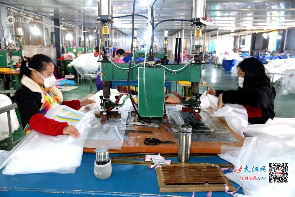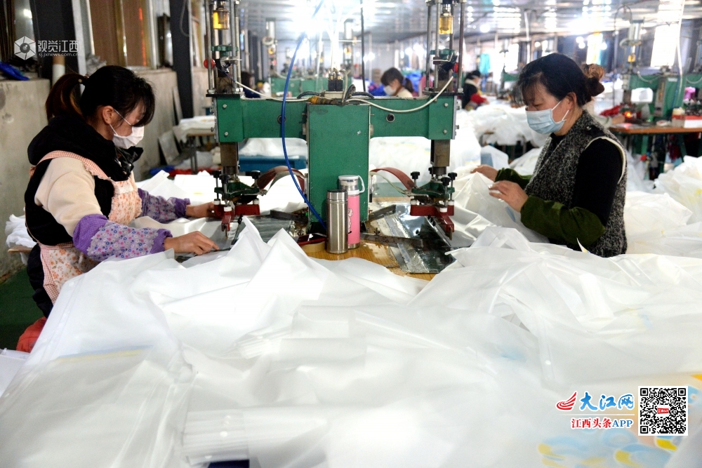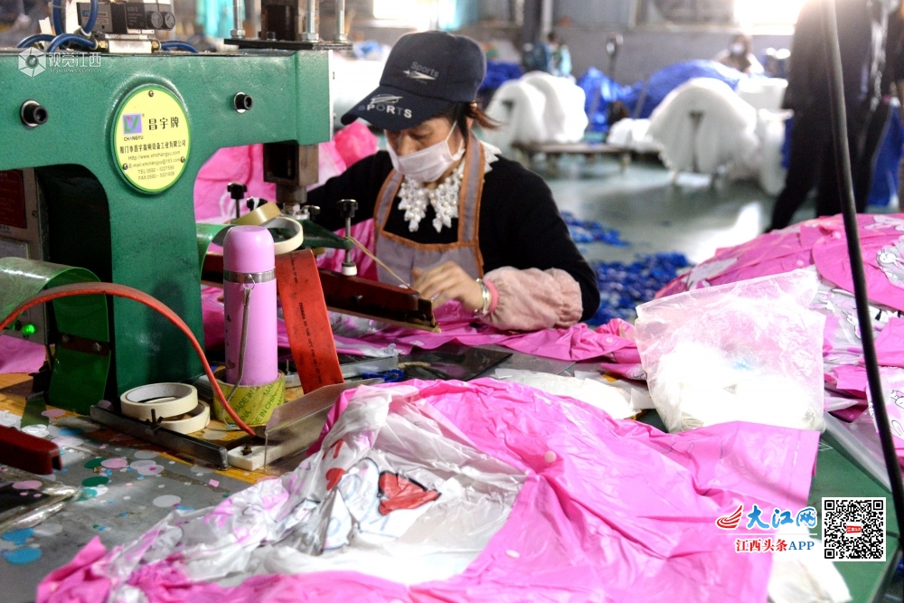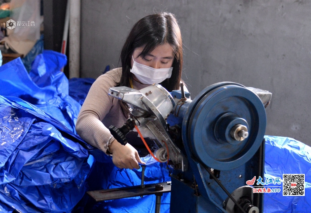 2020年2月22日,江西省南丰县一公司厂房内,工人们正在忙着完成客户预定的雨衣订单。