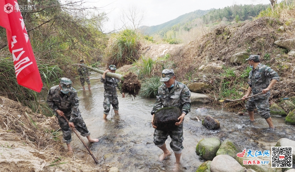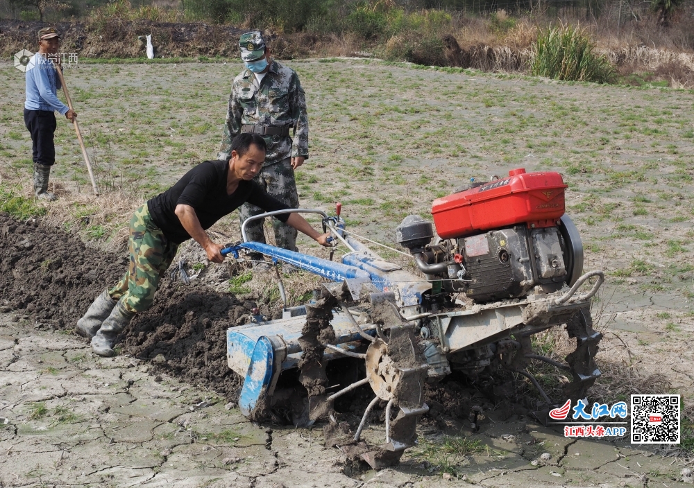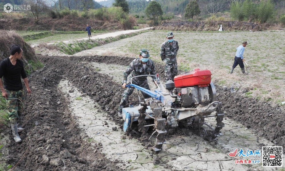 2020年2月26日,江西省南丰县三溪乡人武部、退役军人服务站组织的民兵、退伍军人正在该乡最偏远的坪上村帮助缺少劳力的贫困农户翻耕土地、清理河渠,为春耕生产、安全度汛做准备。