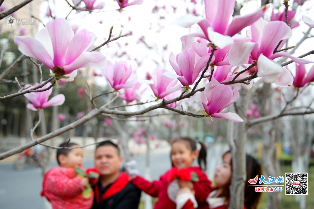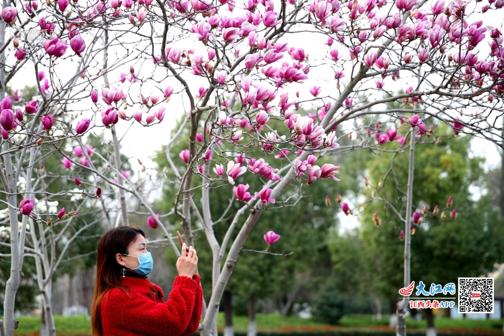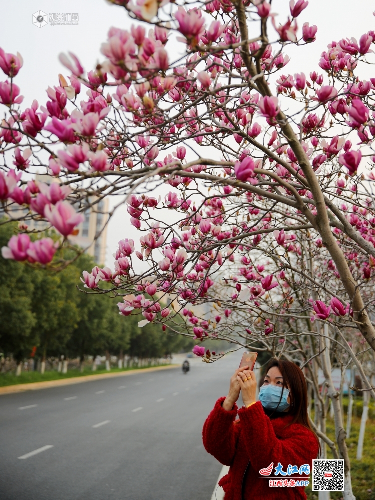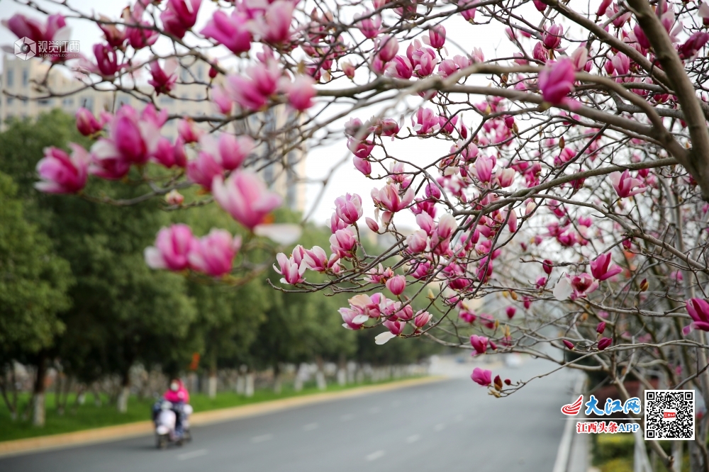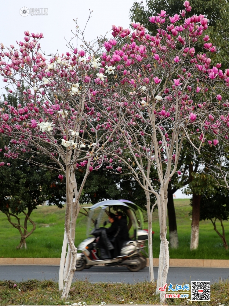 在江西省吉安市峡江县玉笥大道上,一朵朵亭亭玉立的白玉兰花竞相开放,繁花满树,艳丽芳香。美好的景色如同一幅幅山水画,给予我们信心,齐心战“疫”。