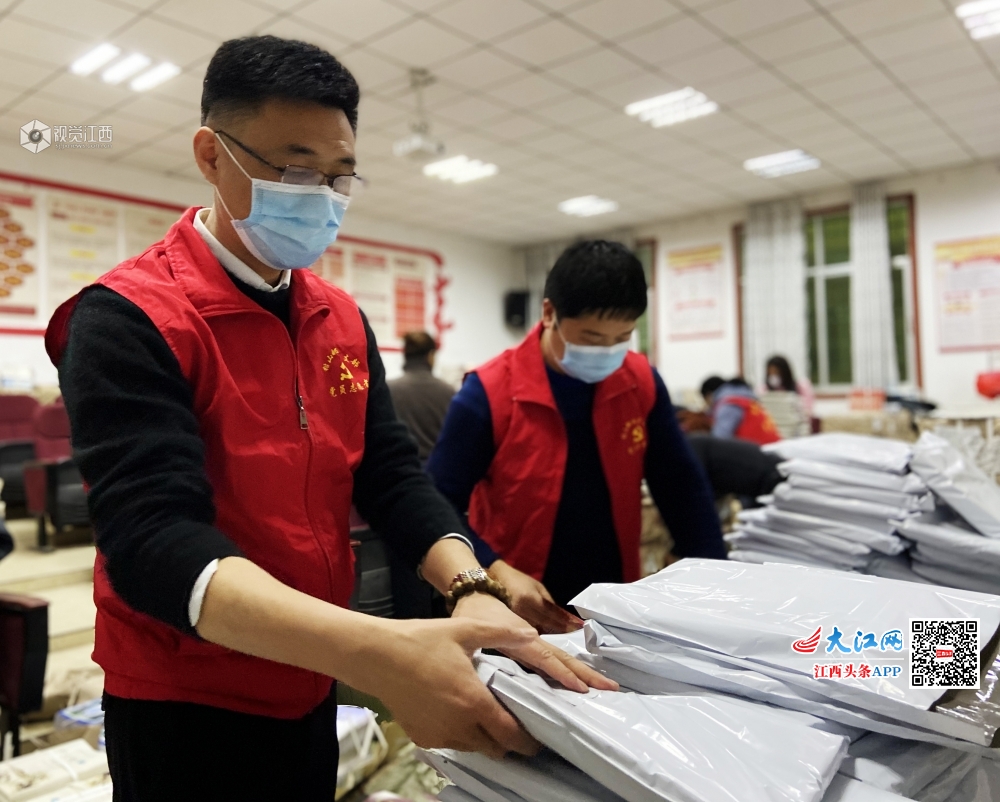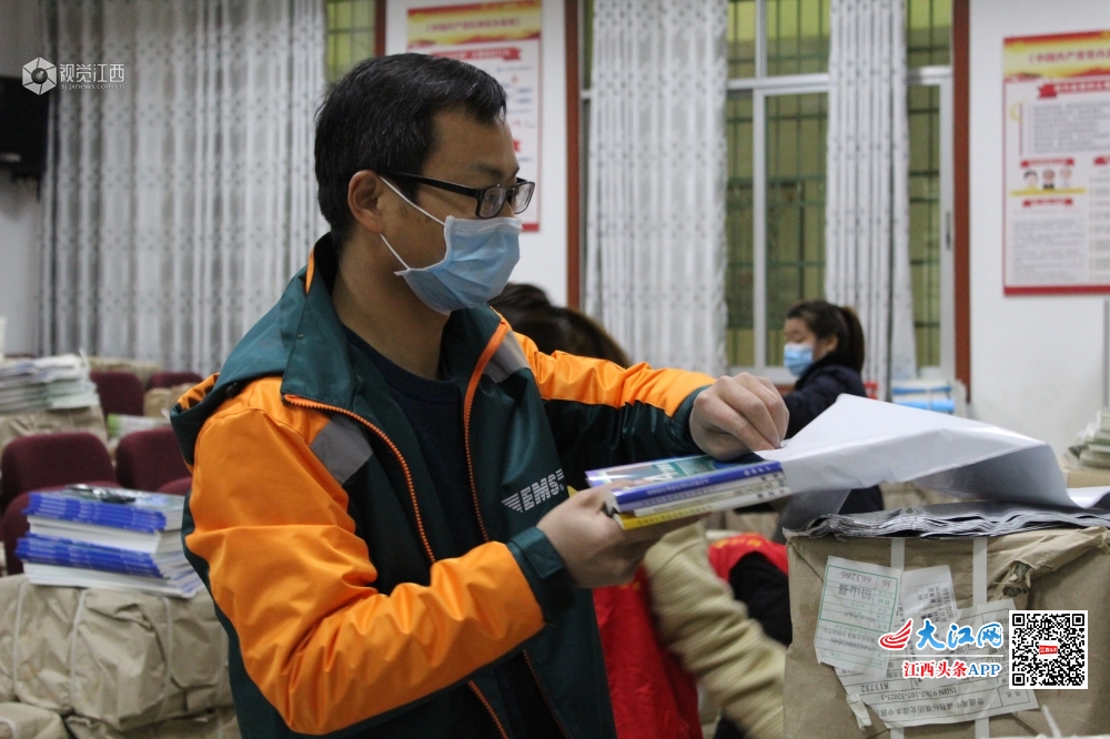 2020年2月26日,在江西省上饶市铅山县陈坊乡陈坊村,“全国五一劳动奖章”获得者、陈坊乡邮递员罗细英正在为学生送教材。连日来,铅山邮政分公司为使教材在最快的时间内投送到位,组织机关党员和青年志愿者成立“突击队”,通过“5+2”、“白+黑”的作业模式,已帮助8000余名学生配送了教材。