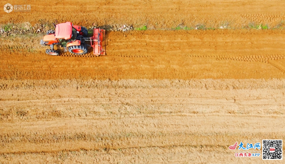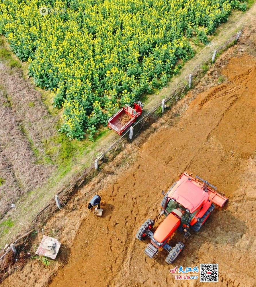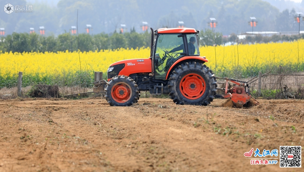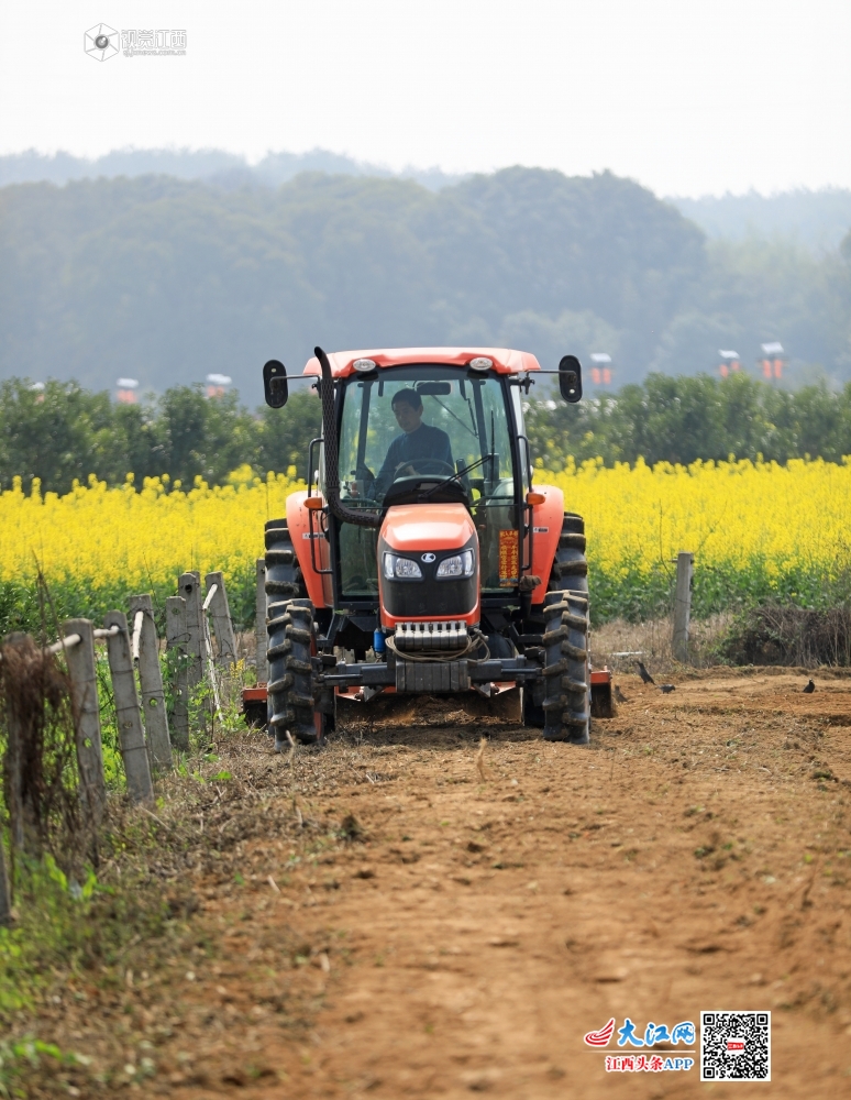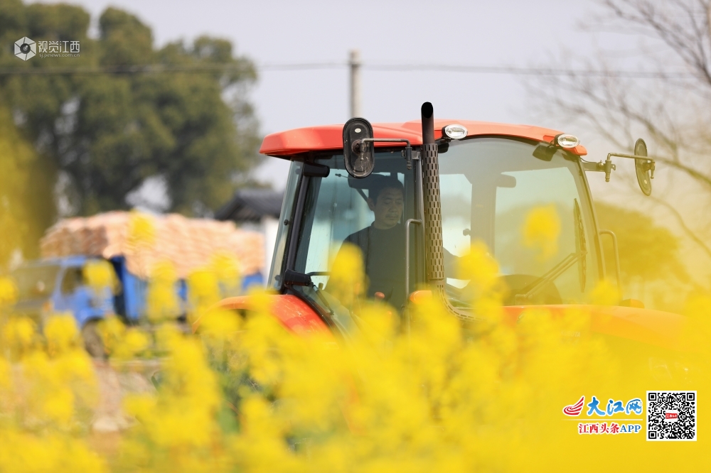 2月28日,江西省吉安市泰和县苏溪镇滩尾村,黄灿灿的油菜花间,农民正驾驶新购置的农机进行耕田作业,构成了一幅繁忙的春耕图。