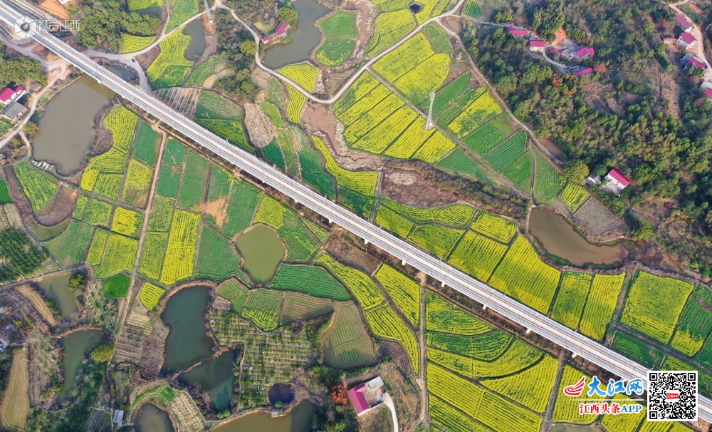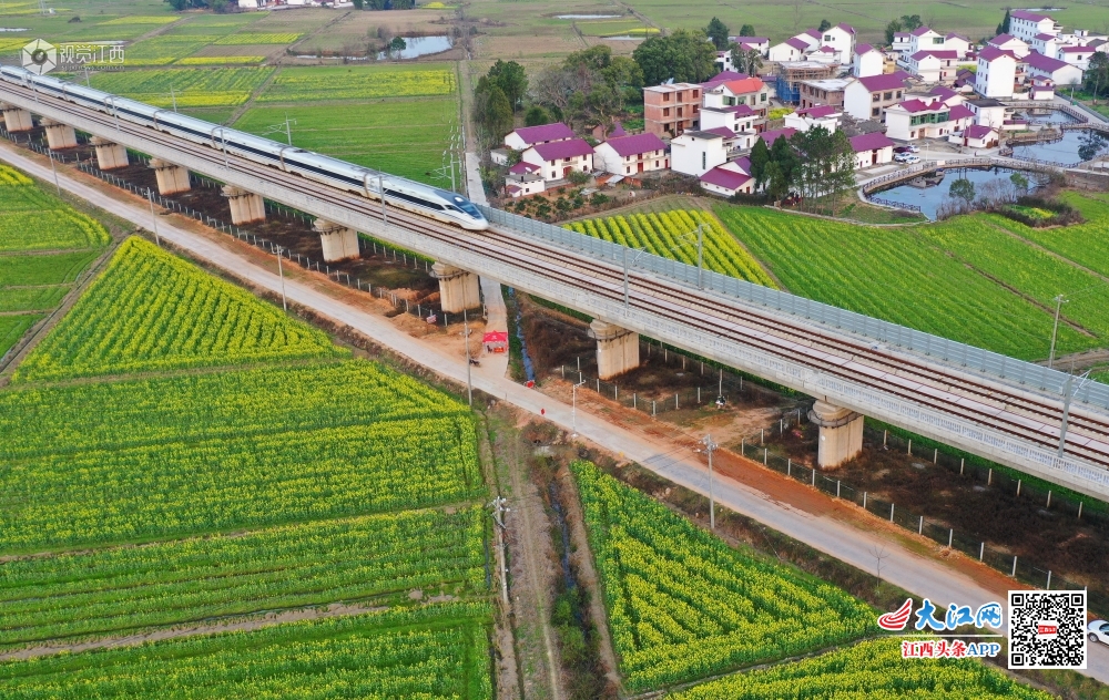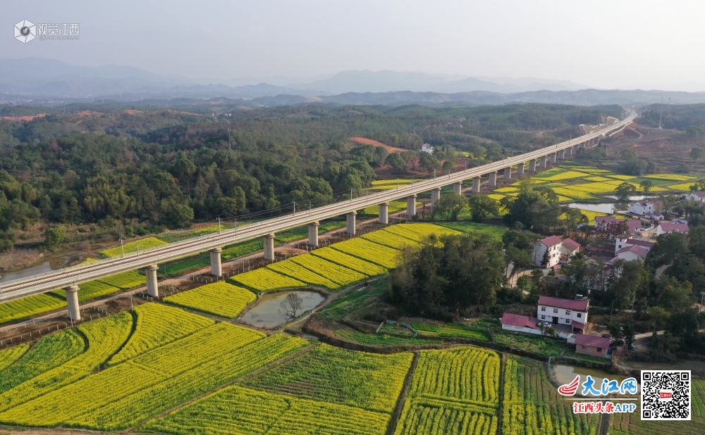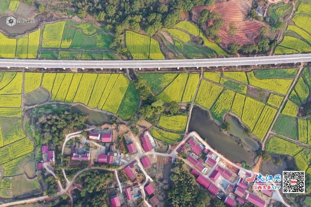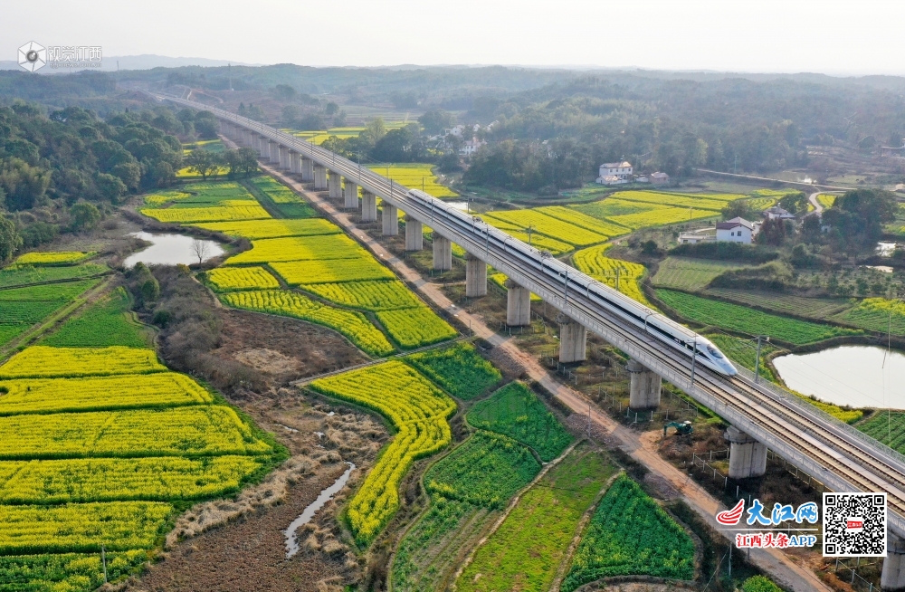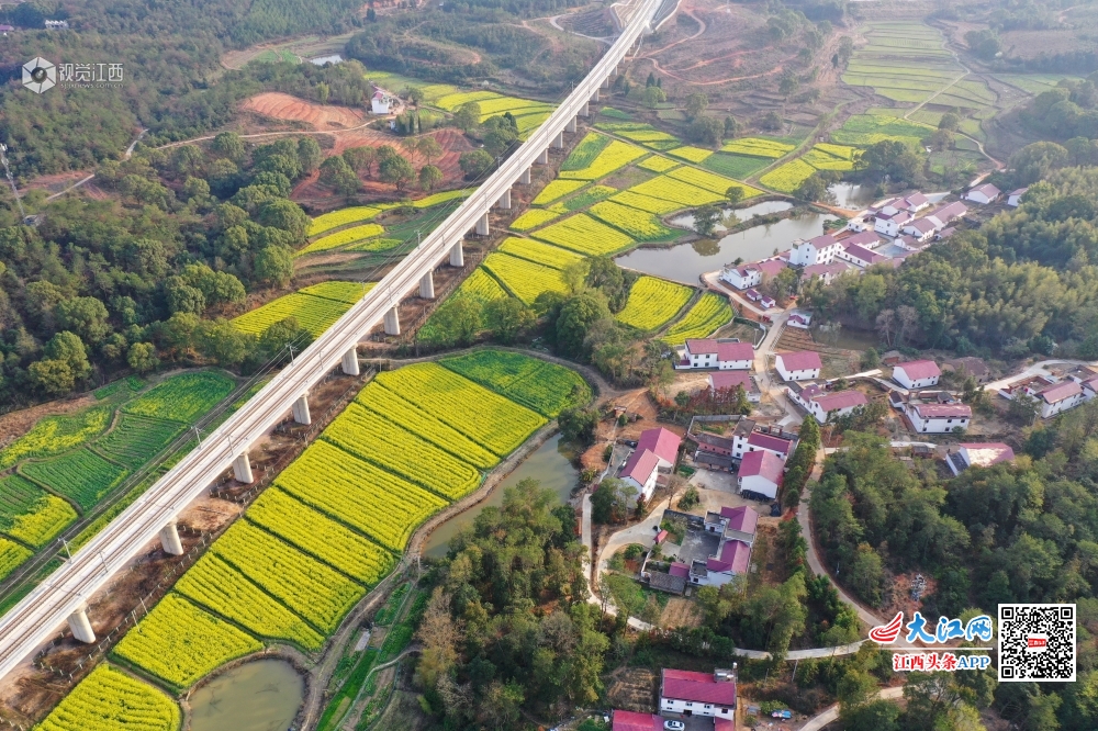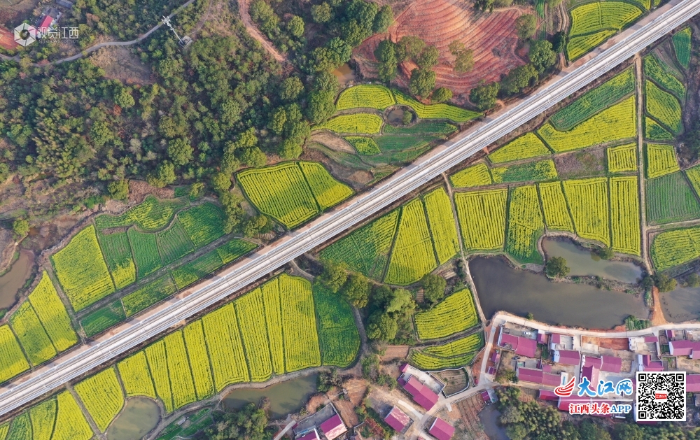 春日时节,江西省万安县十余万亩油菜花竞相绽放,驰骋的高铁列车与村庄、田园构成一幅美丽的乡村画卷。