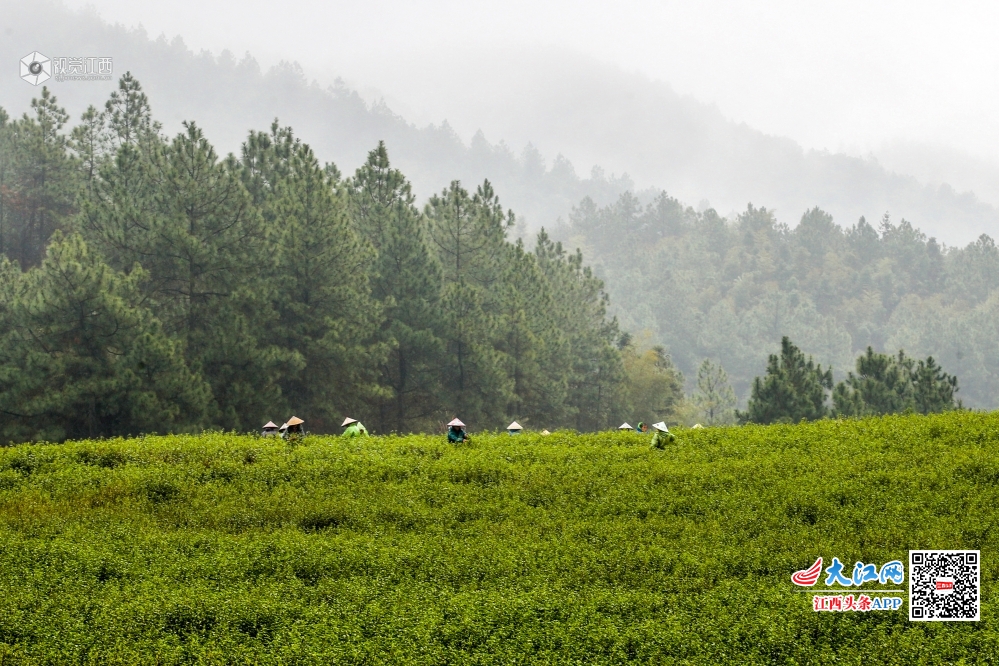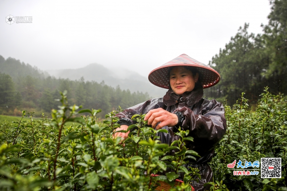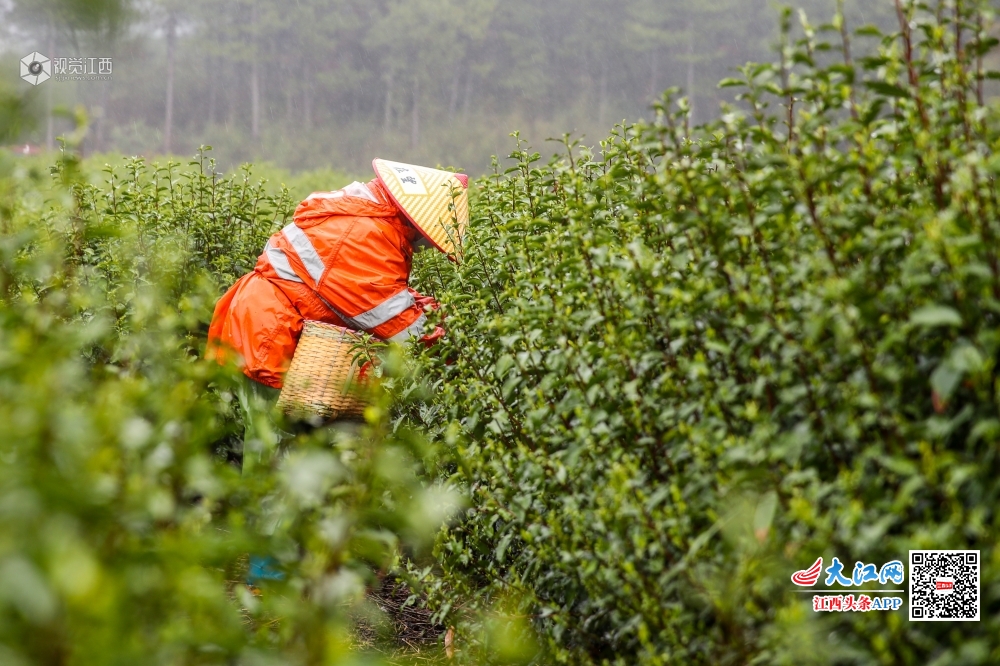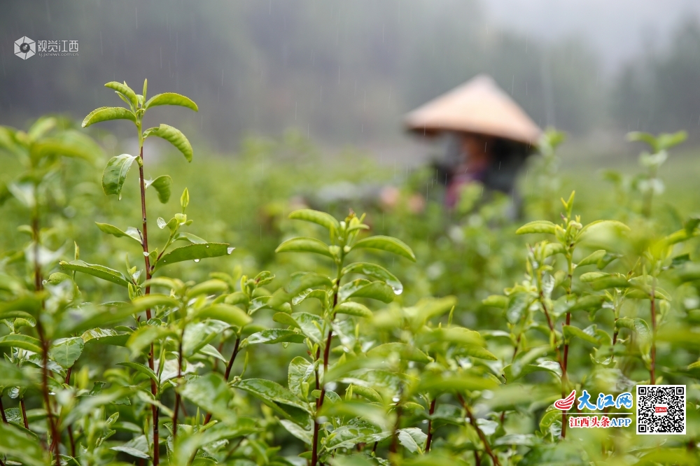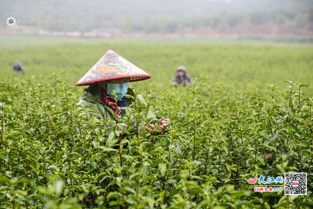3月3日,在江西省峡江县水边镇产业扶贫基地,复工的采茶女在冒雨抢摘春茶嫩芽。惊蛰临近,峡江县产业扶贫基地的早春茶抽出嫩芽,陆续进入采摘期。该县在做好疫情防控的同时,有序组织采茶女复工抢摘第一批春茶。
