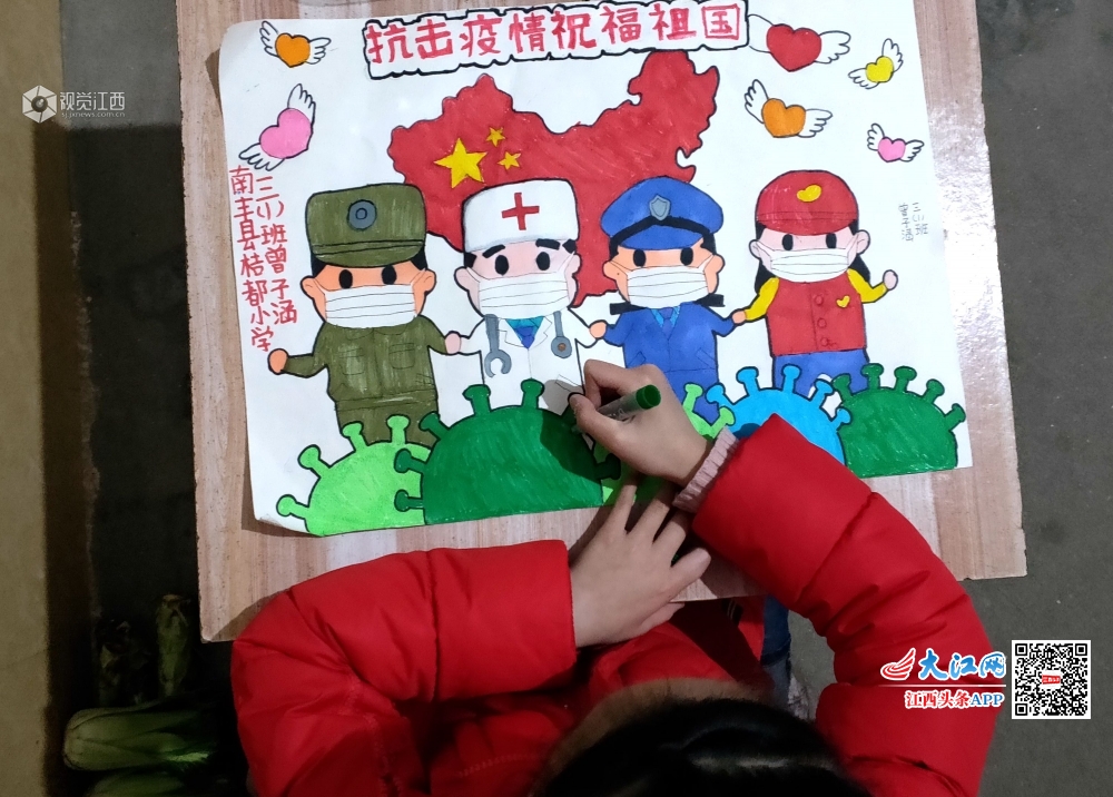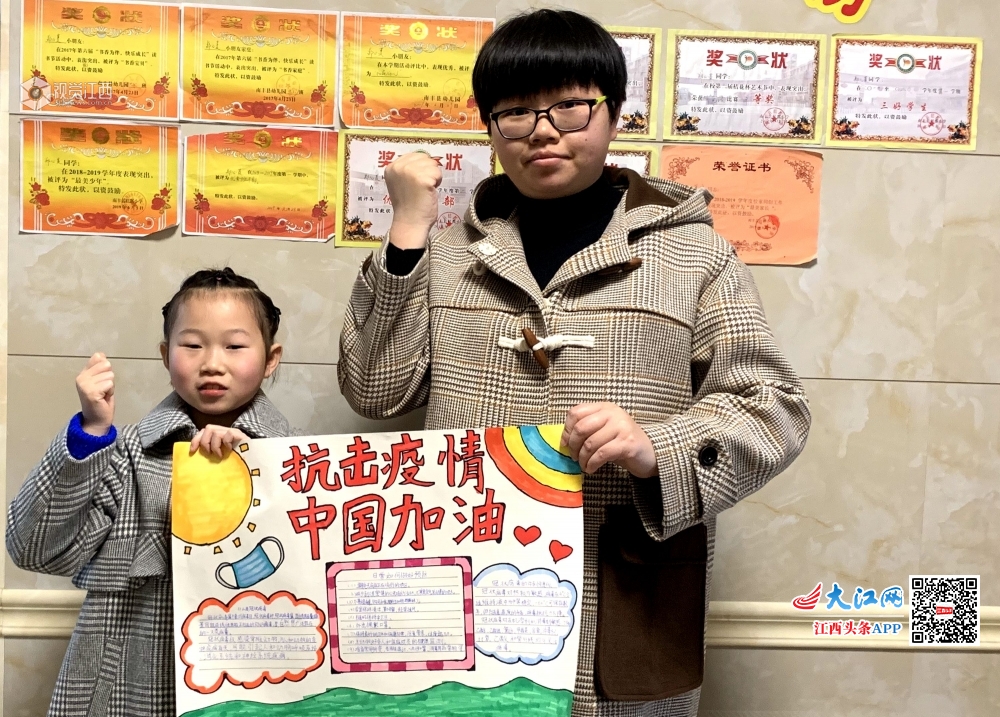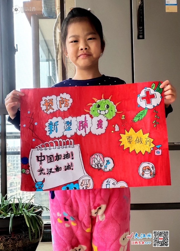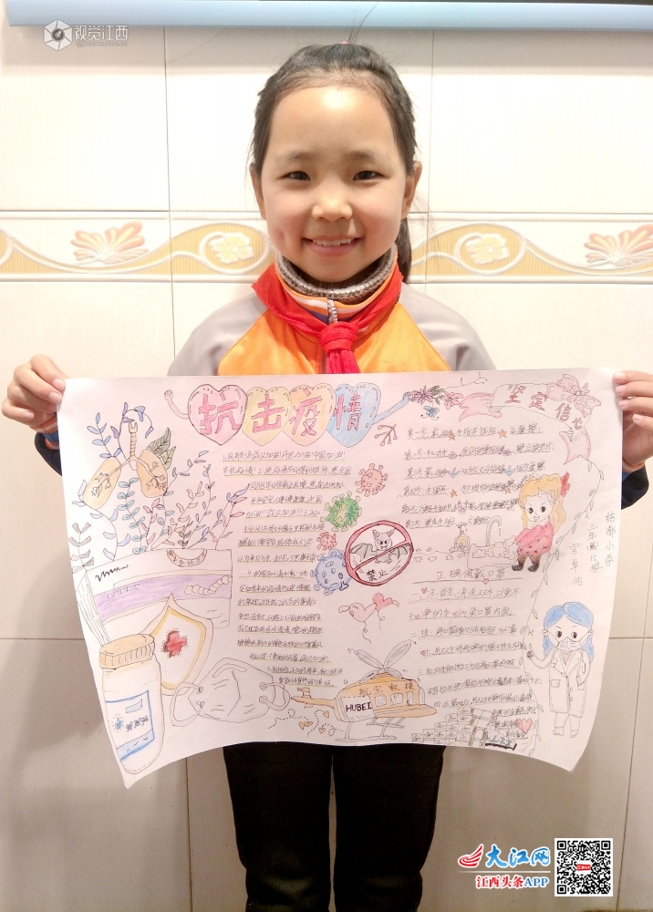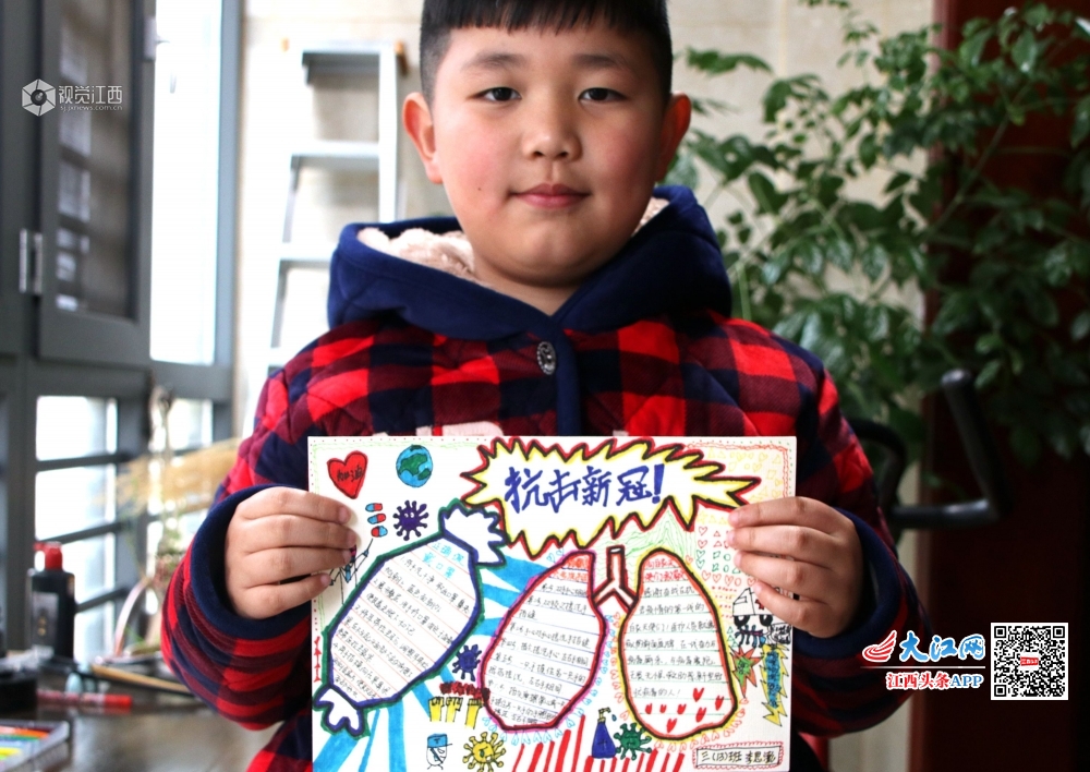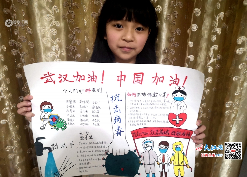 2020年3月3日,江西省南丰县的小学生在家中制作并展示自己创作的“抗击疫情”手抄报,他们用小小的画笔,绘制了一幅幅生动活泼的宣传画,为武汉助力,为中国加油。