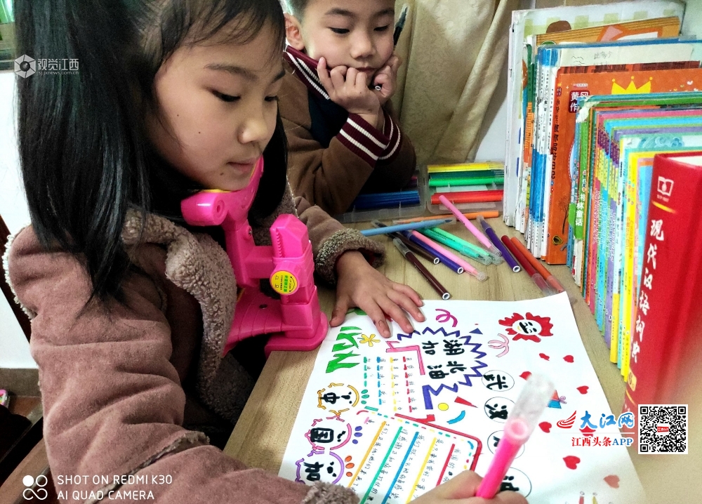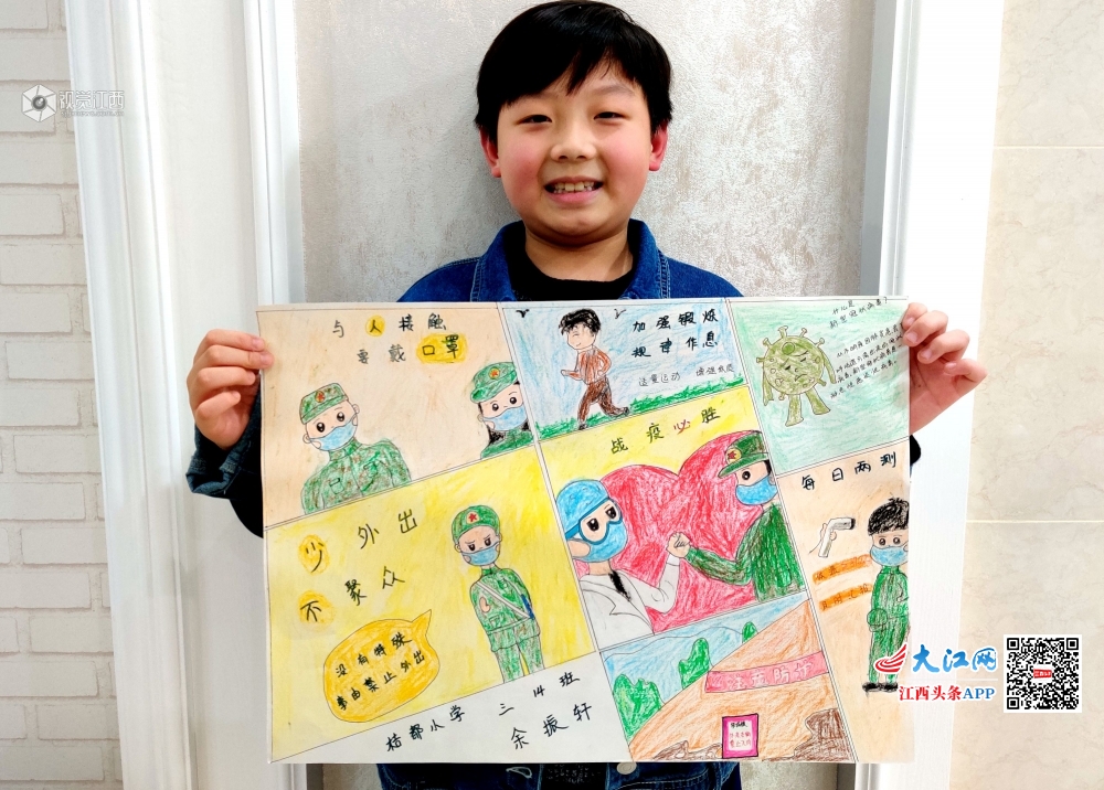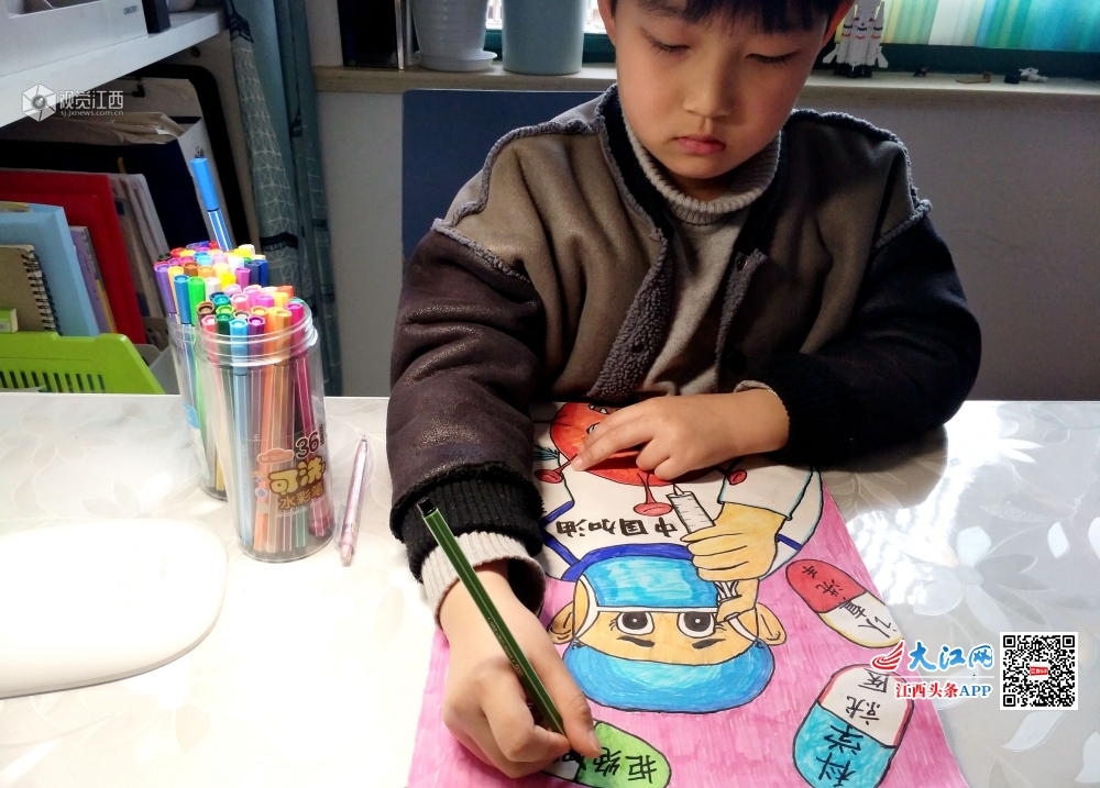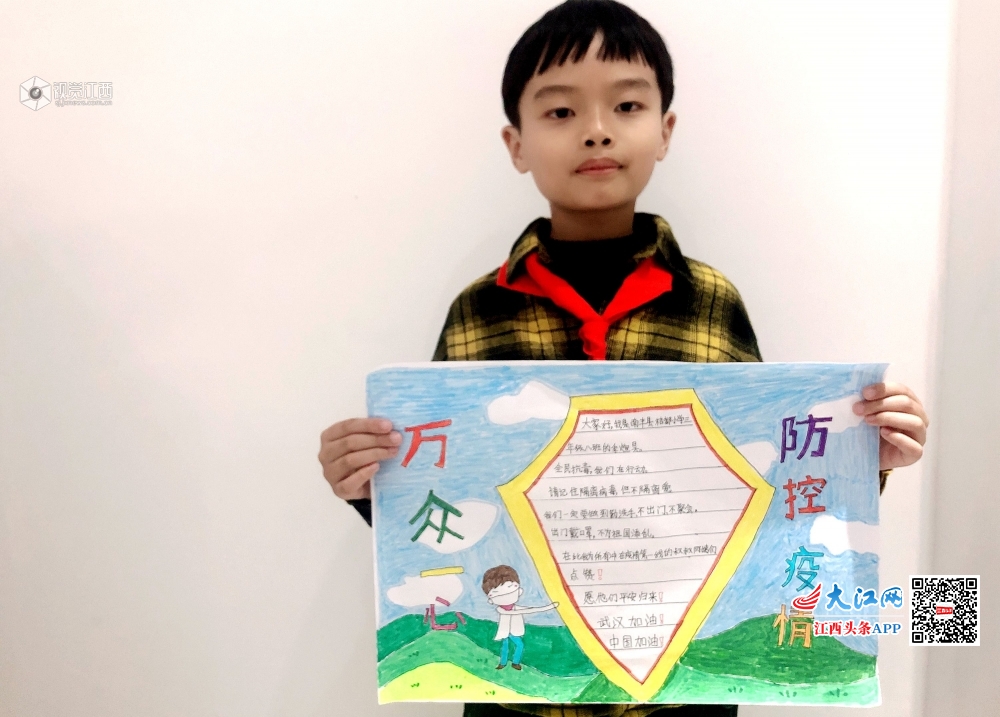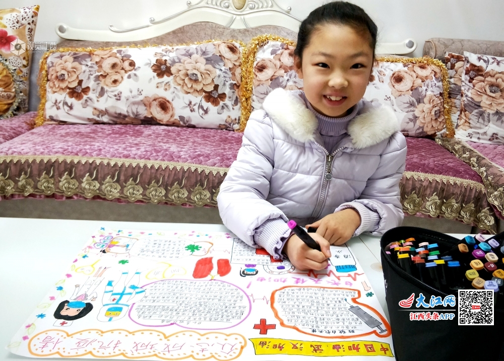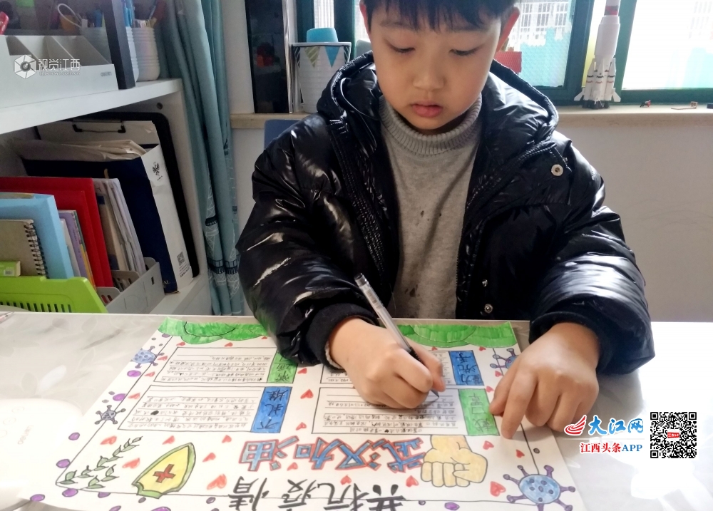 2020年3月3日,江西省南丰县的小学生在家中制作并展示自己创作的“抗击疫情”手抄报,他们用小小的画笔,绘制了一幅幅生动活泼的宣传画,为武汉助力,为中国加油。