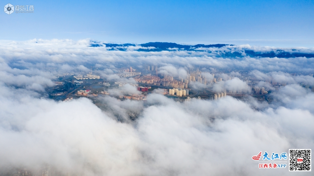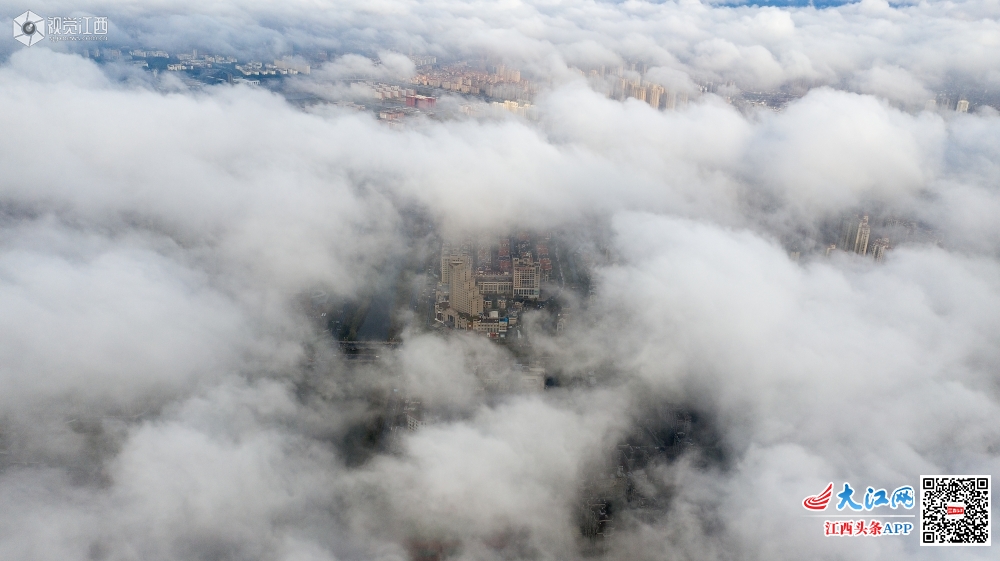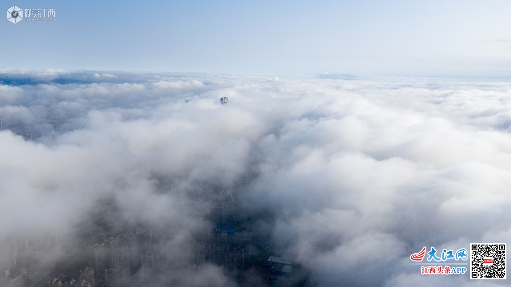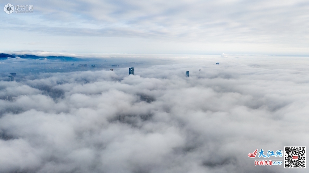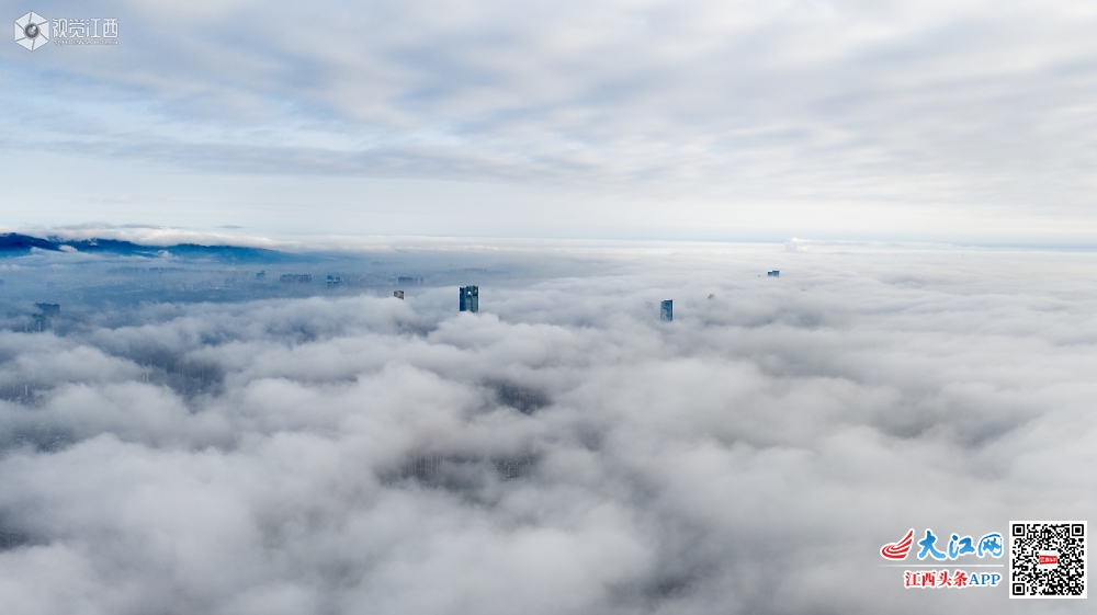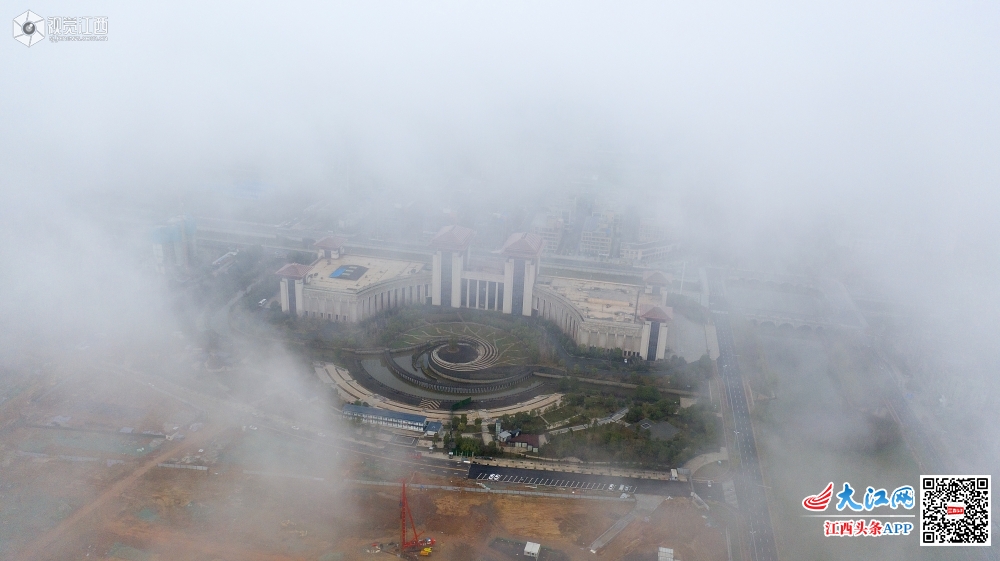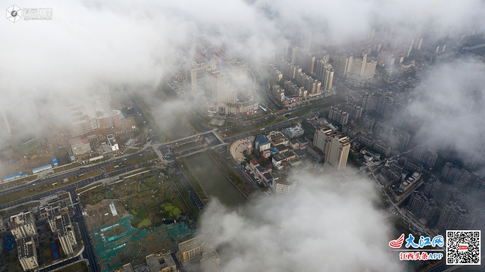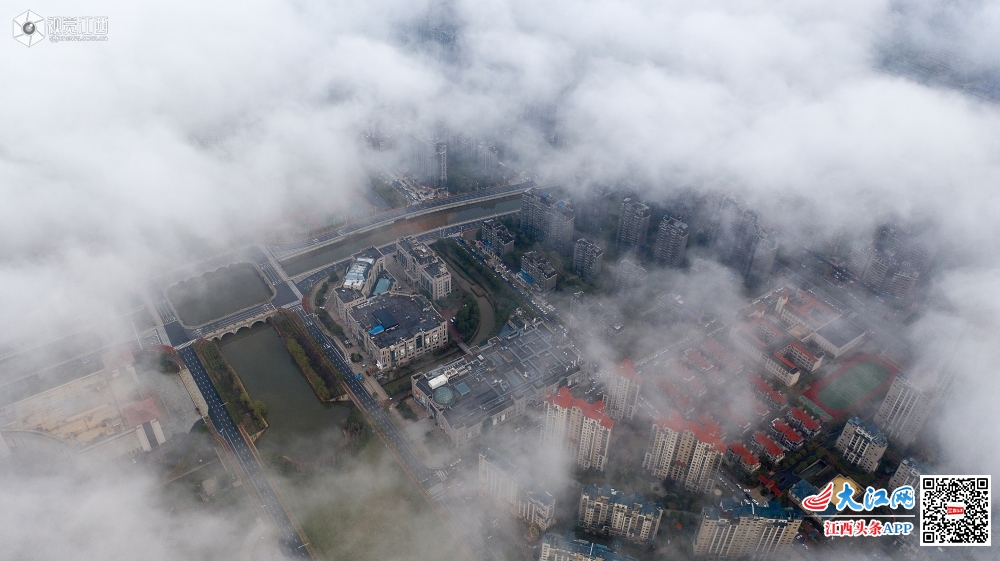 2020年3月7日,江西省南昌市出现平流雾天气,图为红谷滩新区摩天轮上空航拍,云端下的城市时隐时现仿佛是空中之城。