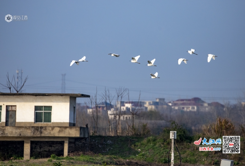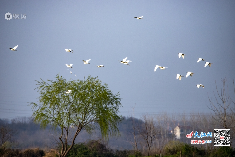 2020年3月7日,江西省九江市湖口县均桥镇境内成百上千只鹭鸟在青山绿水间自由翱翔,成了春天一道靓丽的风景。在蓝天白云下,一群白鹭时而群起掠过水面,时而在水岸闲庭信步,有的在青翠的水草上漫舞,有的在追逐嬉戏,悠然自得,神情怡然。