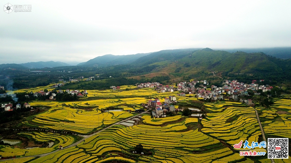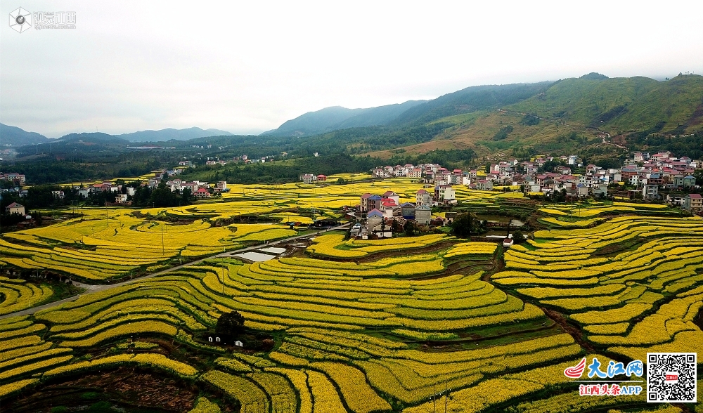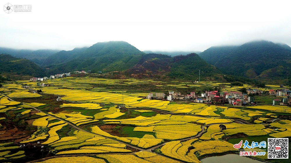 3月8日,无人机航拍下的江西省莲花县南岭乡岭水村3000多亩梯田的油菜花尽情绽放,金黄的油菜花、弥漫着雾气的山峦以及白墙红瓦的民居,构成一幅美丽的乡村画卷。