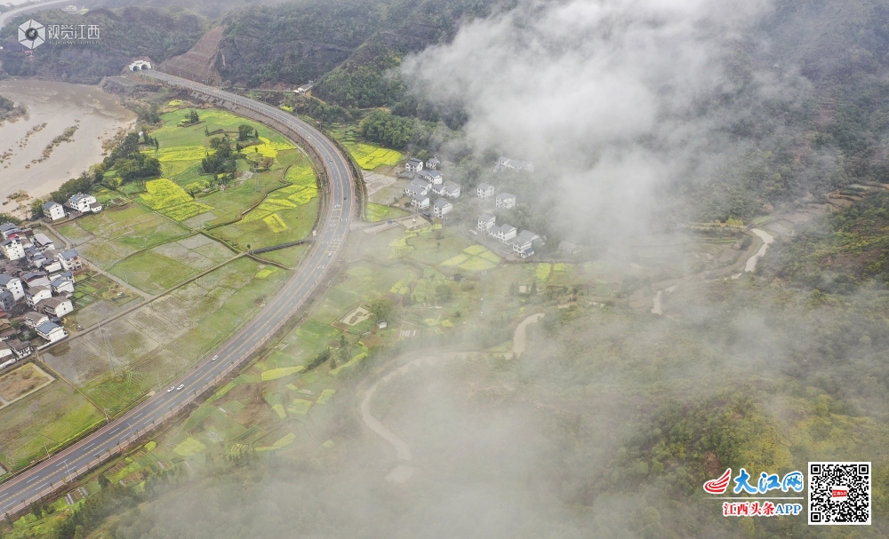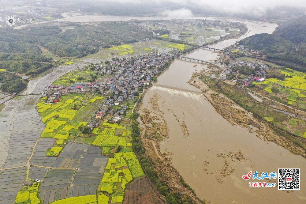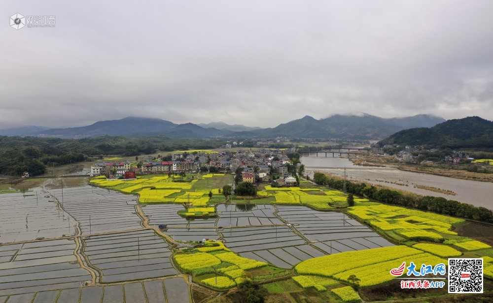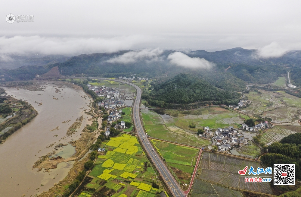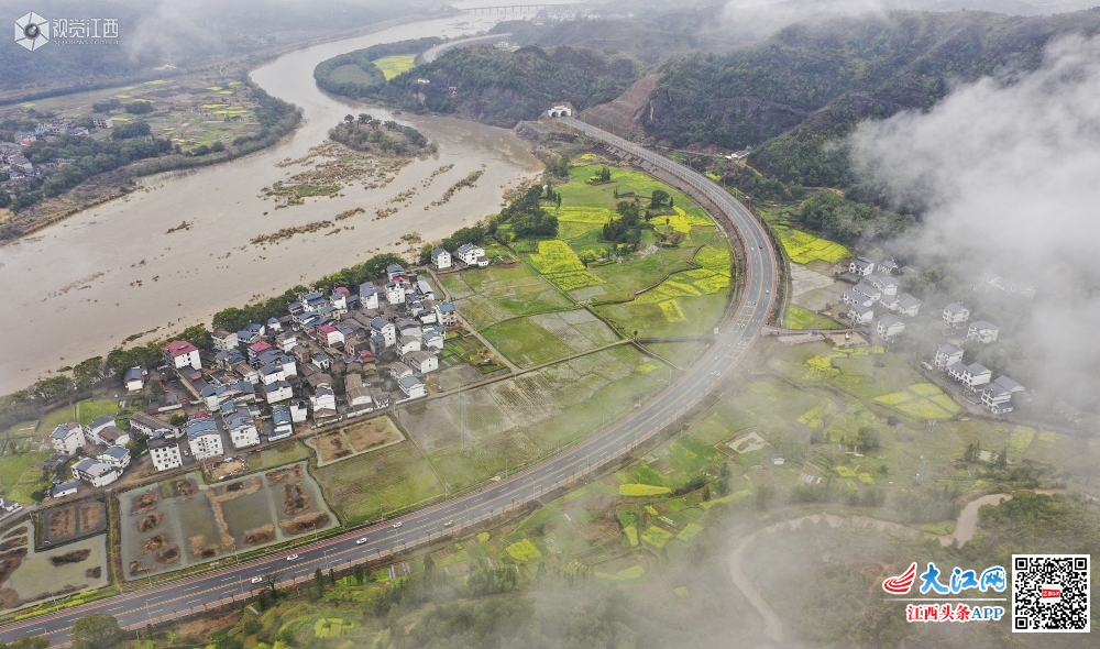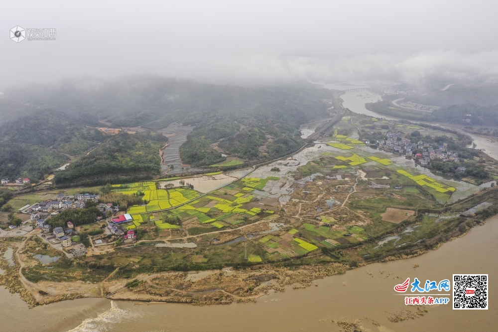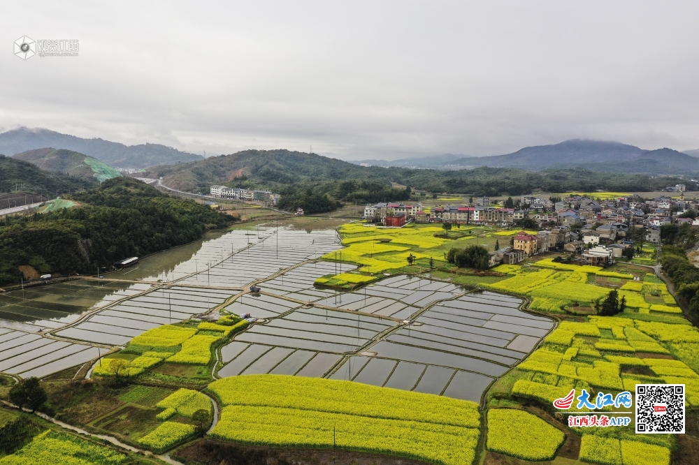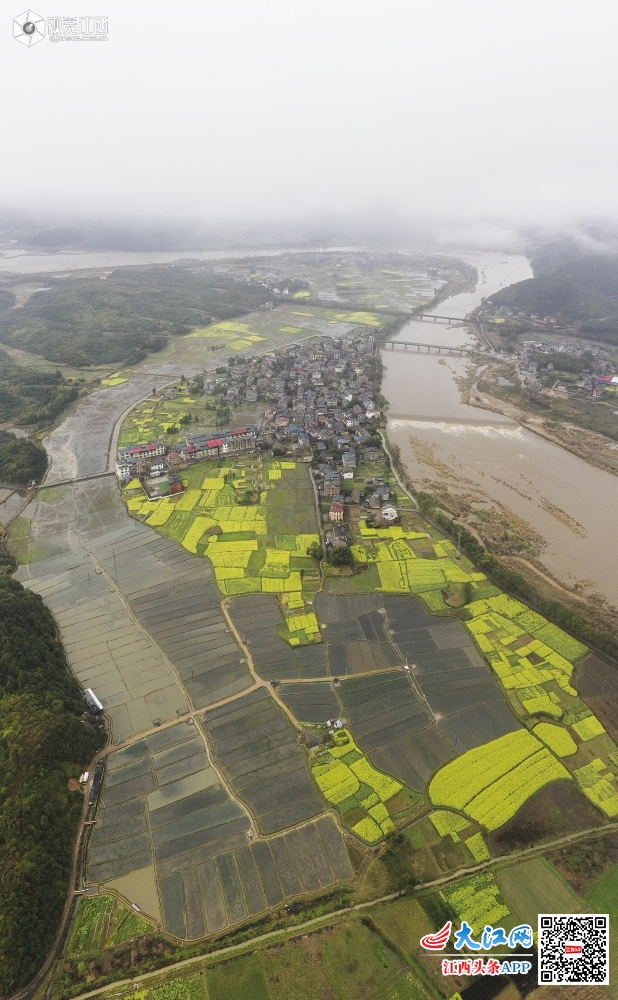 2020年3月9日,航拍雨后江西省上饶市铅山县永平镇安洲村油菜花,雨后的乡间田野在油菜花的点缀下,与白墙黛瓦的民居相映,构成一幅幅美丽的春色画卷。