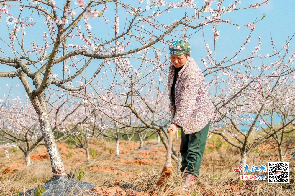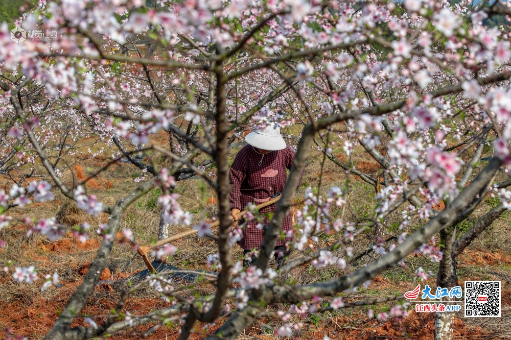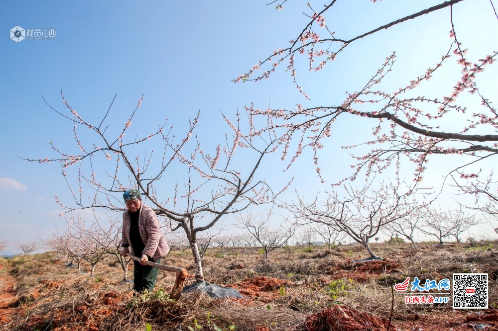 近日,江西省吉安市峡江县水边镇产业扶贫基地的200亩桃花陆续盛开,农民在做好防疫工作的同时,忙着为桃树除草、疏花、杀虫、施肥,桃花与农民忙碌的身影,构成春天里的一幅美丽图画。
