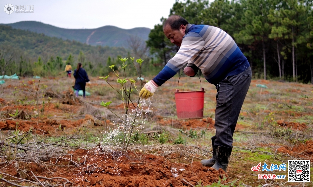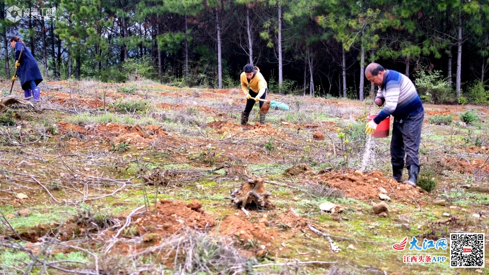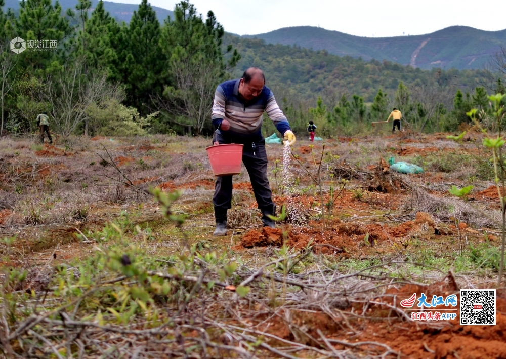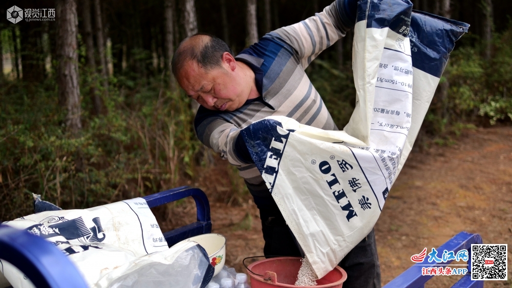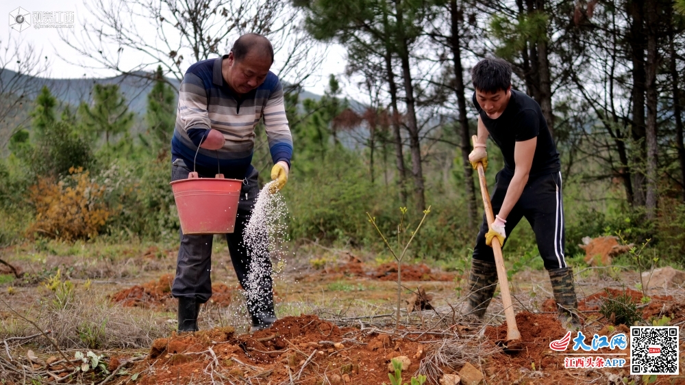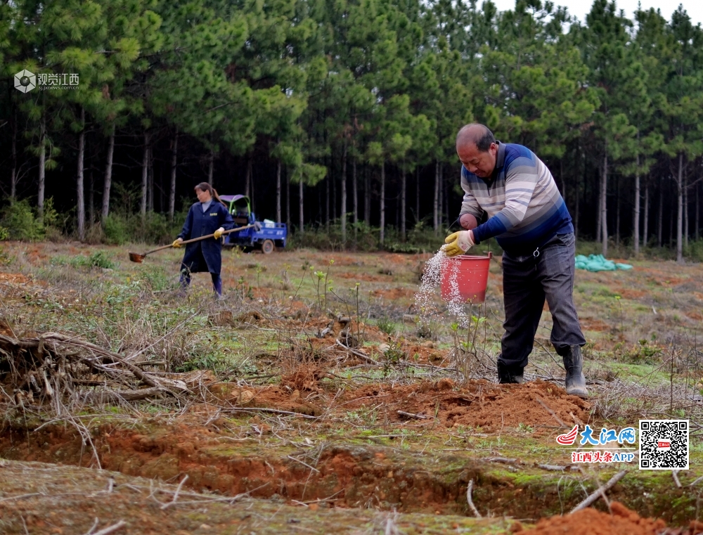 2020年3月11日,在江西省永丰县古县镇郭宇林智富农场,郭宇林和家人正在基地紧张忙碌,给吴茱萸追肥。