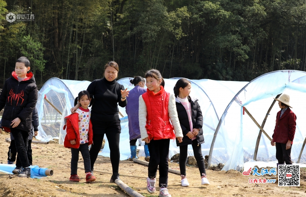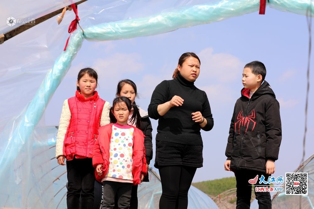 2020年3月10日,江西省分宜县操场乡太湖村“童伴妈妈”张青花在该村扶贫产业西瓜基地给留守儿童上一堂西瓜是怎么长出来的自然课。