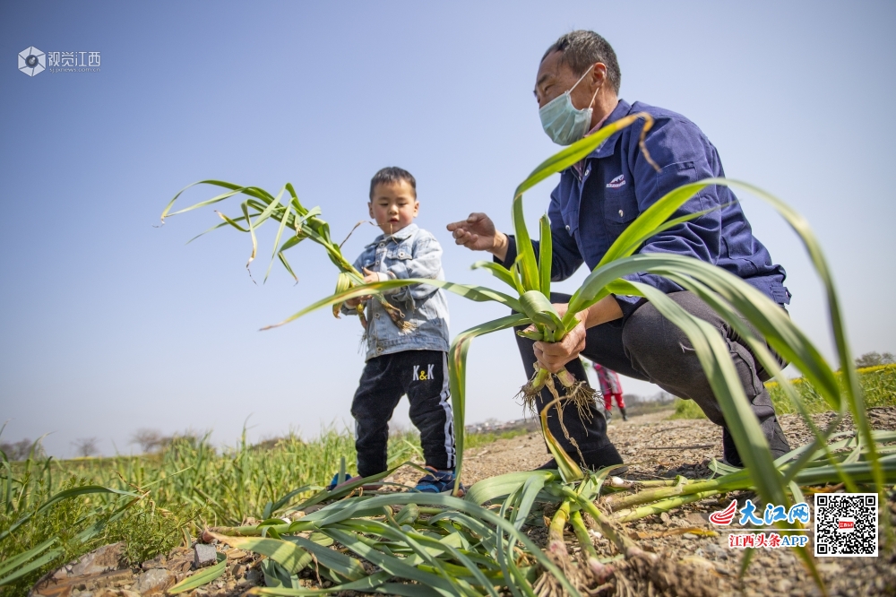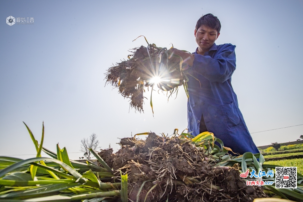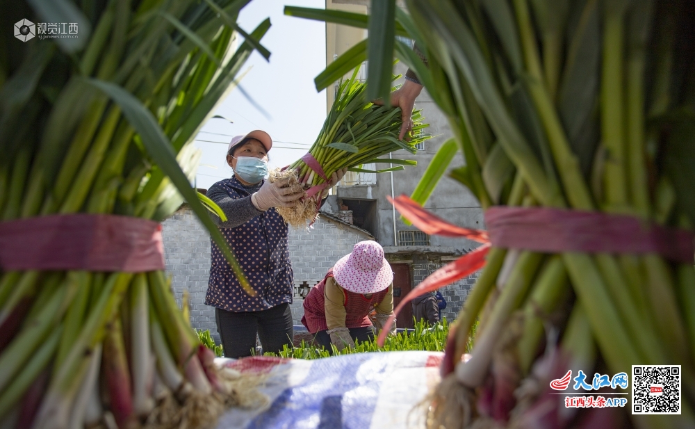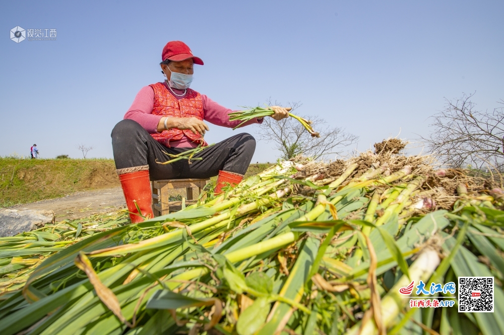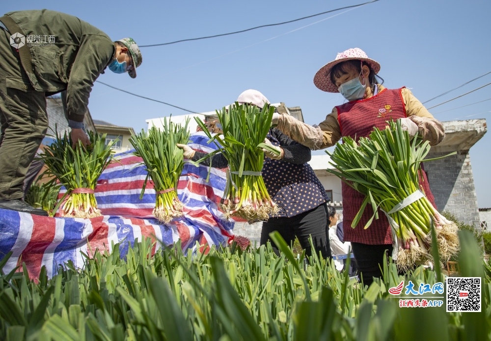 2020年3月15日,江西省九江市湖口县大垅乡产业扶贫基地400余亩大蒜采收销售忙。眼下正是大蒜丰收时节,在做好疫情防控的同时,当地组织指导农户有序开展大蒜采收和销售,通过网络线上销售搭建起扶贫产业与外界联通的桥梁,助推脱贫攻坚和乡村振兴。