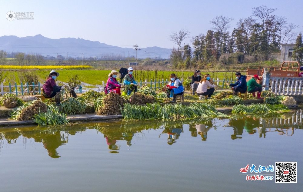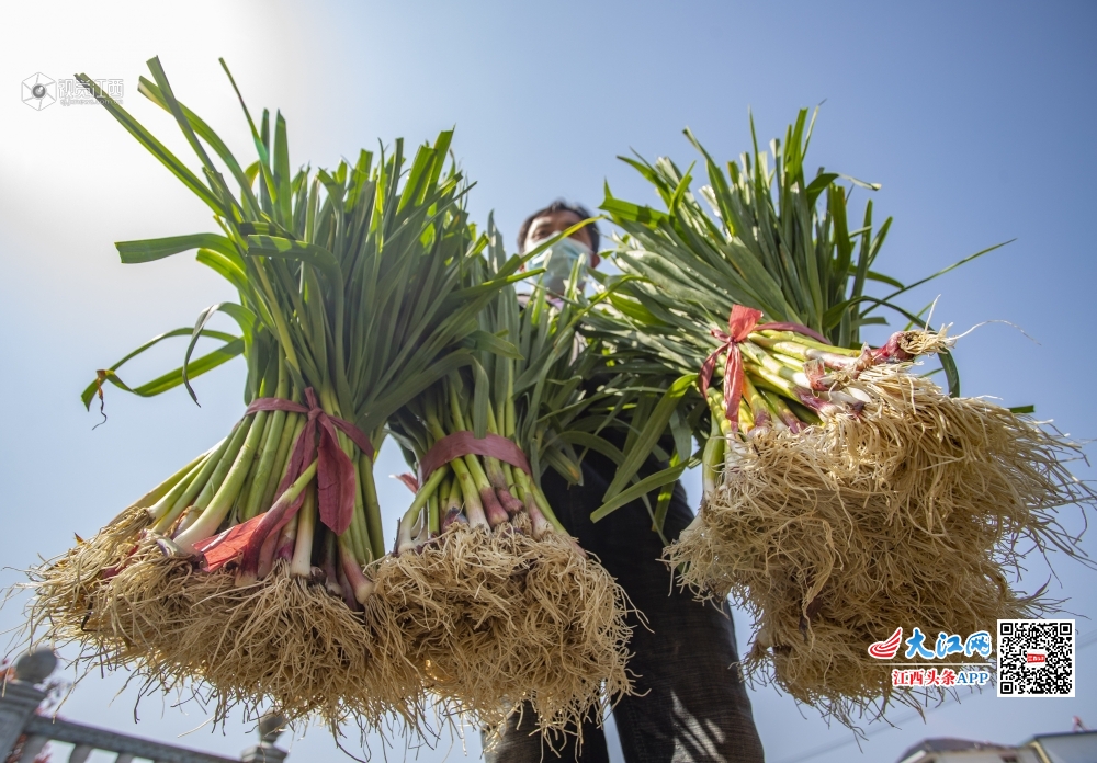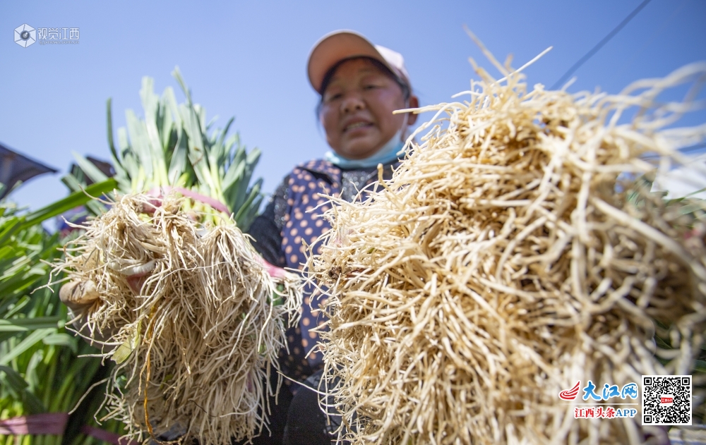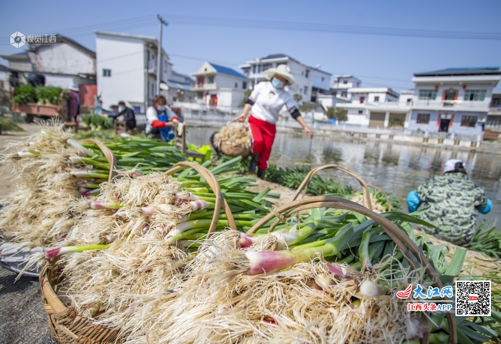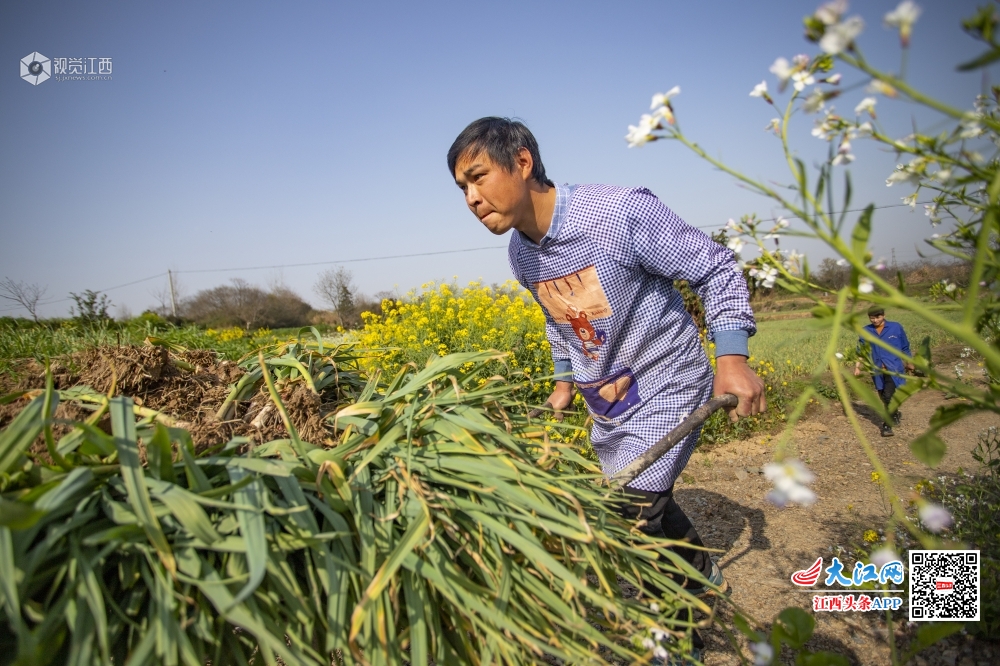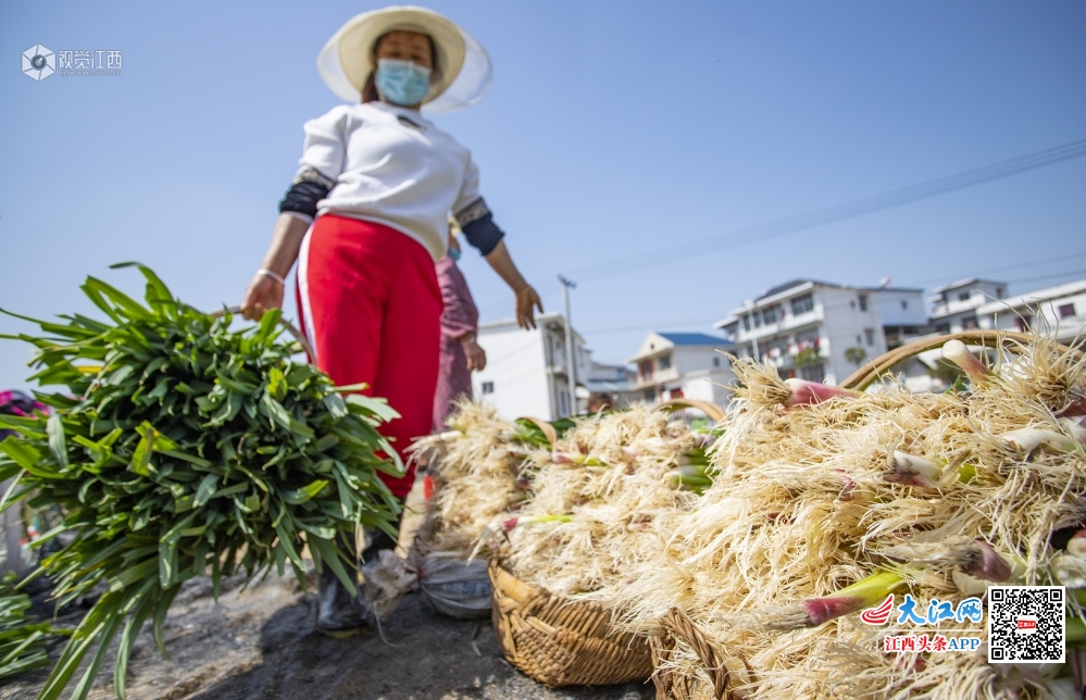 2020年3月15日,江西省九江市湖口县大垅乡产业扶贫基地400余亩大蒜采收销售忙。眼下正是大蒜丰收时节,在做好疫情防控的同时,当地组织指导农户有序开展大蒜采收和销售,通过网络线上销售搭建起扶贫产业与外界联通的桥梁,助推脱贫攻坚和乡村振兴。