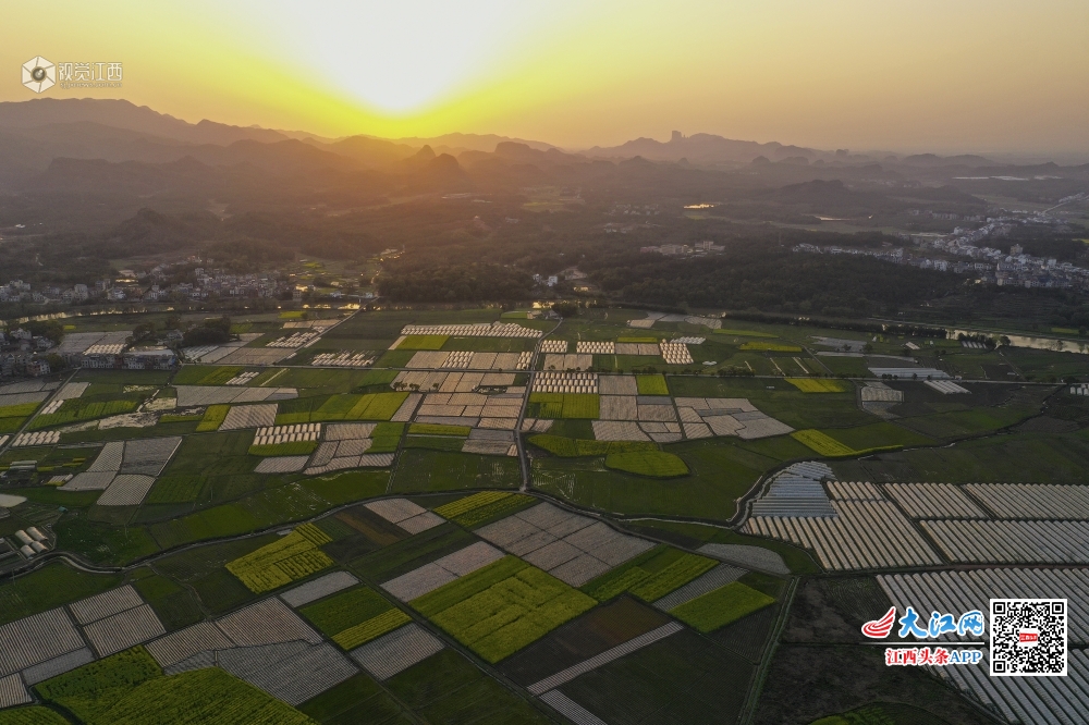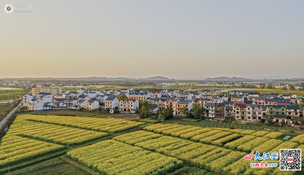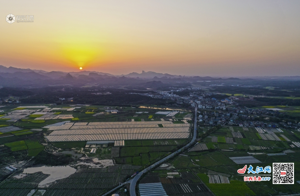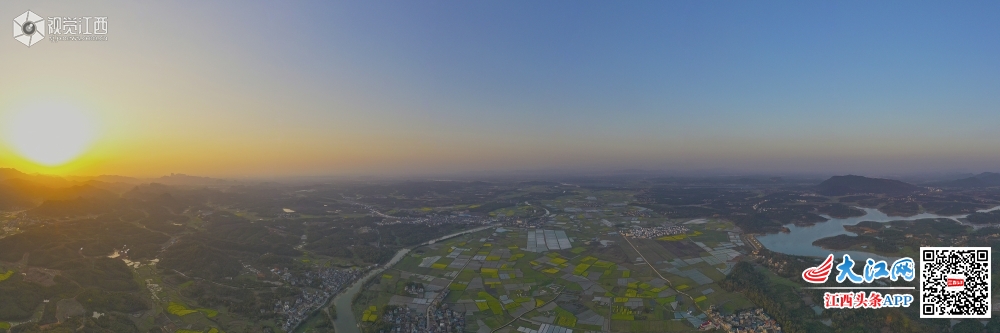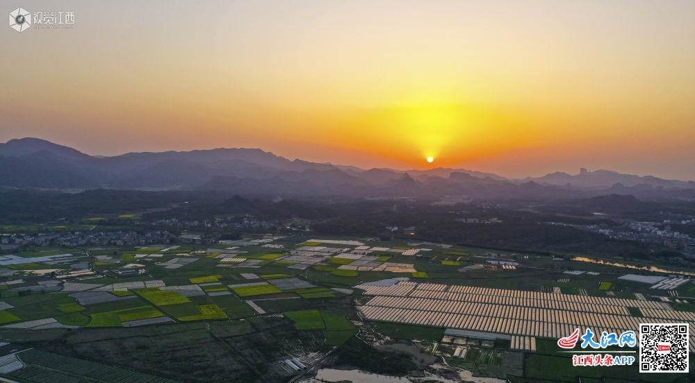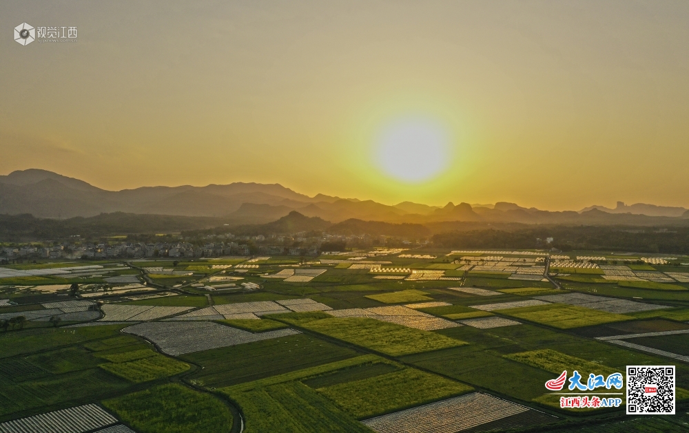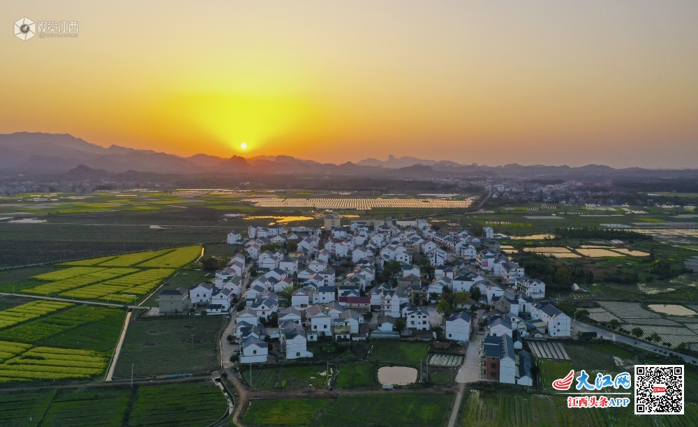 2020年3月14日,航拍江西省上饶市铅山县汪二镇火田村落日,油菜花田和民居在落日余晖下,显得格外迷人。随着气温逐渐升高,铅山境内的油菜花竞相绽放,油菜花田、粉墙黛瓦的民居与远处的山峦,在落日余晖映照下,一幅美丽的春光画卷展现在眼前。