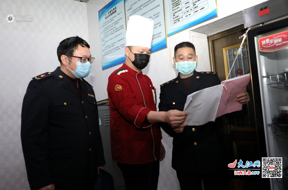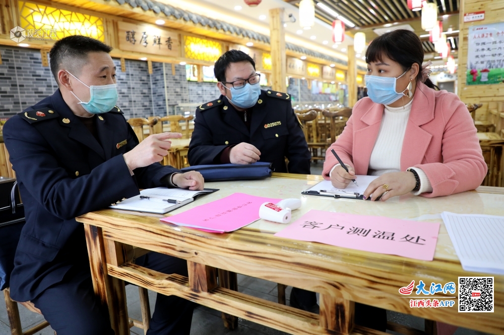 2020年3月17日,在江西省吉安市永丰县,当地市场监管局执法人员正在对复工营业餐馆进行专项检查,确保顾客就餐安全。