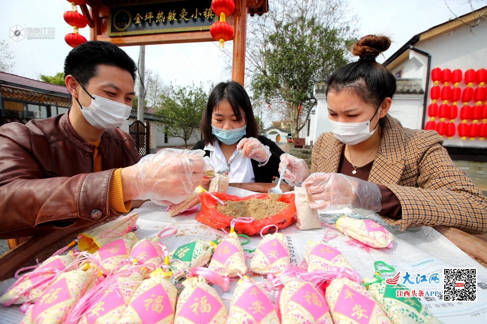 2020年3月19日,在江西省吉安市峡江县金坪热敏灸小镇,村民在制作中药香囊。