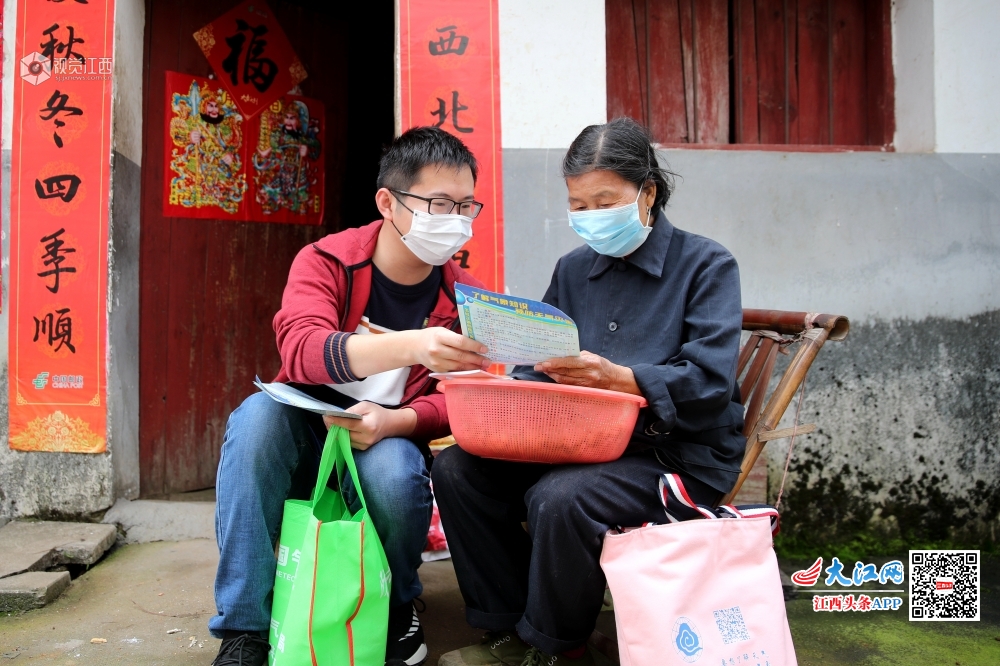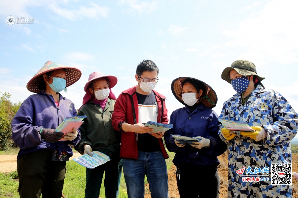 2020年3月20日,在江西省吉安市峡江县金坪民族乡金坪村,该县气象局工作人员在向村民讲解气象知识。