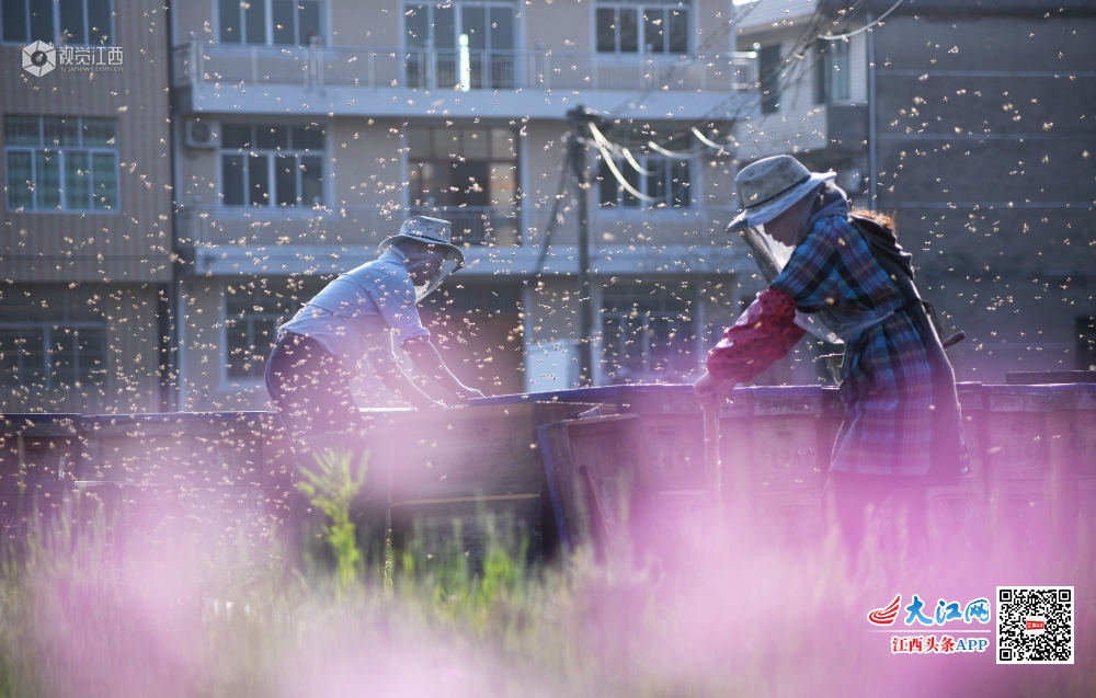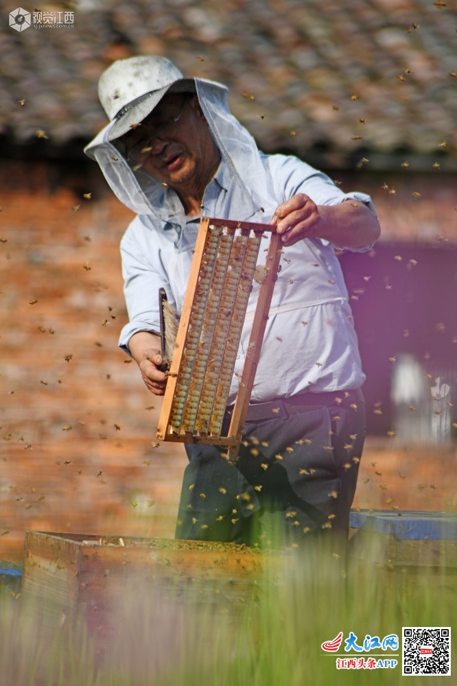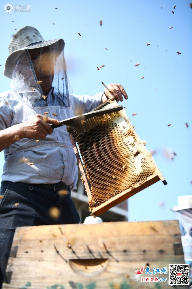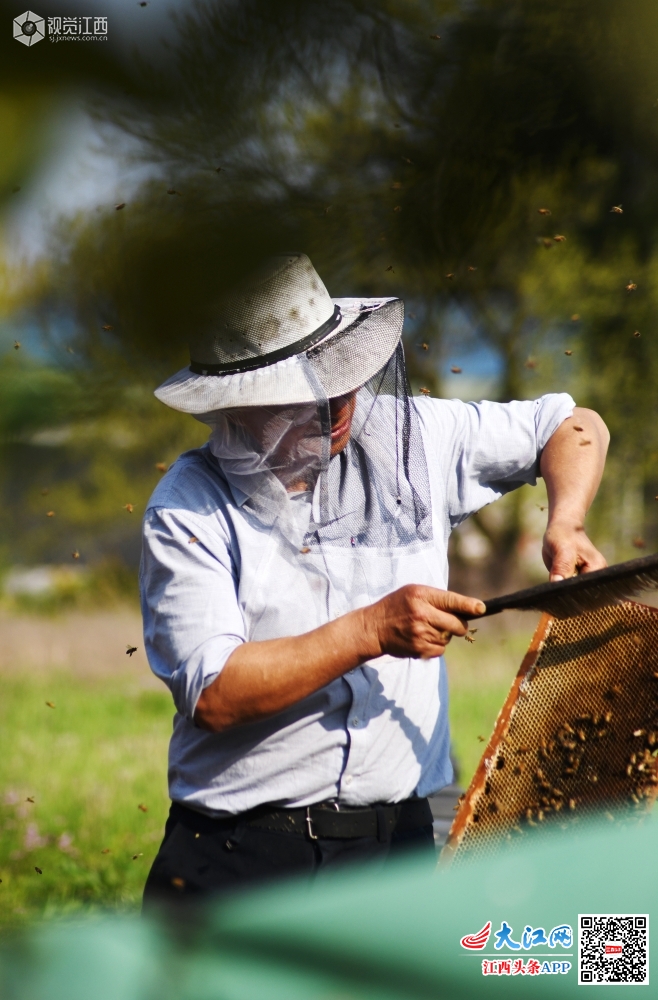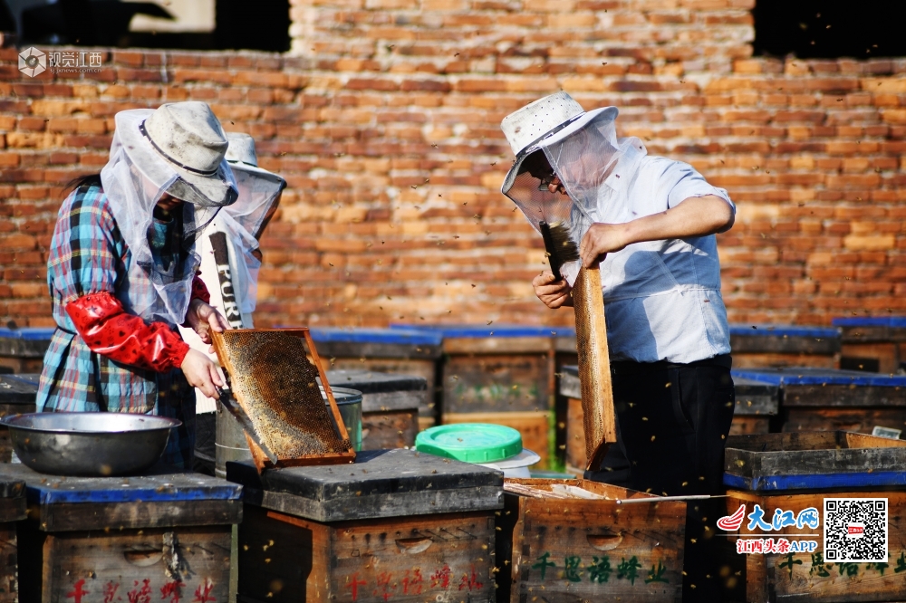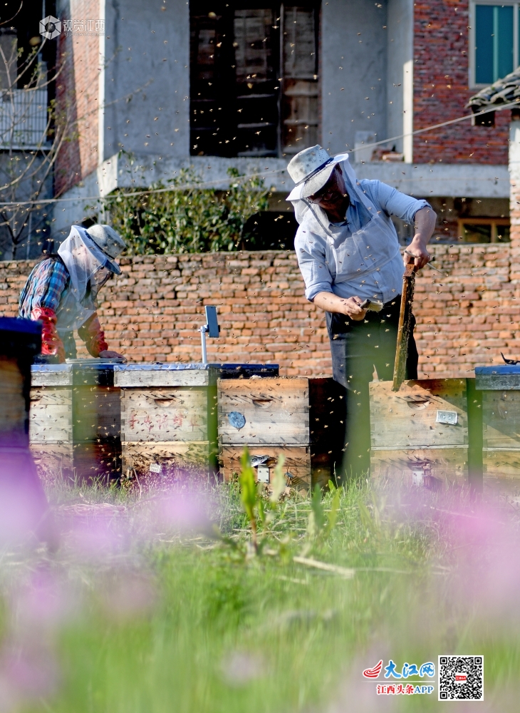 2020年3月19日,江西省上饶市铅山县青溪服务中心后洲村,养蜂人正在取蜜。近年来,铅山县充分发挥各地特色,发展特色产业带动贫困户脱贫。铅山县康信蜂业专业合作社共吸纳43户约150名贫困户入社,蜂蜜、蜂花粉、蜂胶、蜂皇浆等蜂产品年产量达400多吨,实现营业额几千万元,实现贫困户每户增收800元。